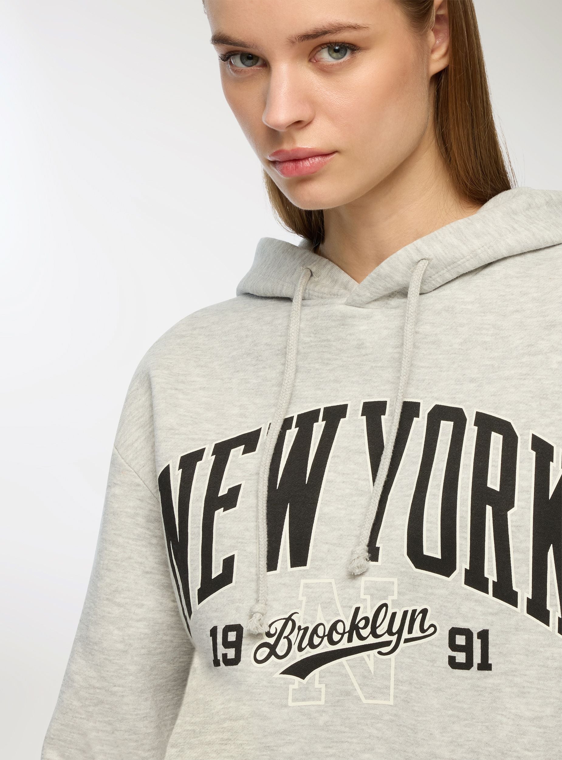 Felpa pesante da donna con cappuccio regolabile con coulisse e stampa in stile college americano sul davanti. Il modello cropped con fondo e polsi a costine valorizza la silhouette e dona un tocco sportivo al look. Ideale per affrontare le giornate più fredde con stile e comfort. Perfetta con jeans, joggers o leggings per outfit casual d’ispirazione urban, comodi e di tendenza.Dettagli