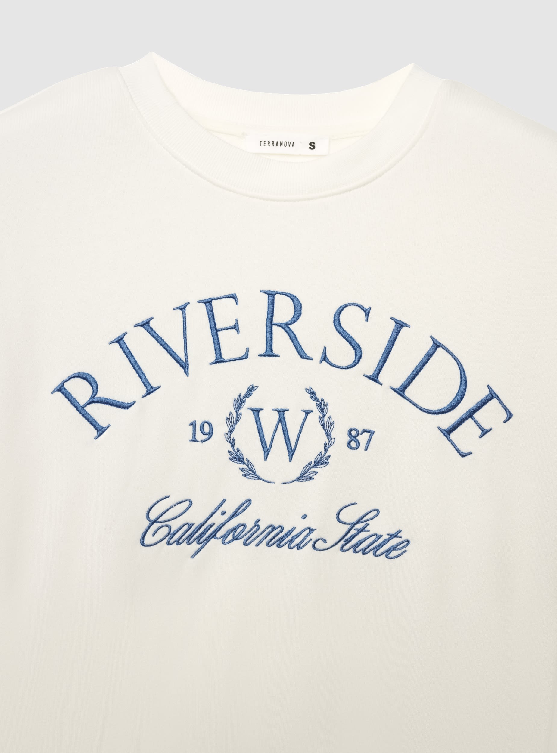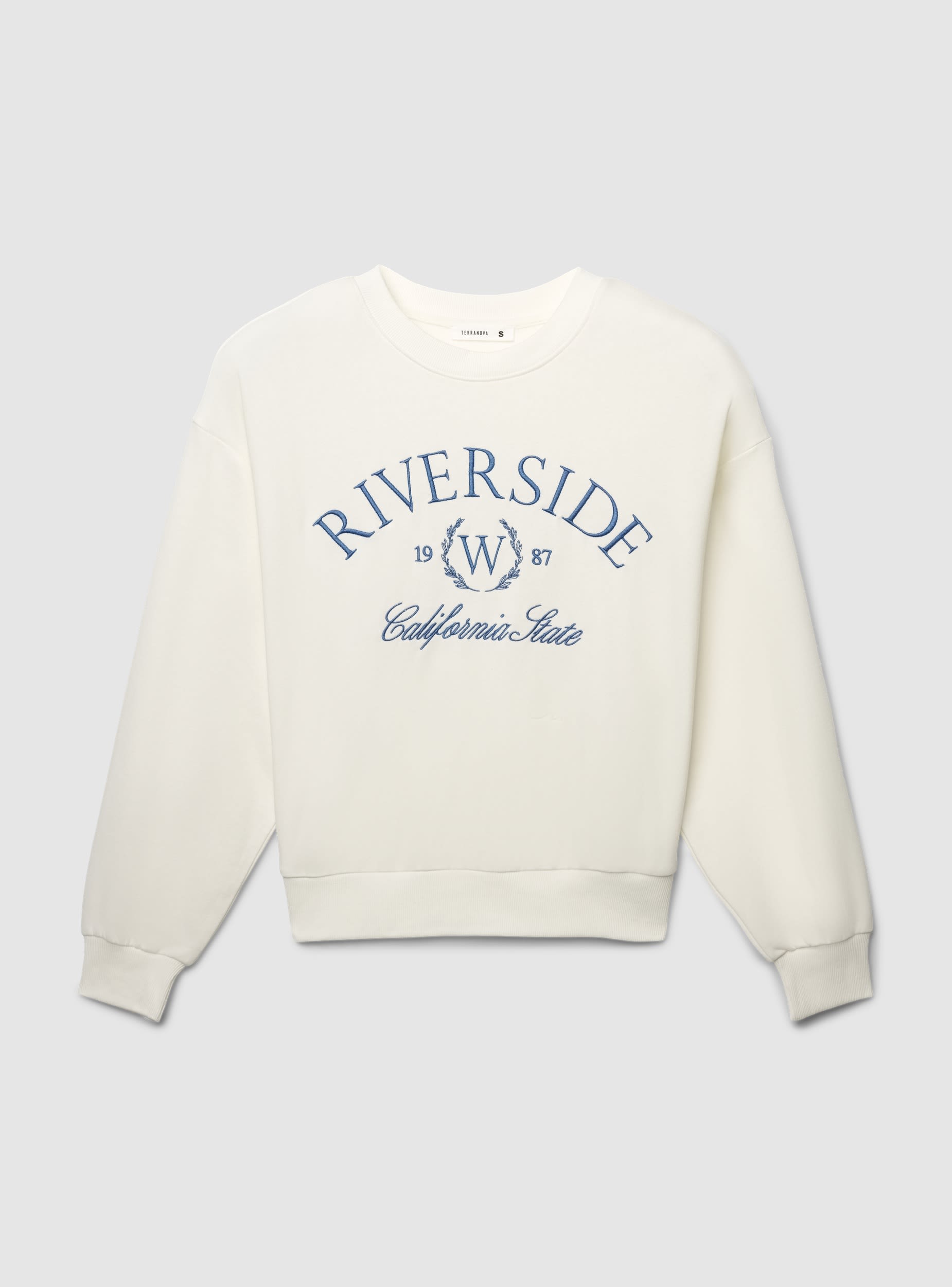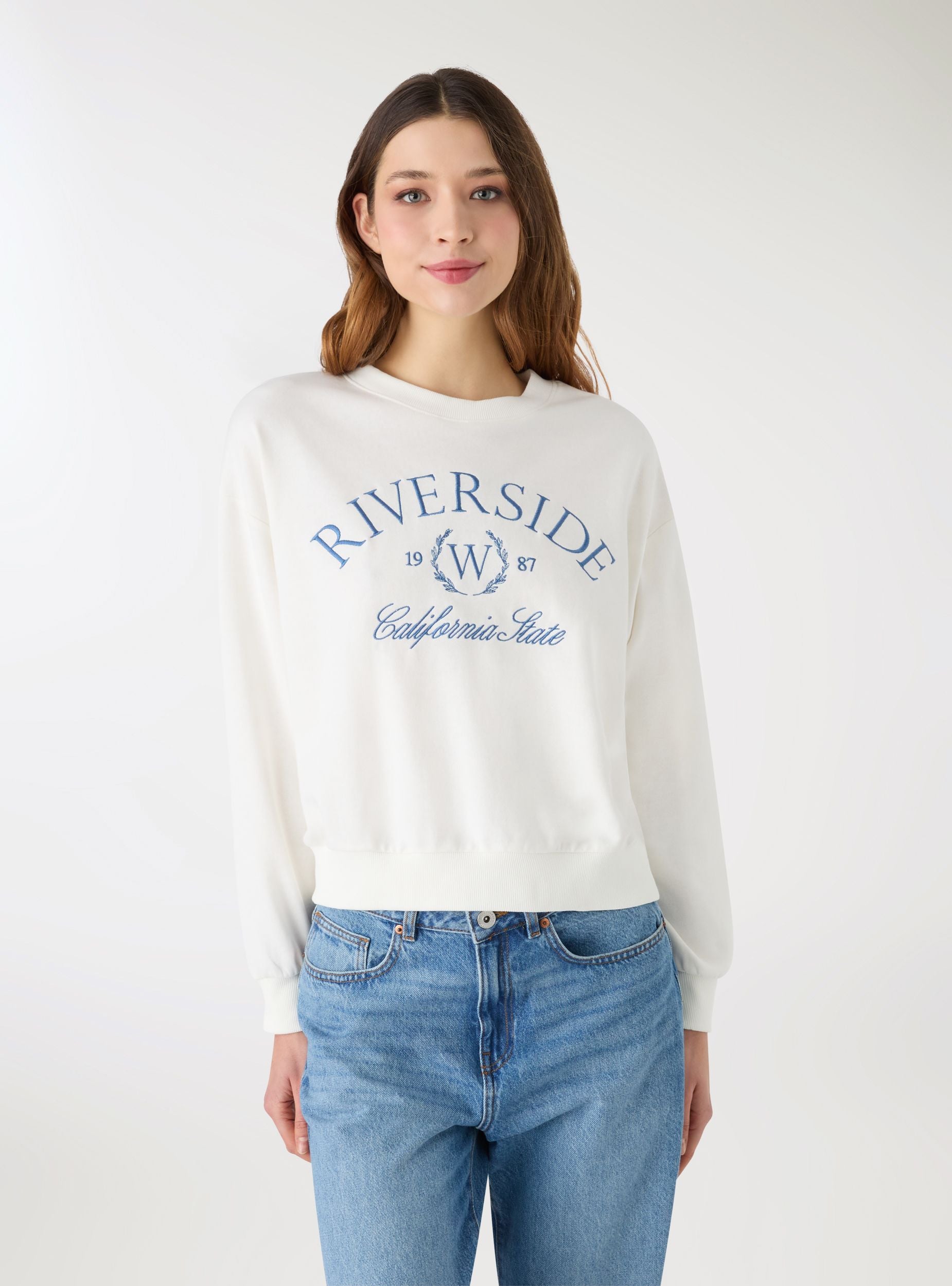 Felpa da donna senza cappuccio, con girocollo e vestibilità ampia. Presenta ricamo frontale stile college con scritta, polsini e fondo a costine. Perfetta per look casual e urban, si abbina a jeans, pantaloni jogger o una gonna midi per un tocco sporty. Senza zip, ideale per il tempo libero e le giornate di relax.Dettagli