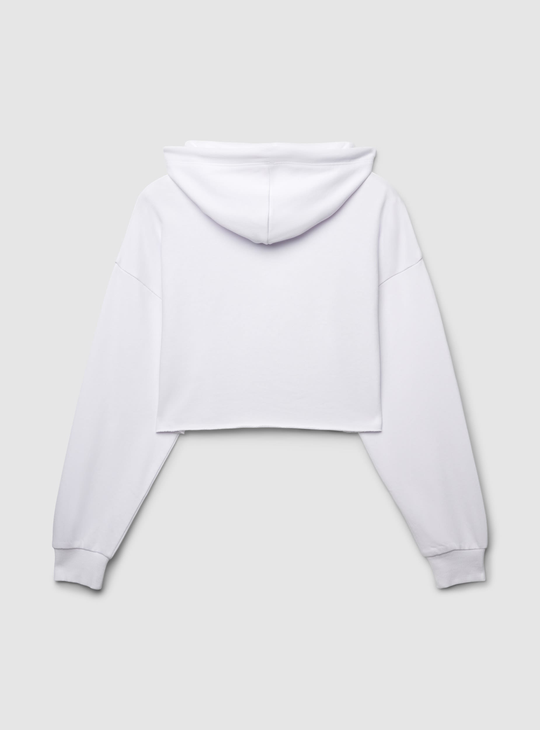 Felpa da donna con cappuccio, modello crop e orlo tagliato a vivo. Presenta stampa college frontale con scritta, maniche lunghe con polsini a coste per una vestibilità confortevole. Ideale per il tempo libero o per look urban con jeans a vita alta o joggers.Dettagli