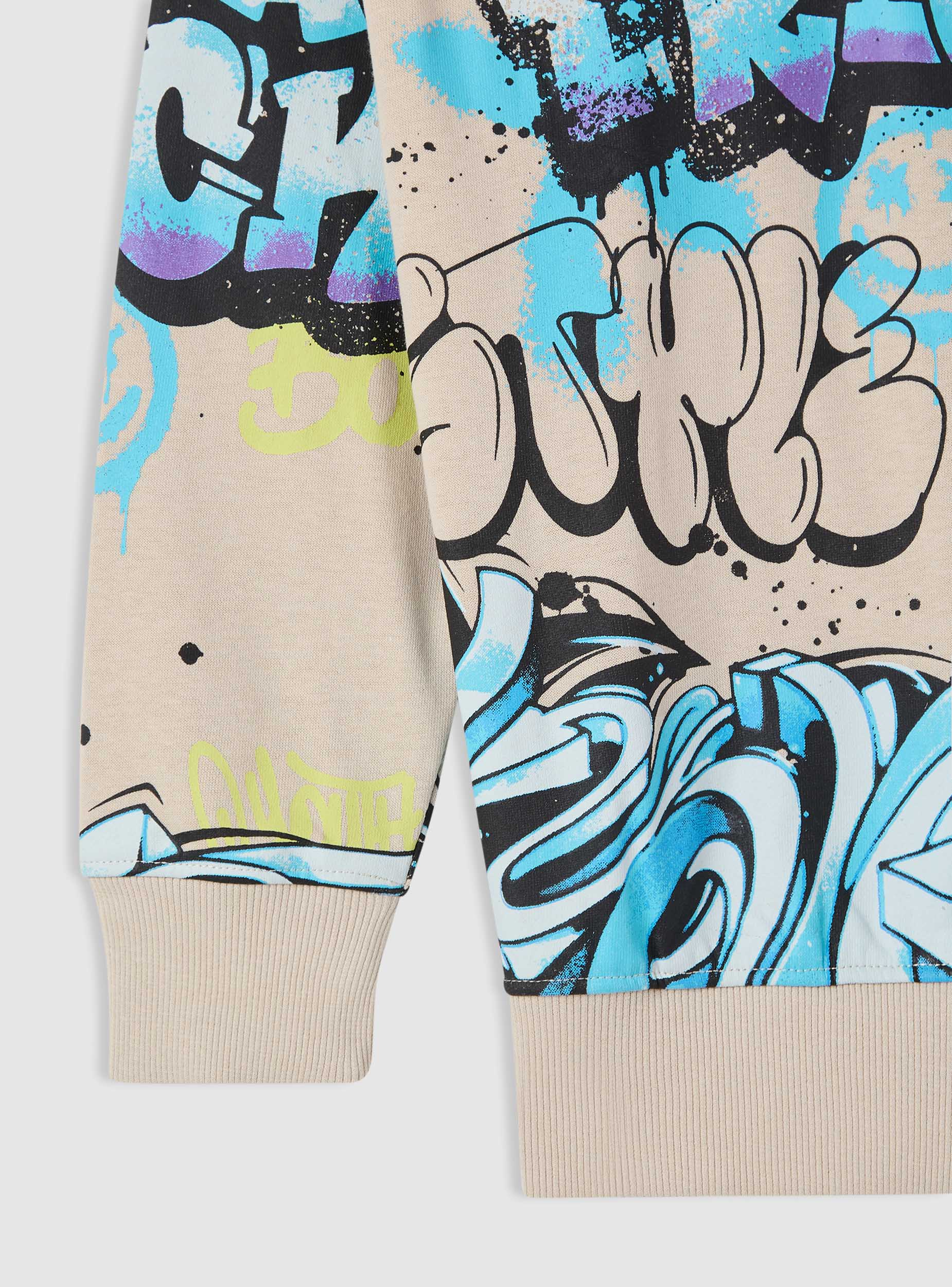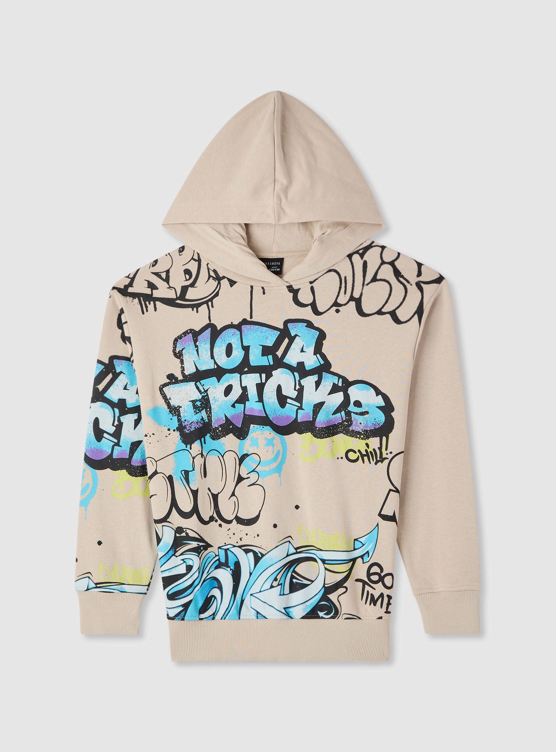 Felpa da bambino con cappuccio e senza zip. Design a stampa graffiti che aggiunge un tocco urbano. Polsini e fondo in maglia elasticizzata per una vestibilità confortevole. Perfetta per scuola e tempo libero, si abbina a jeans o pantaloni tuta. Vestibilità regular e maniche lunghe, ideale per sovrapposizioni con t-shirt. Tessuto leggero.Dettagli
