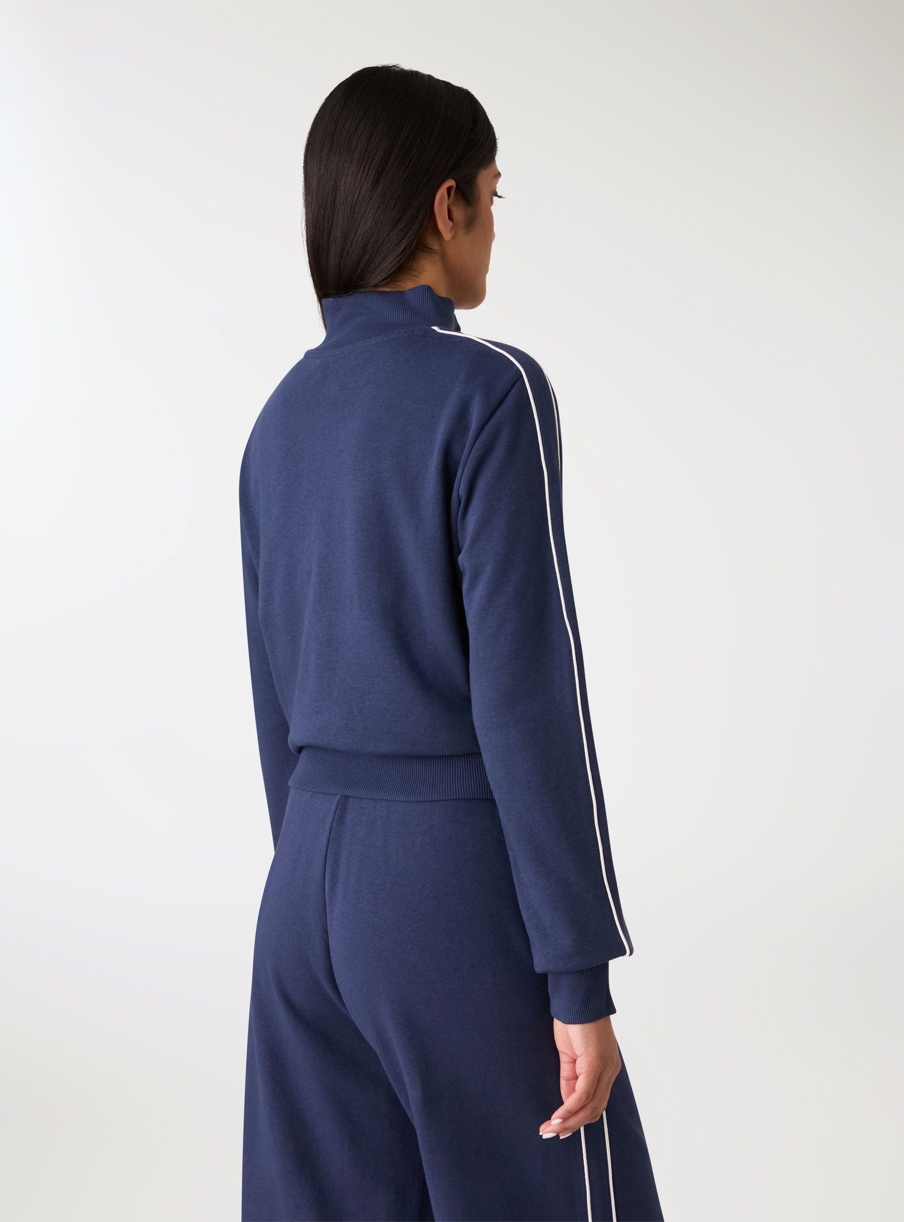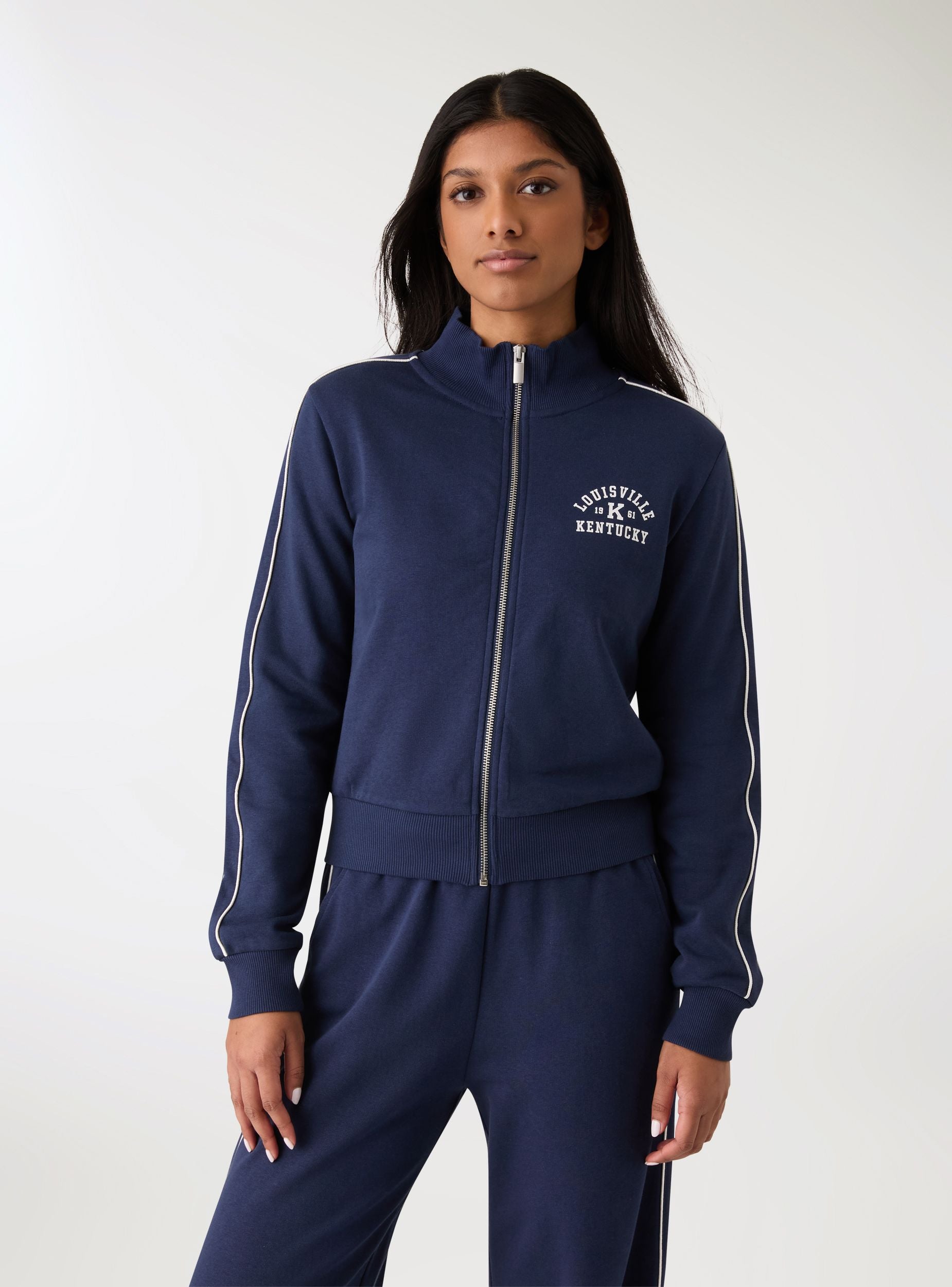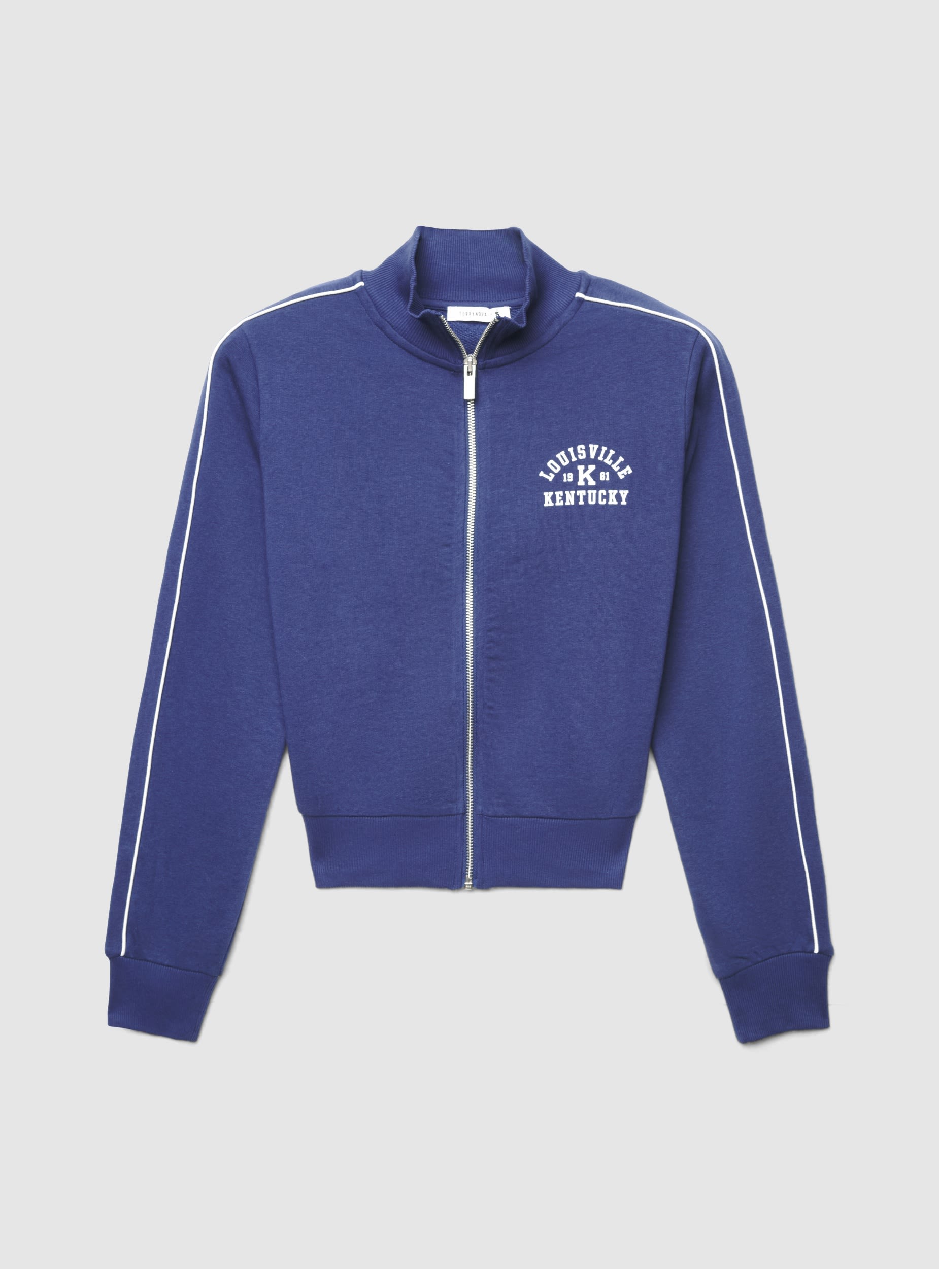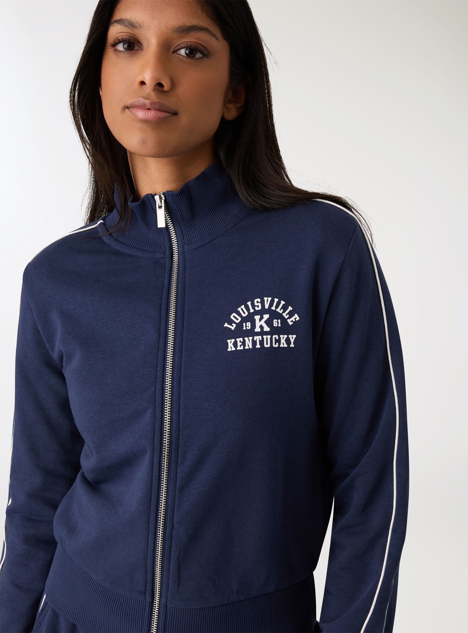 Felpa da donna con zip e collo alto, ideale per look urban e tempo libero. Design con stampa college sul petto, profili a contrasto lungo le maniche e polsini e fondo in maglia a coste per una vestibilità confortevole. Senza cappuccio, presenta maniche lunghe e zip frontale metallica. Perfetta sopra top e jeans o abbinata a pantaloni tuta per un outfit sporty dal tocco trendy.Dettagli