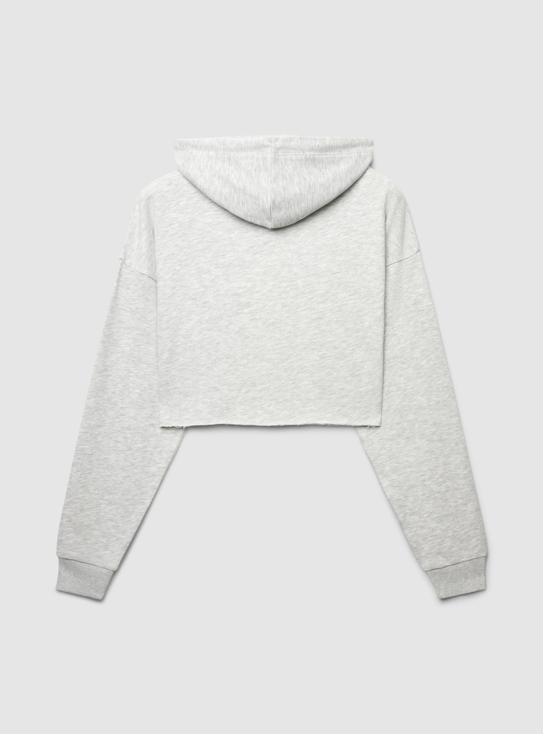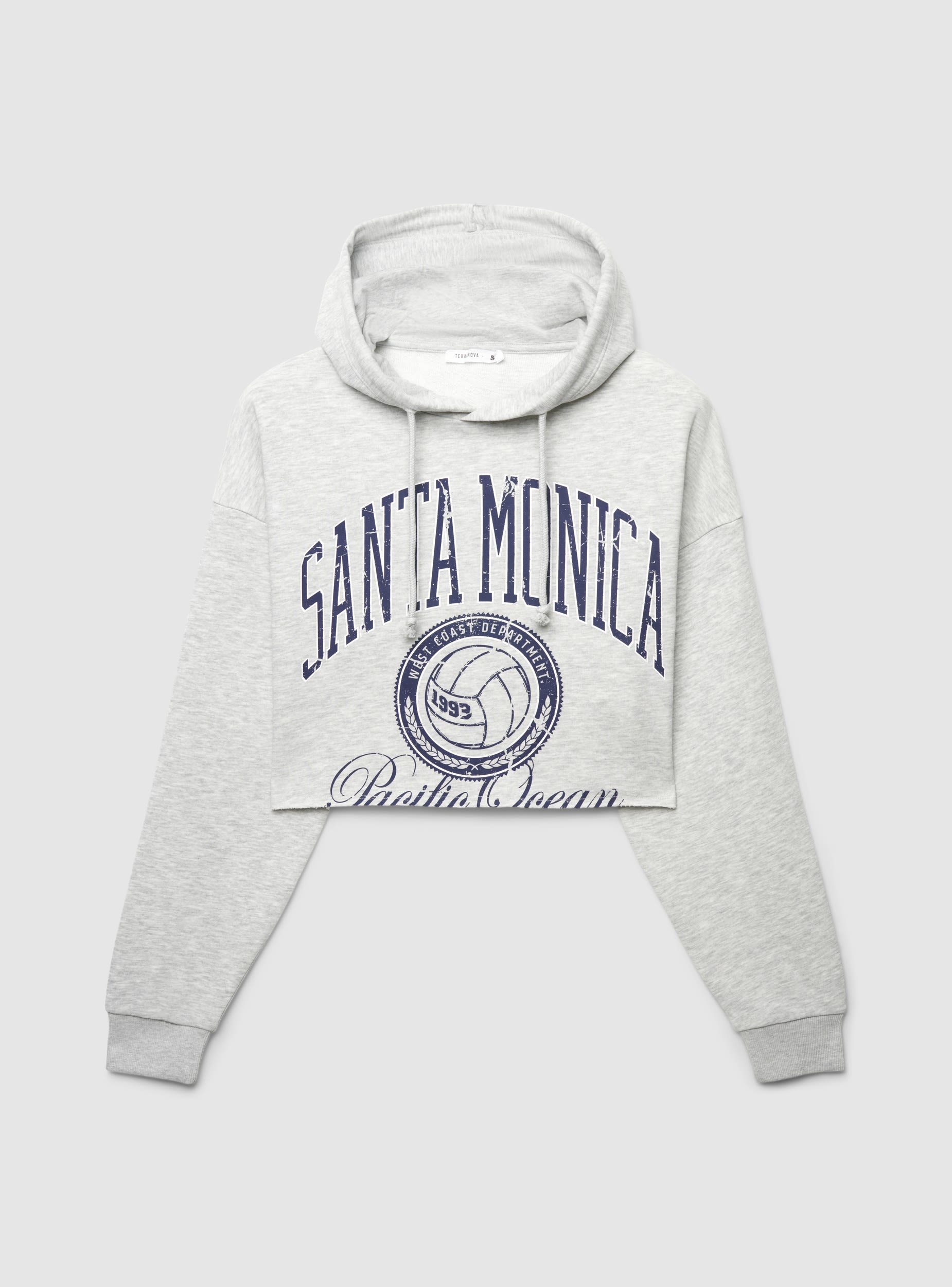 Felpa da donna con cappuccio, modello crop e orlo tagliato a vivo. Presenta stampa college frontale con scritta, maniche lunghe con polsini a coste per una vestibilità confortevole. Ideale per il tempo libero o per look urban con jeans a vita alta o joggers.Dettagli
