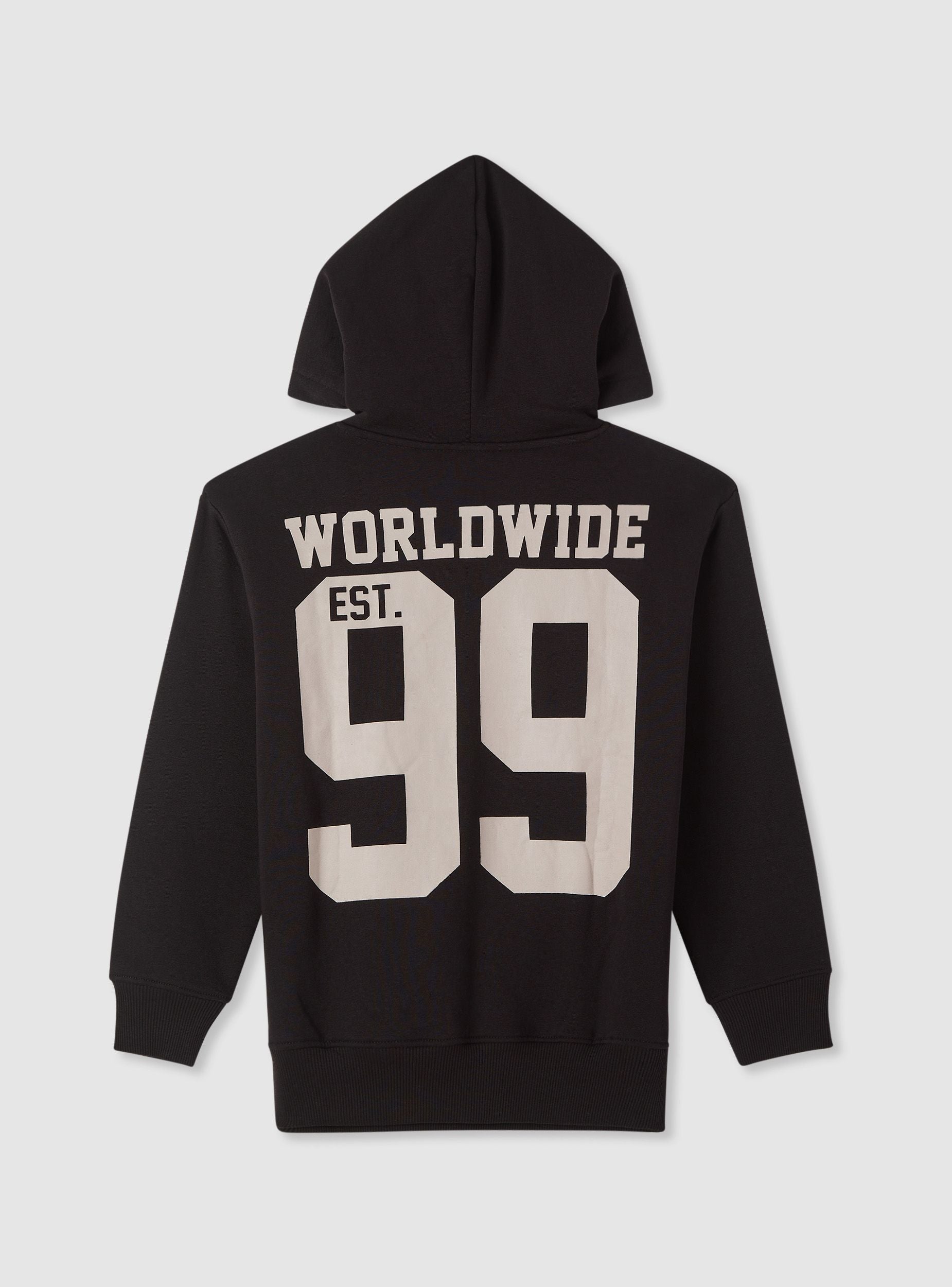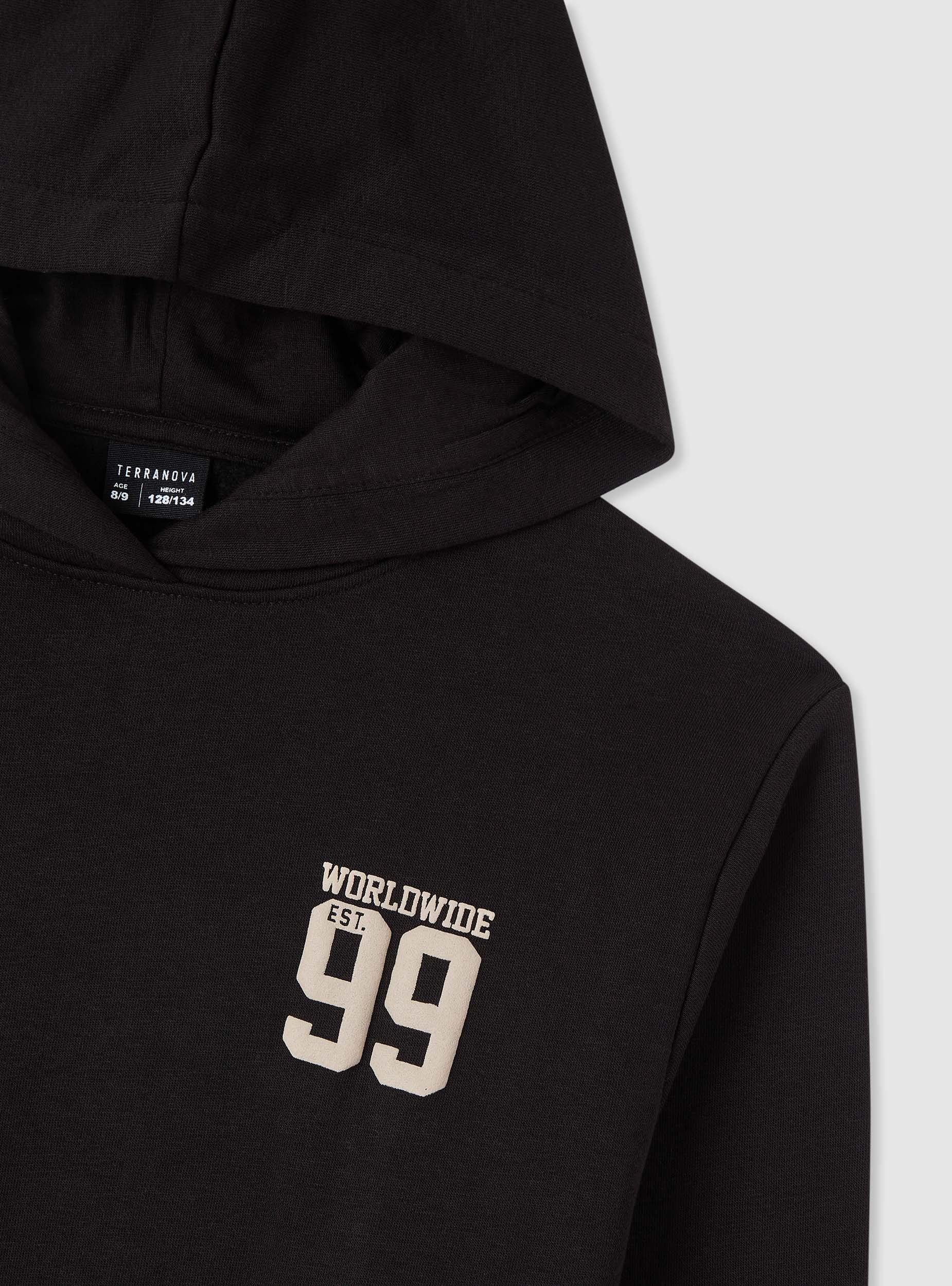 Felpa da bambino con cappuccio senza zip, ideale per la scuola e il tempo libero. Modello a tinta unita con grafica college stampata sul petto e maxi stampa sul retro. Maniche lunghe, tasca a marsupio e finiture in costina su polsi e fondo per una vestibilità confortevole. Facile da abbinare a jeans o pantaloni tuta per un look urbano e dinamico. Tessuto leggero.Dettagli
