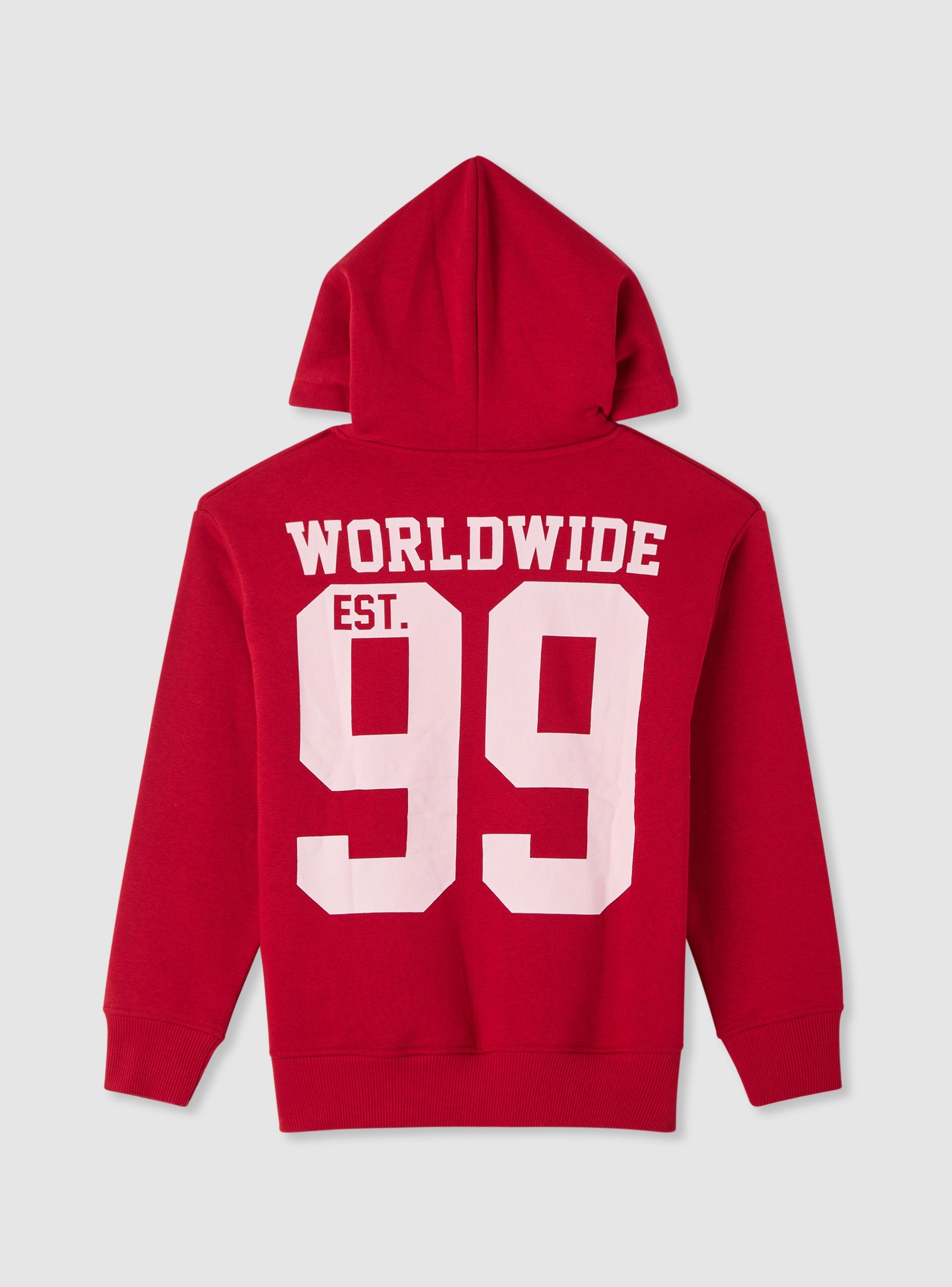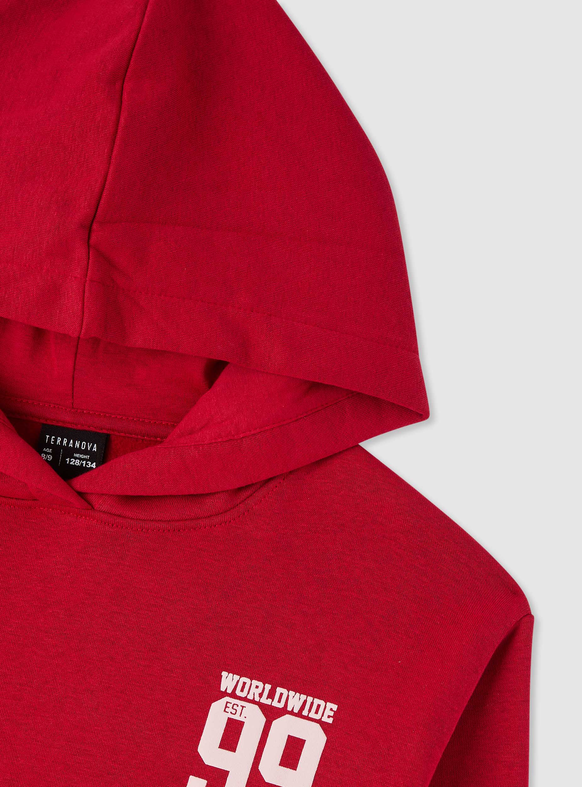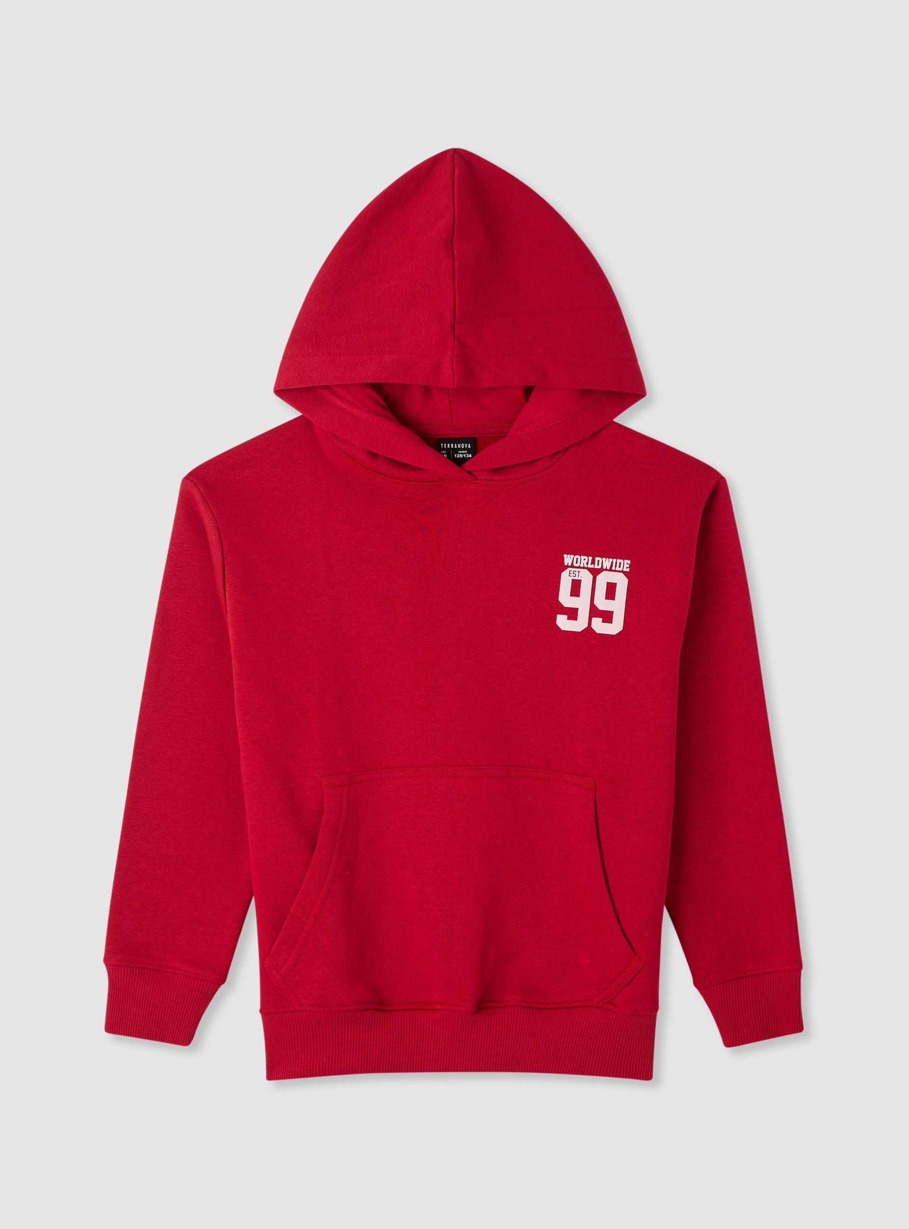 Felpa da bambino con cappuccio senza zip, ideale per la scuola e il tempo libero. Modello a tinta unita con grafica college stampata sul petto e maxi stampa sul retro. Maniche lunghe, tasca a marsupio e finiture in costina su polsi e fondo per una vestibilità confortevole. Facile da abbinare a jeans o pantaloni tuta per un look urbano e dinamico. Tessuto leggero.Dettagli