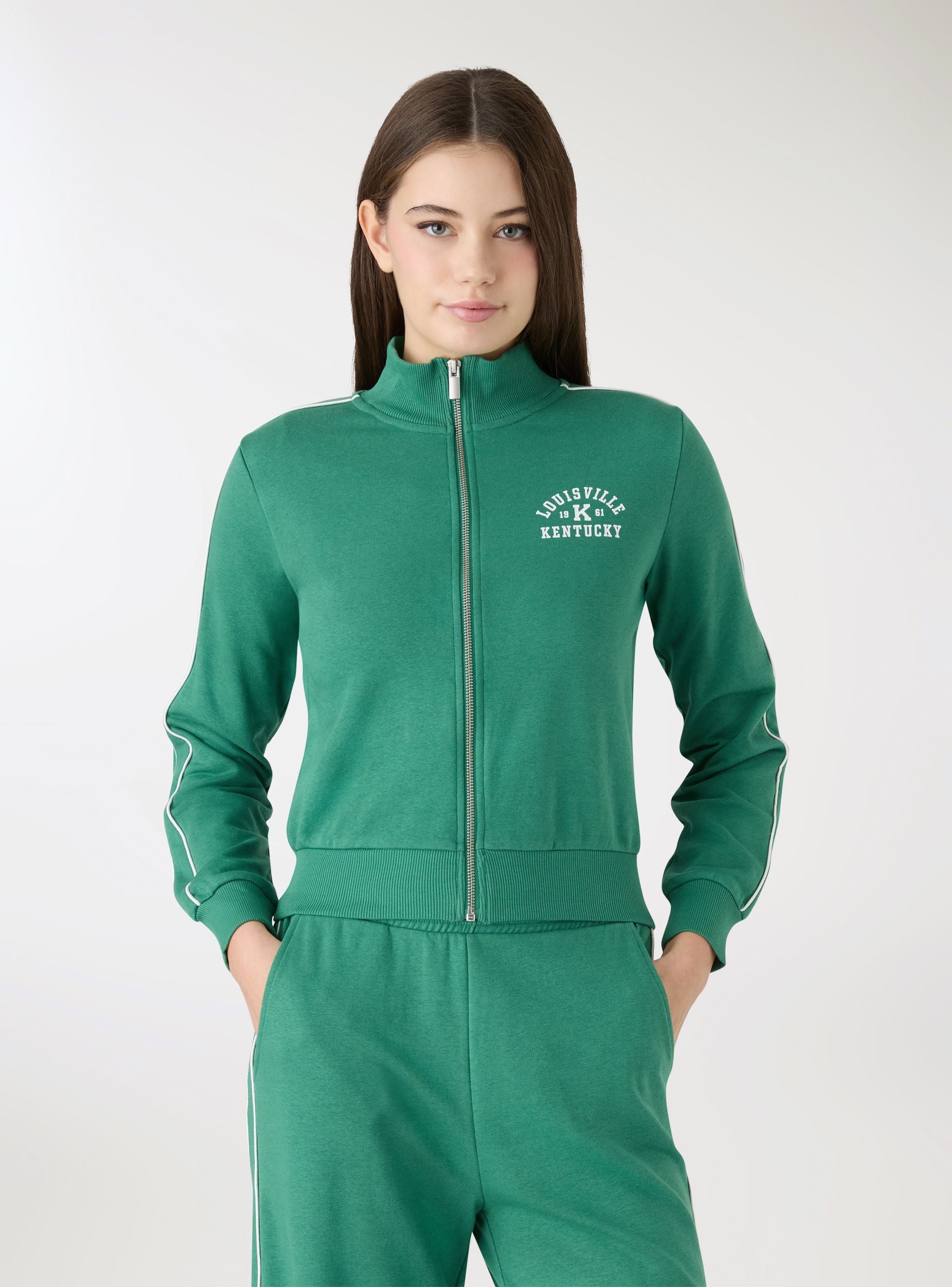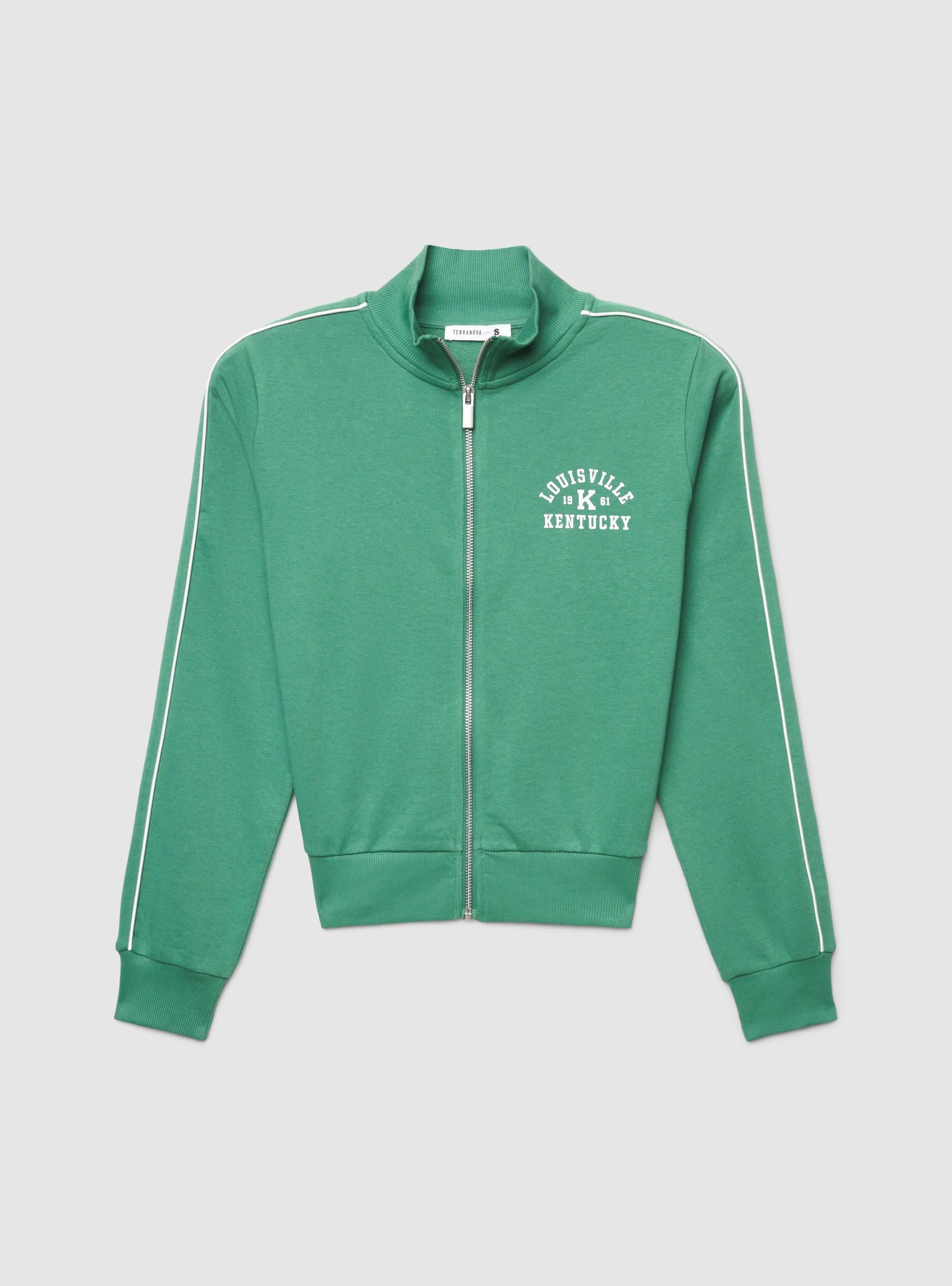 Felpa da donna con zip e collo alto, ideale per look urban e tempo libero. Design con stampa college sul petto, profili a contrasto lungo le maniche e polsini e fondo in maglia a coste per una vestibilità confortevole. Senza cappuccio, presenta maniche lunghe e zip frontale metallica. Perfetta sopra top e jeans o abbinata a pantaloni tuta per un outfit sporty dal tocco trendy.Dettagli