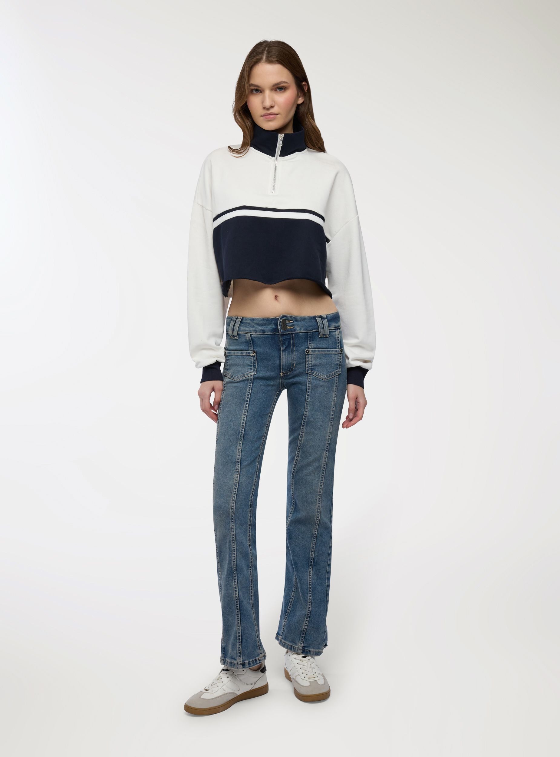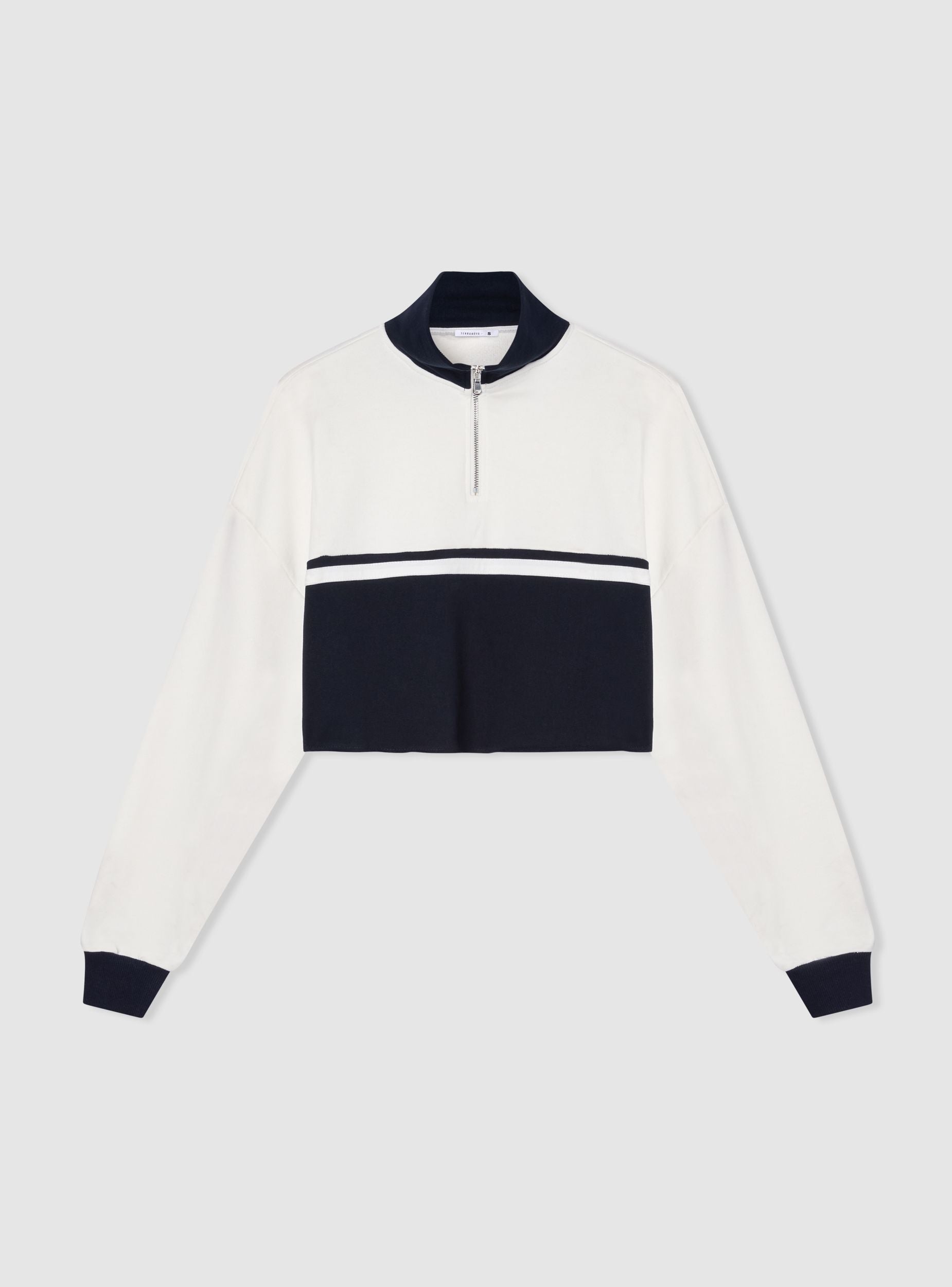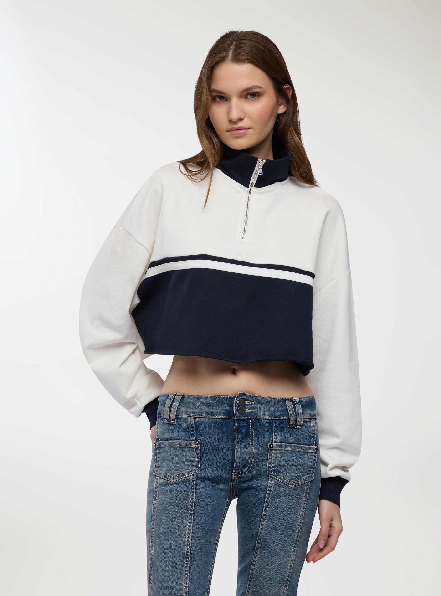 Felpa da donna dal taglio crop con collo half zip e senza cappuccio. Design a blocchi di colore orizzontali, maniche lunghe e polsi in maglia per una vestibilità confortevole. Ideale per look casual e sporty, si abbina a jeans a vita alta o pantaloni tuta per il tempo libero. Tessuto pesante.Dettagli