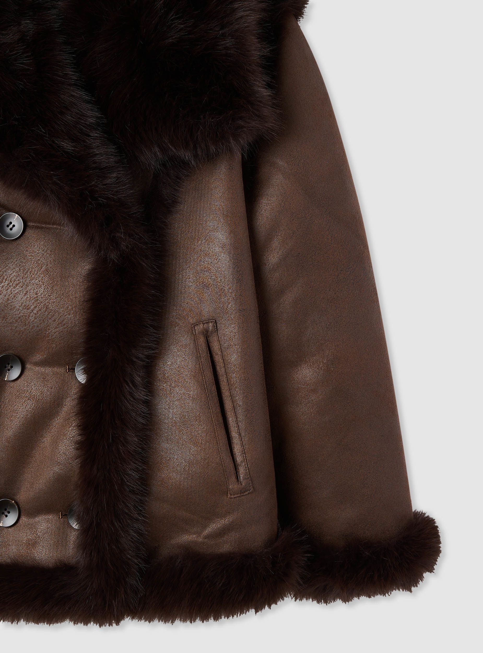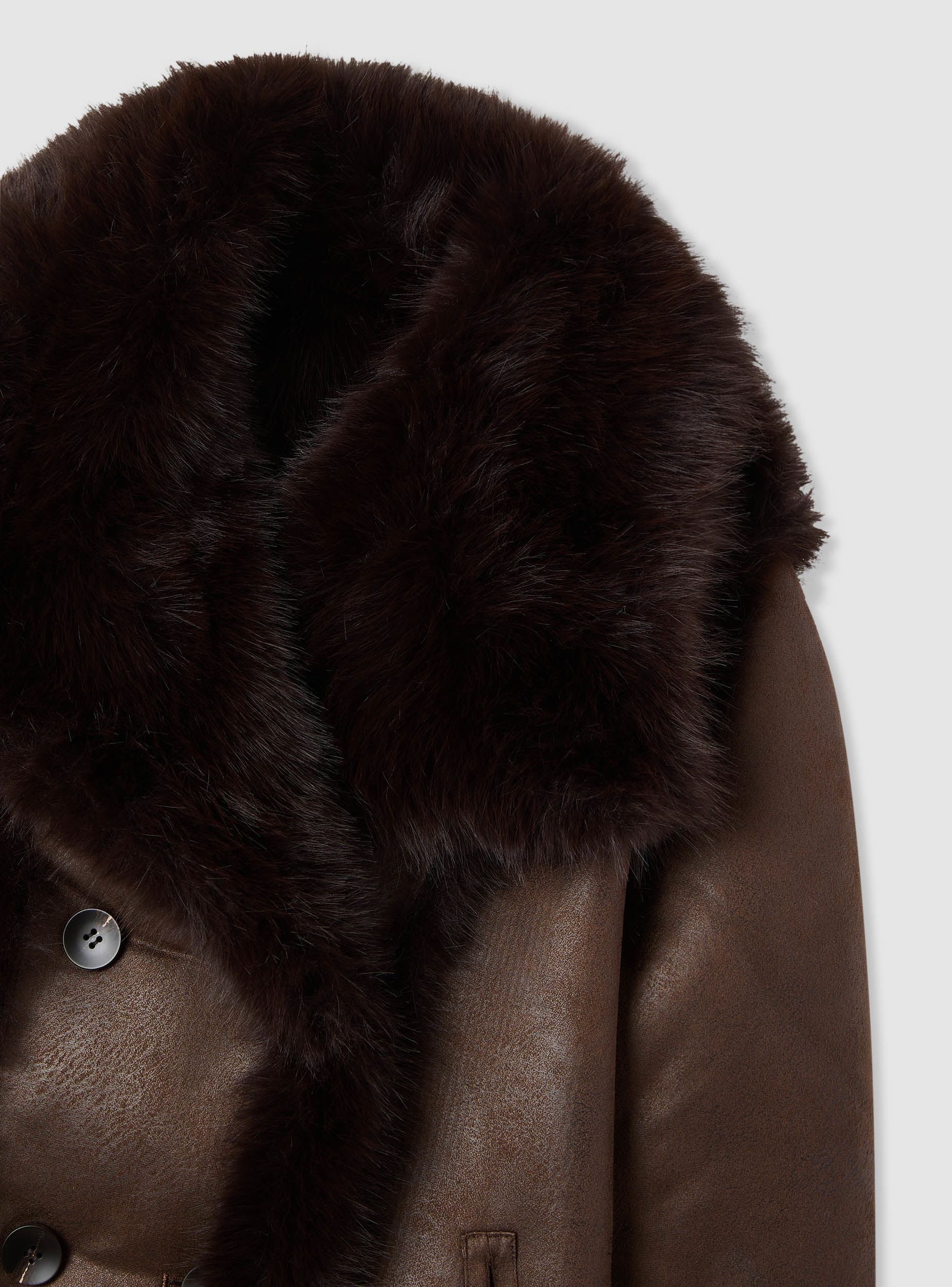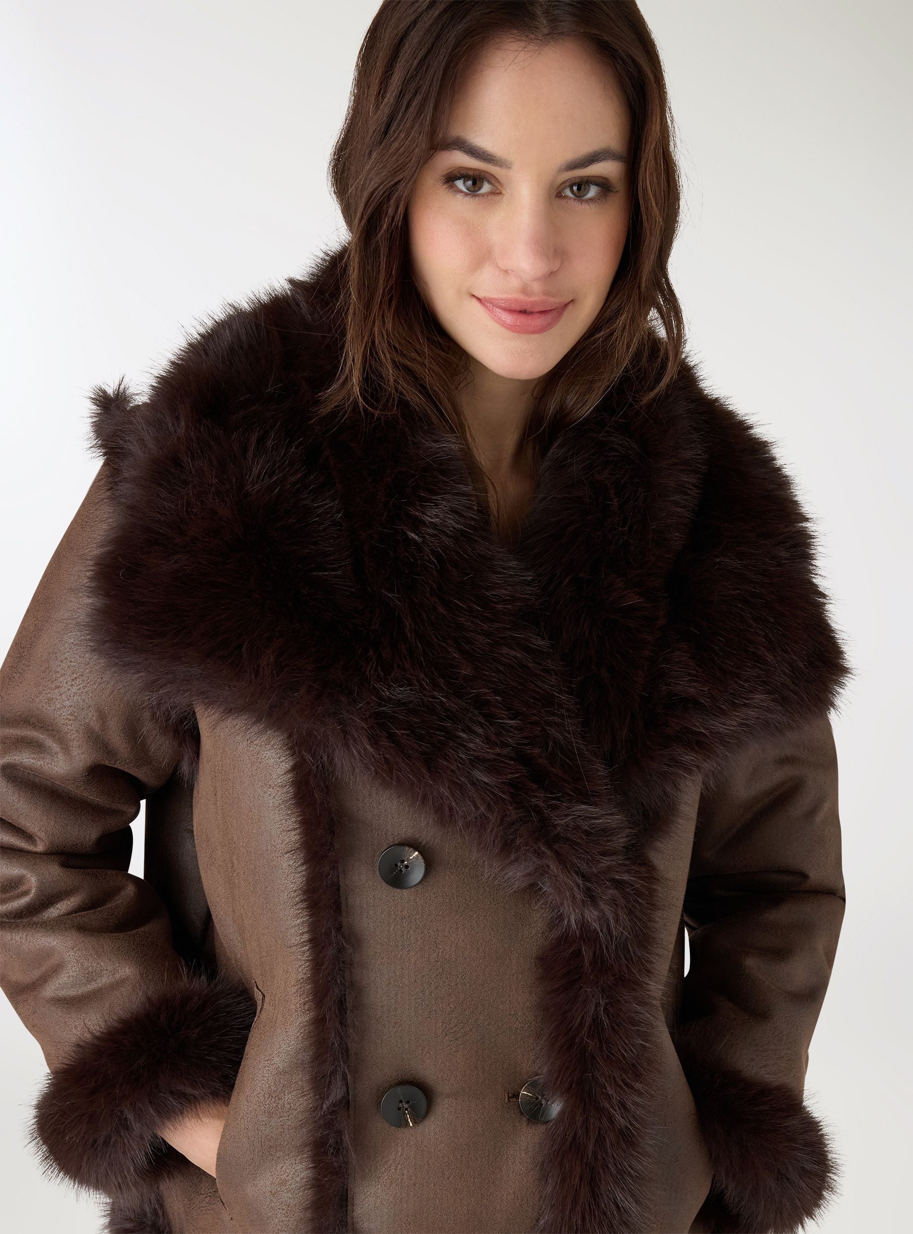 Giacca da donna in tinta unita, doppiopetto con bottoni frontali. Collo ampio effetto peloso e profili morbidi lungo apertura e fondo, ideale per look cittadini quando la temperatura scende. Linea regolare e lunghezza a vita media, perfetto su maglietta e jeans o su abito midi per un tocco sofisticato. Tasche laterali a filetto per tenere le mani al caldo e portare l’essenziale. Reversibile.Dettagli