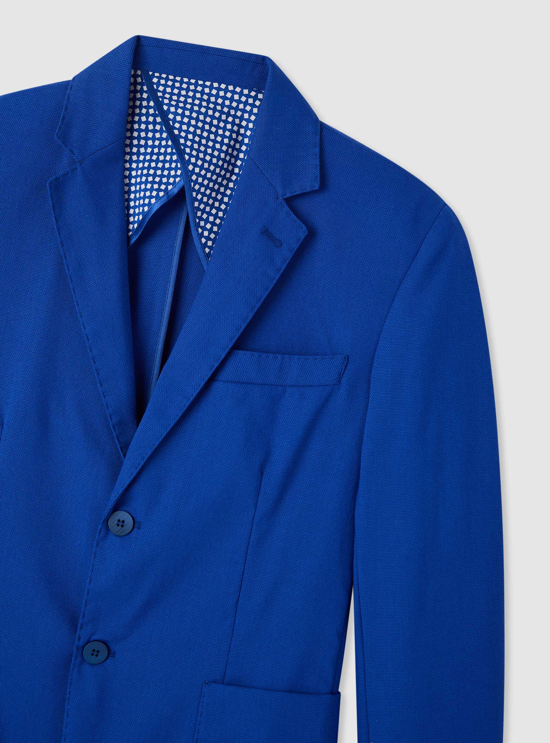 Giacca da uomo a tinta unita, impeccabile per ufficio, eventi e serate. Taglio regular monopetto con due bottoni, revers a lancia e taschino sul petto. Tasche frontali applicate ampie e maniche lunghe. Interno con stampa geometrica che dona personalità. Si indossa con camicia e pantaloni sartoriali per un look formale, oppure con maglietta e pantaloni chino per un’eleganza rilassata. Perfetta con mocassini o sneakers essenziali.Dettagli