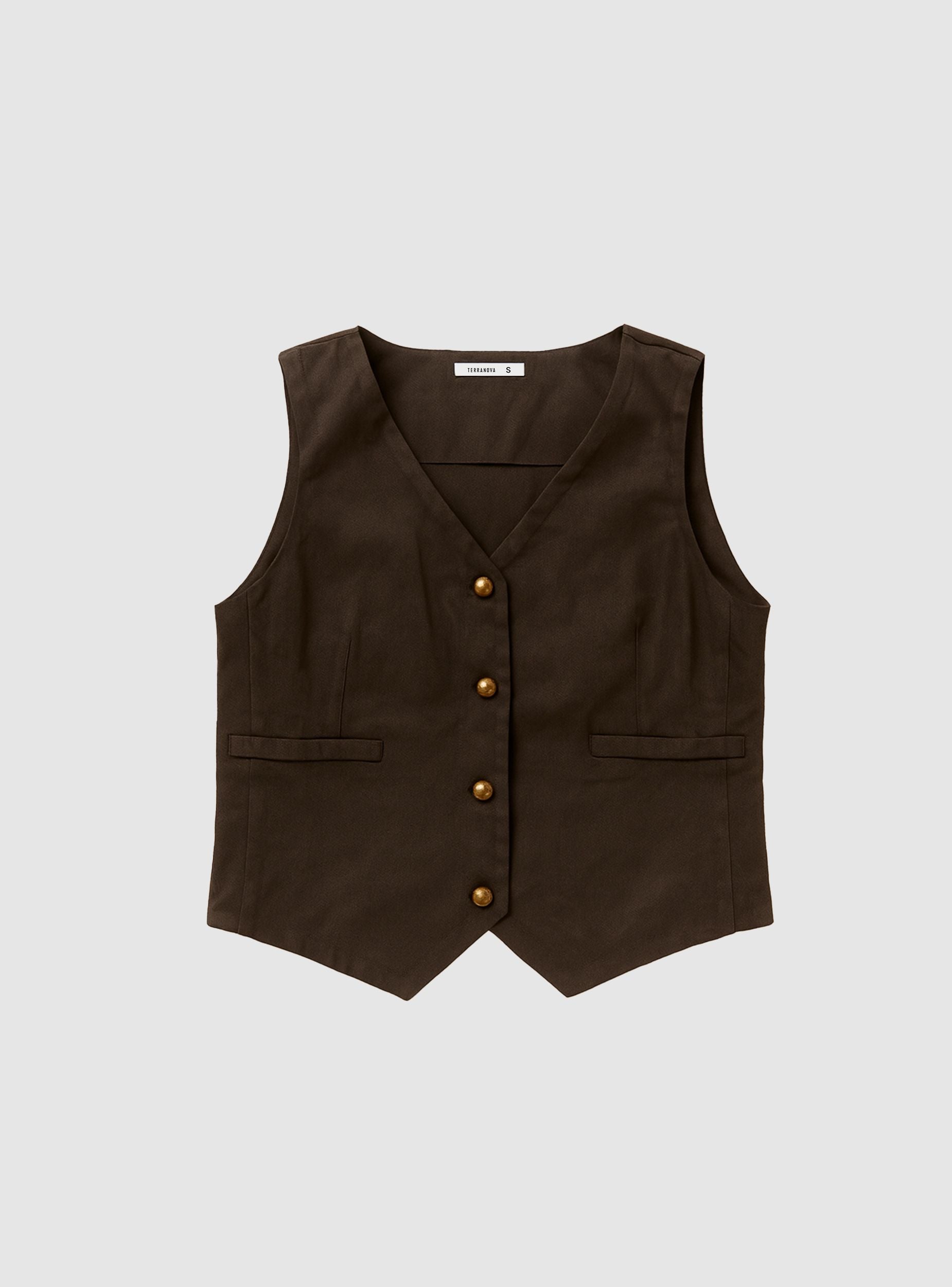 Gilet da donna effetto scamosciato con scollo a V e chiusura frontale a bottoni metallizzati. Modello dal taglio regolare, ideale per look urban su camicie o magliette, perfetto anche con jeans o pantaloni sartoriali. Due tasche a filetto. Versatile per il tempo libero o per outfit da ufficio curati.Dettagli