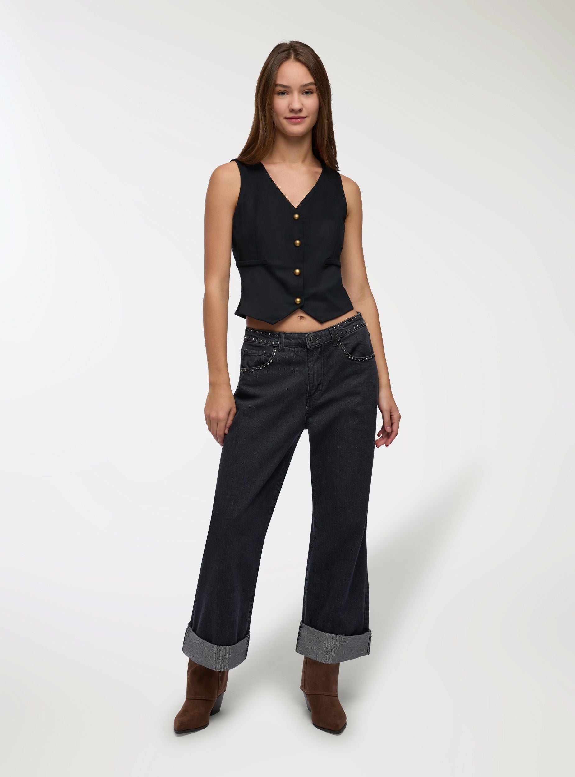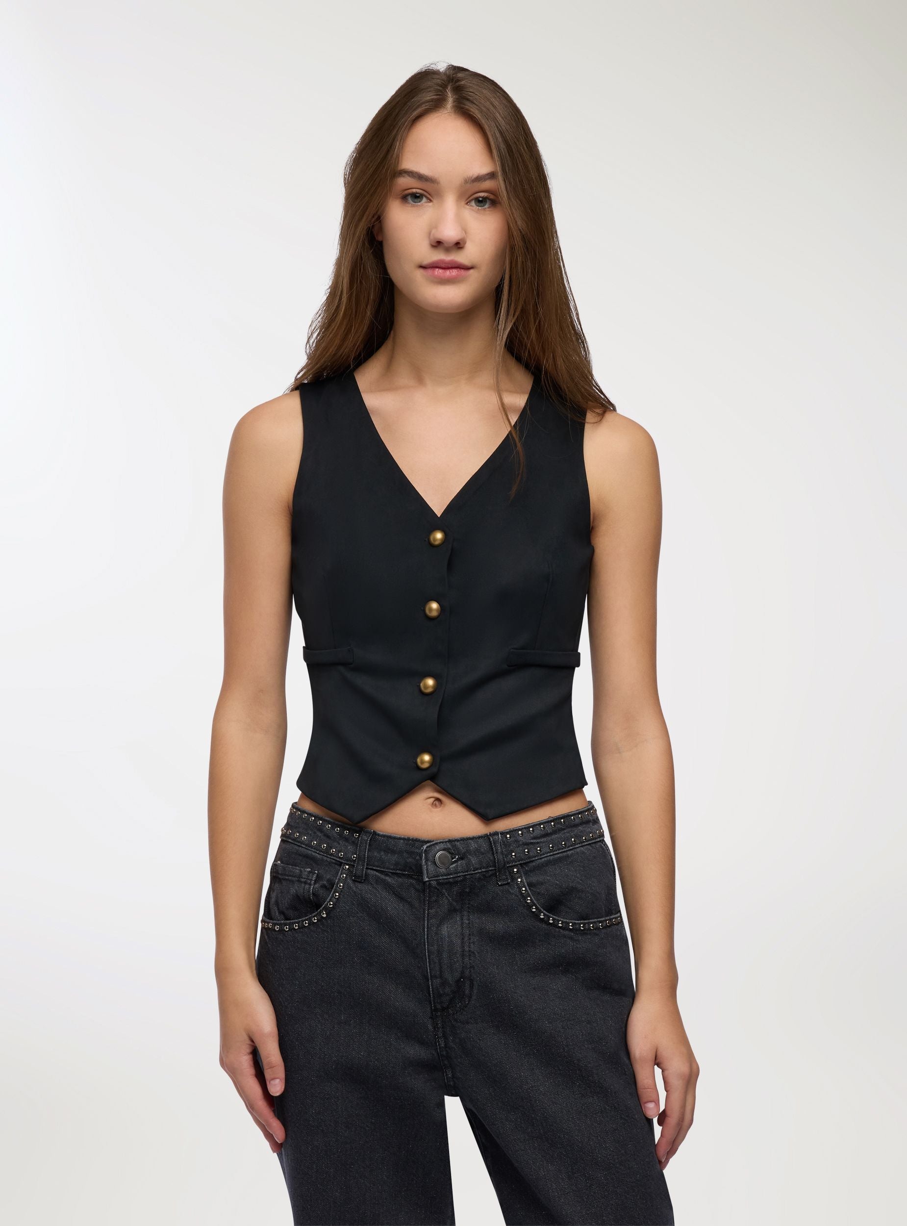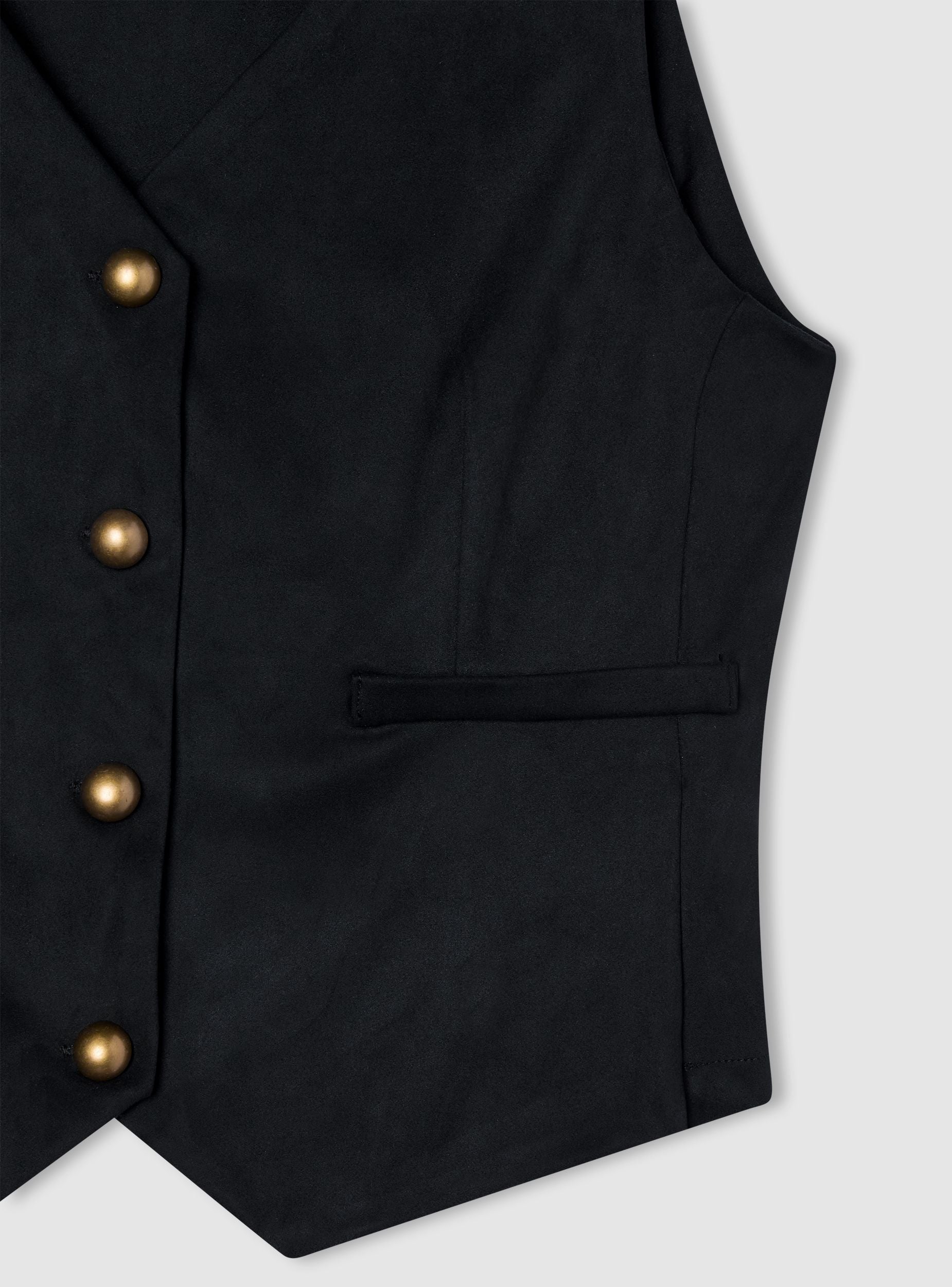 Gilet da donna effetto scamosciato con scollo a V e chiusura frontale a bottoni metallizzati. Modello dal taglio regolare, ideale per look urban su camicie o magliette, perfetto anche con jeans o pantaloni sartoriali. Due tasche a filetto. Versatile per il tempo libero o per outfit da ufficio curati.Dettagli