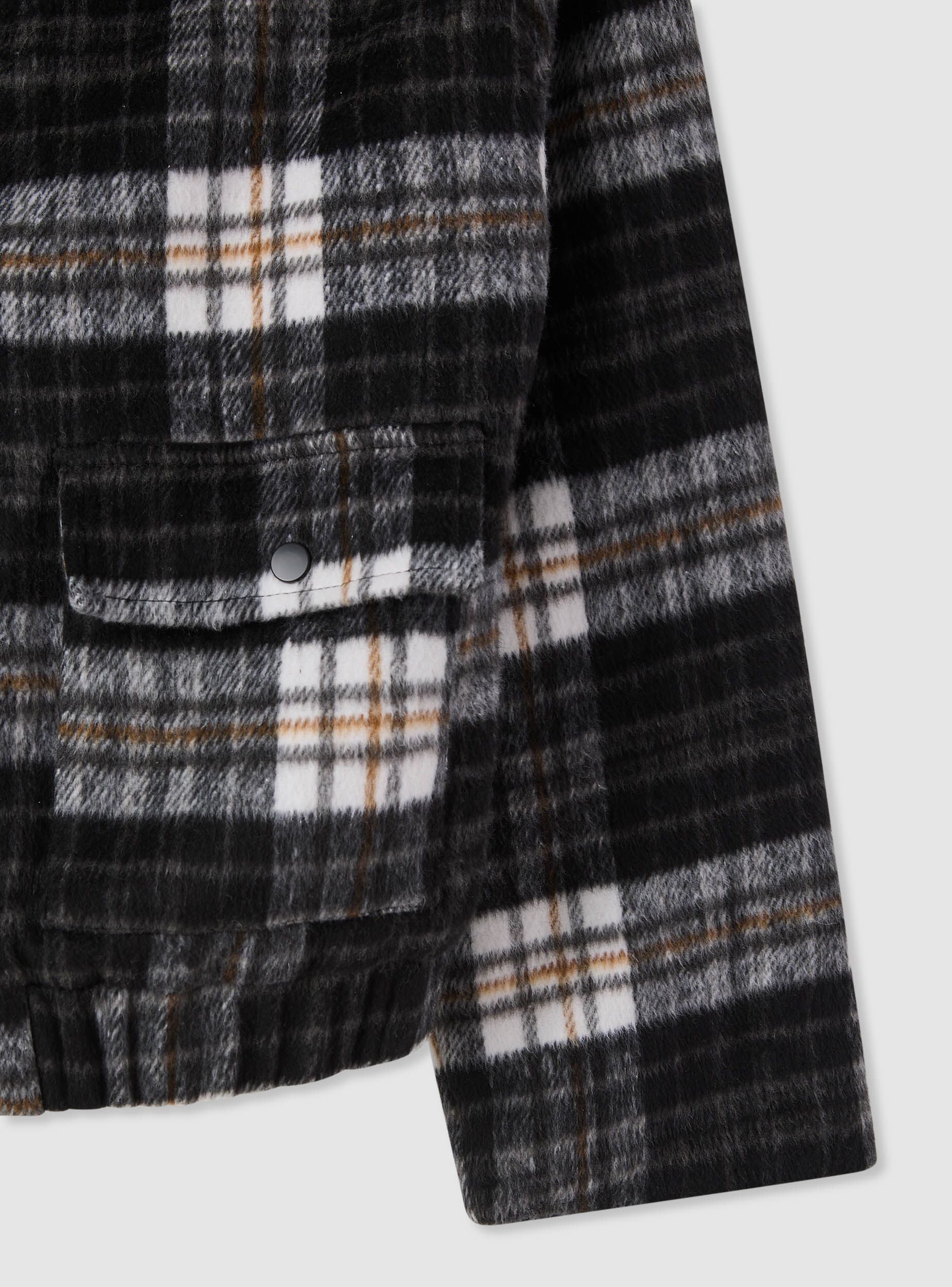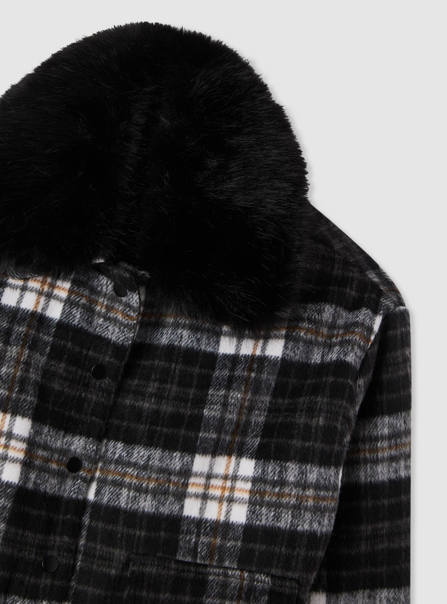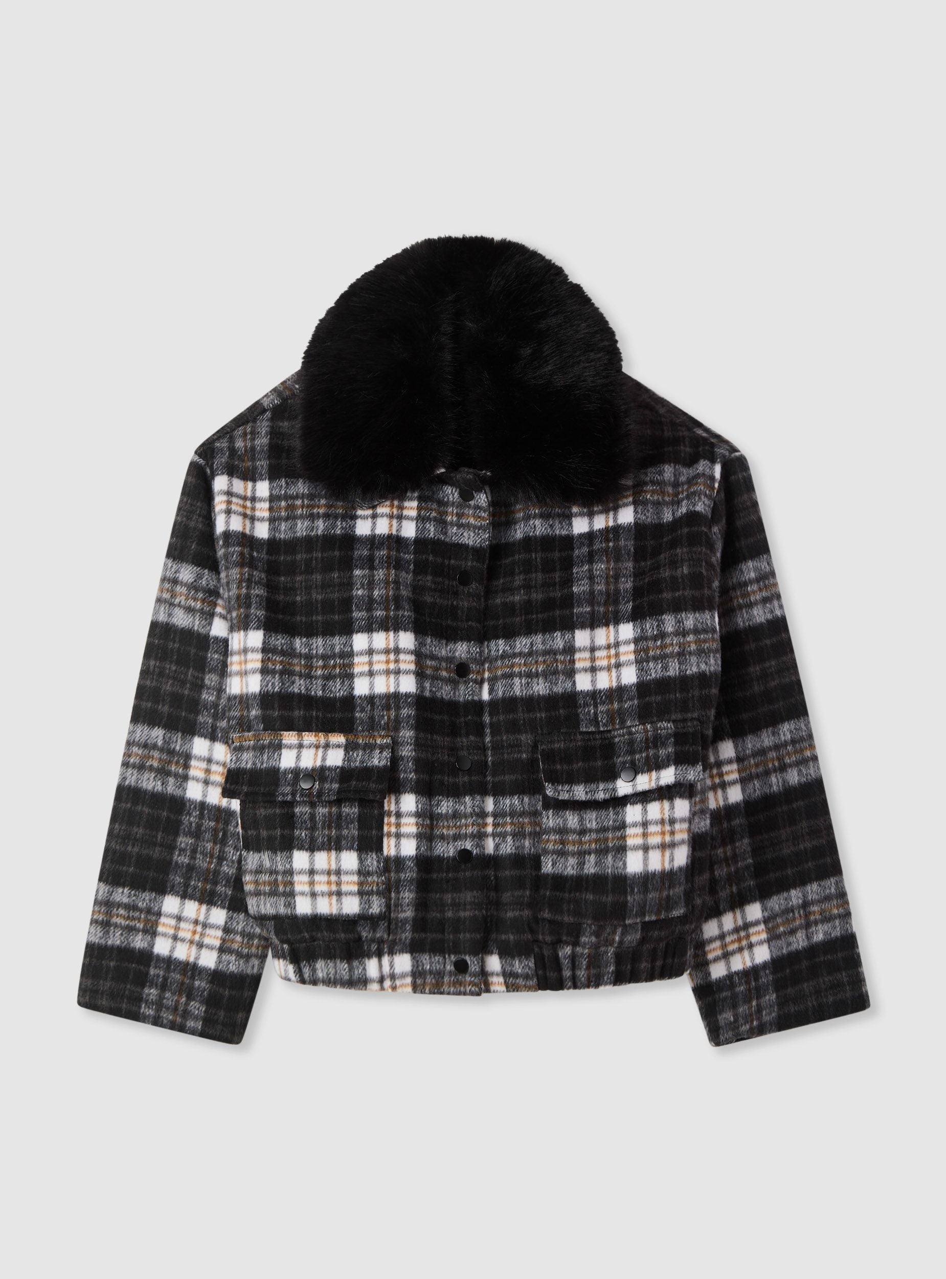 Giubbino da donna a quadri dal taglio corto, ideale per completare look urban nelle giornate fredde. Modello con collo ampio effetto pelo e maniche lunghe, chiusura frontale con bottoni a pressione. Presenta tasche applicate con patta sul davanti e fondo con elastico per una vestibilità comoda. Perfetto con jeans, pantaloni a vita alta o gonne midi e stivali.Dettagli