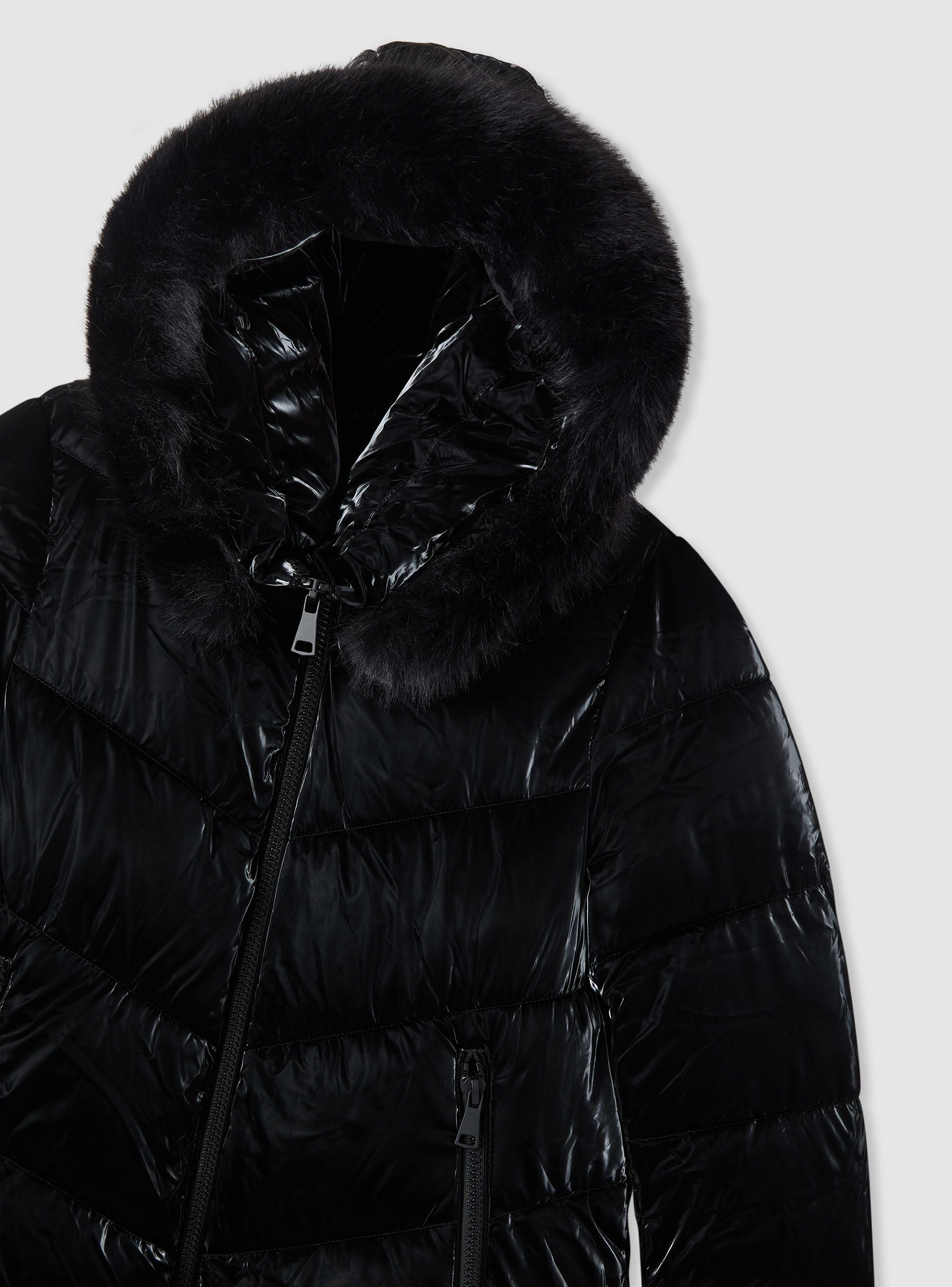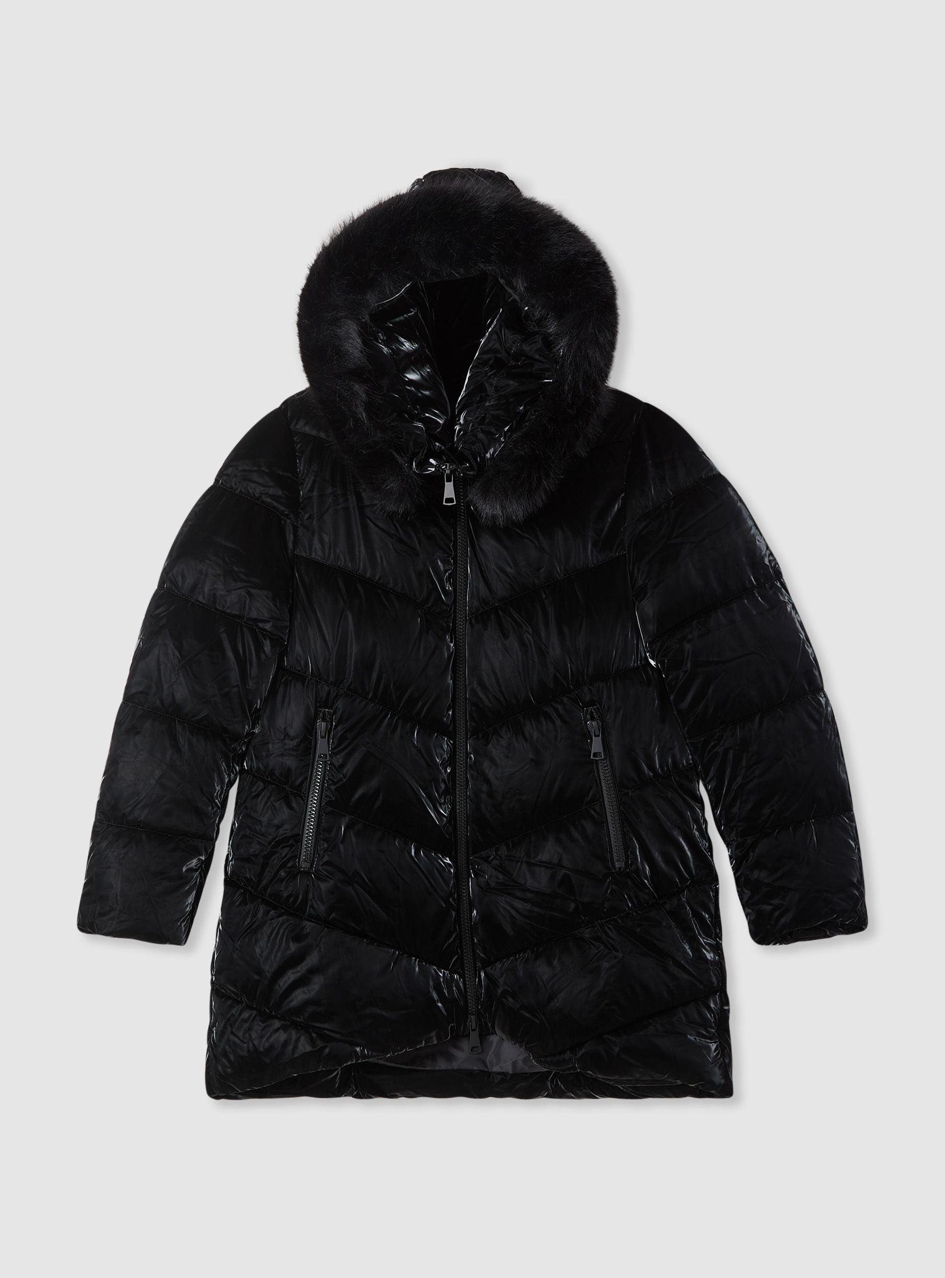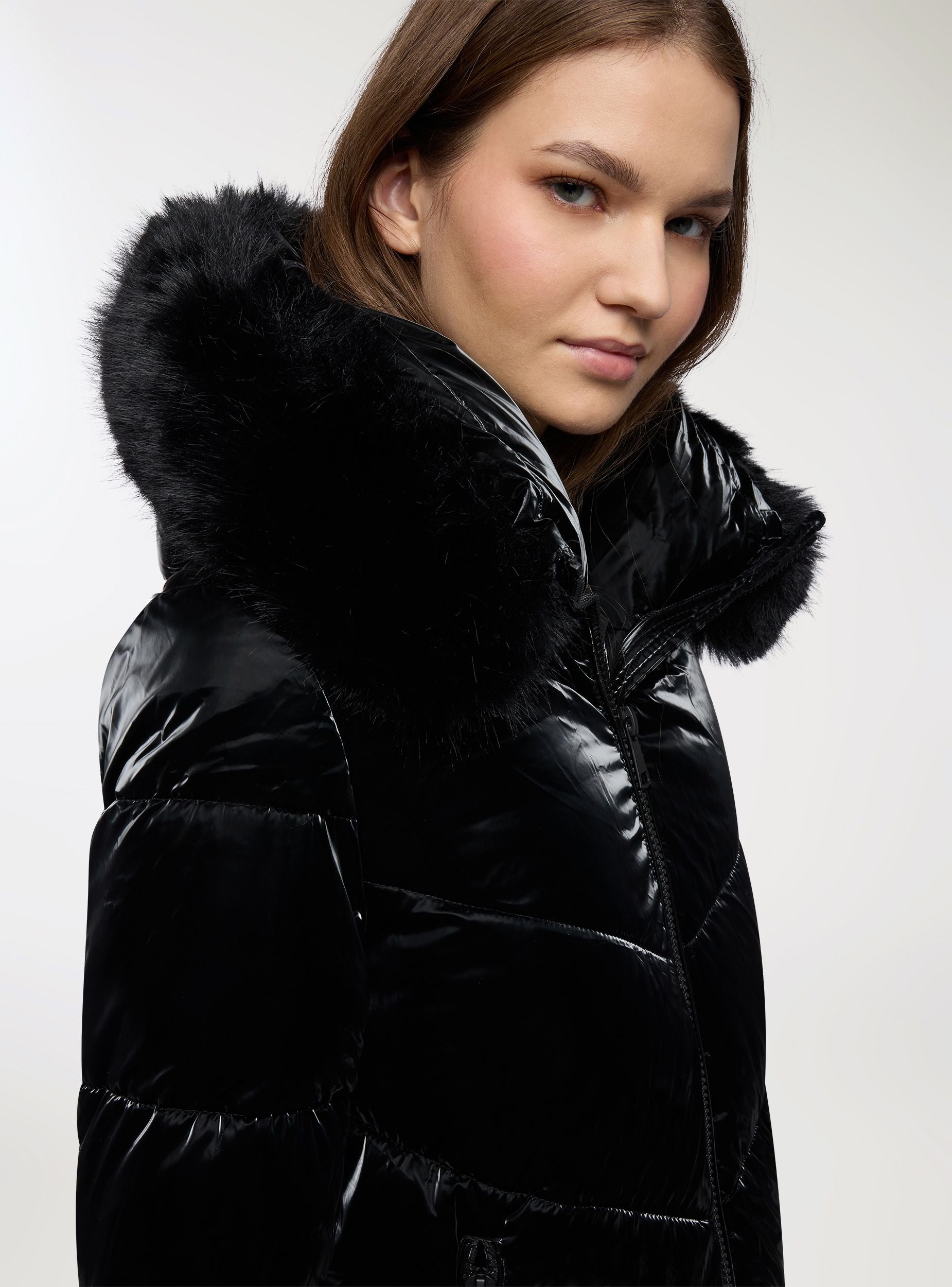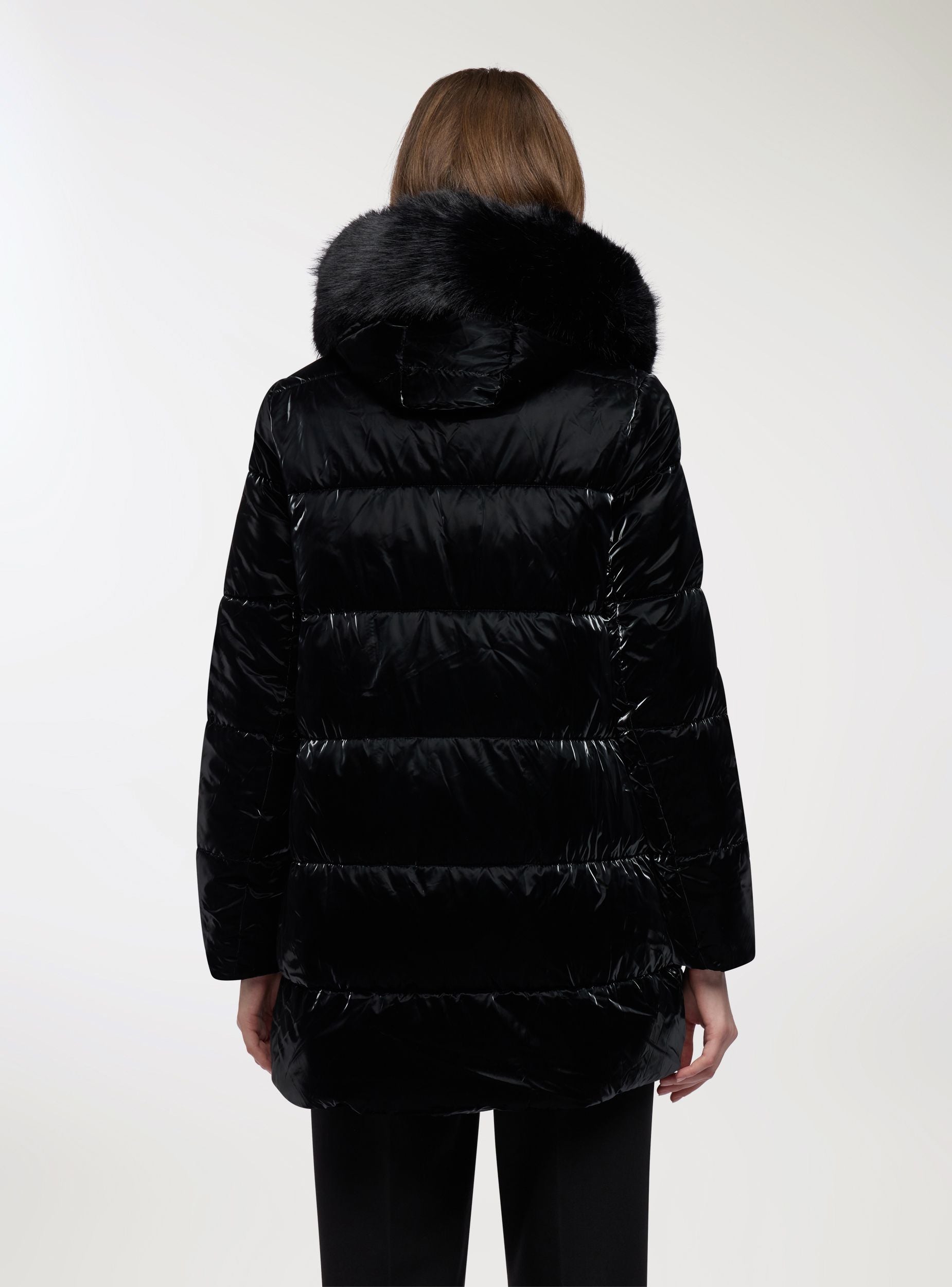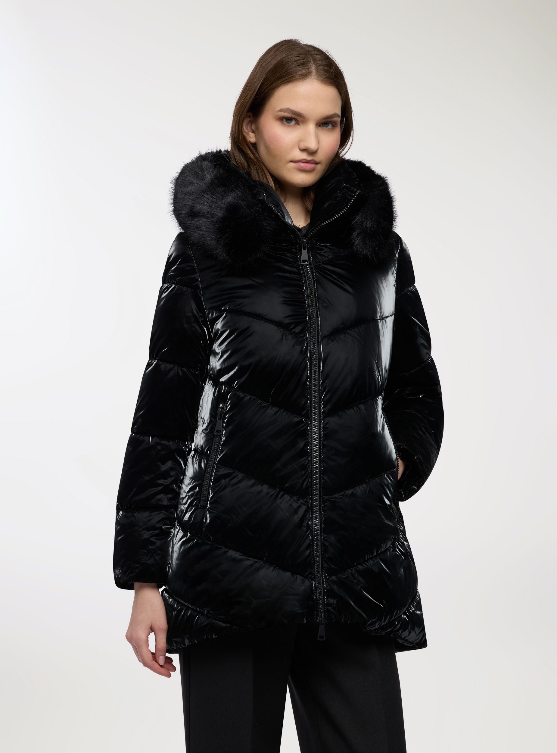 Giubbotto imbottito da donna, tinta unita, con cappuccio avvolgente rifinito da bordo peloso. Chiusura frontale con zip e tasche laterali, trapuntatura diagonale che slancia la figura. Lunghezza media adatta a look quotidiani in città e momenti di tempo libero. Perfetto su maglione e jeans o con stivali e pantaloni per un outfit caldo e femminile.Dettagli