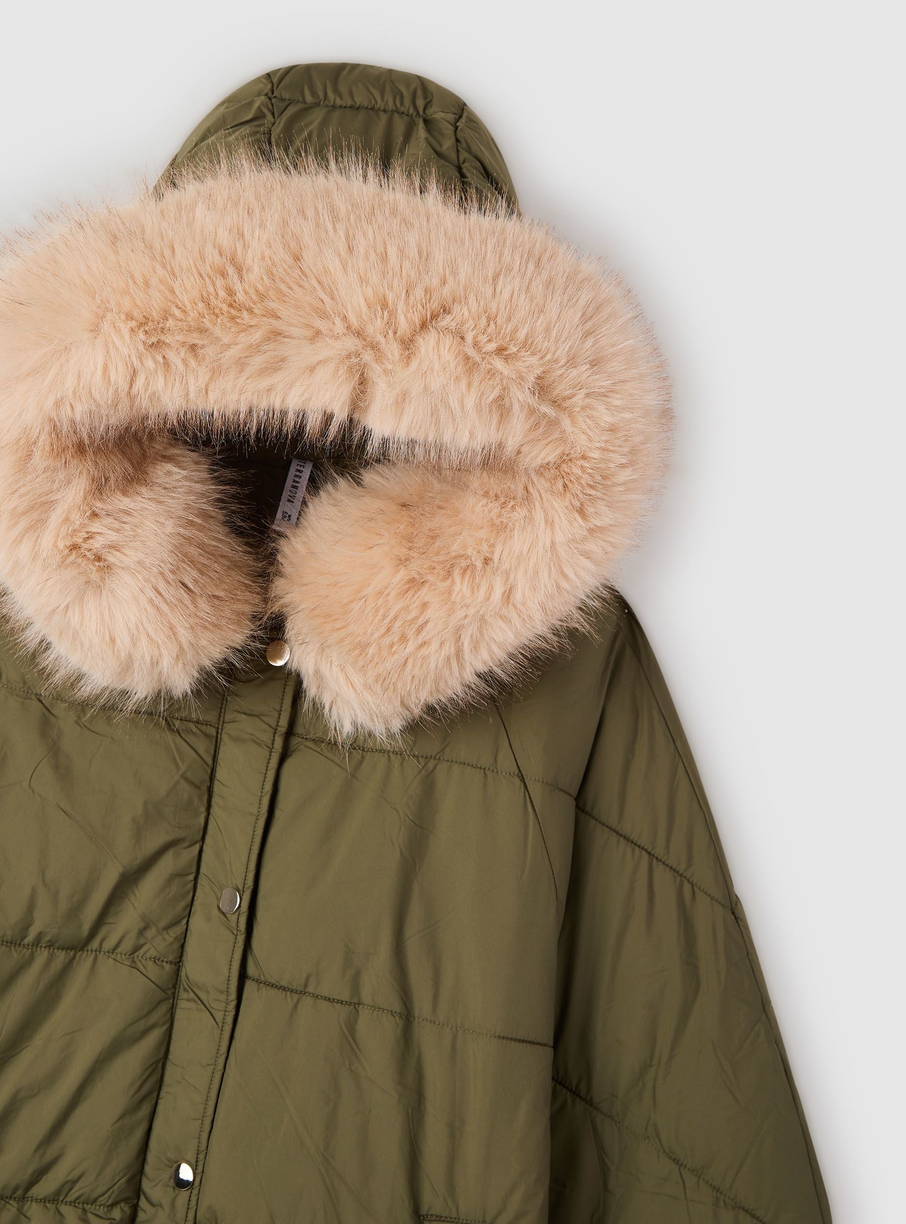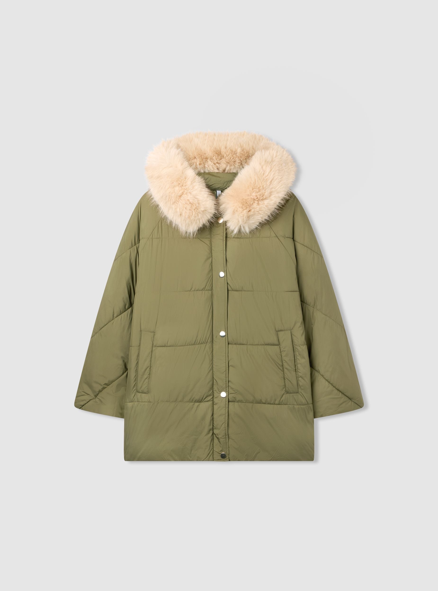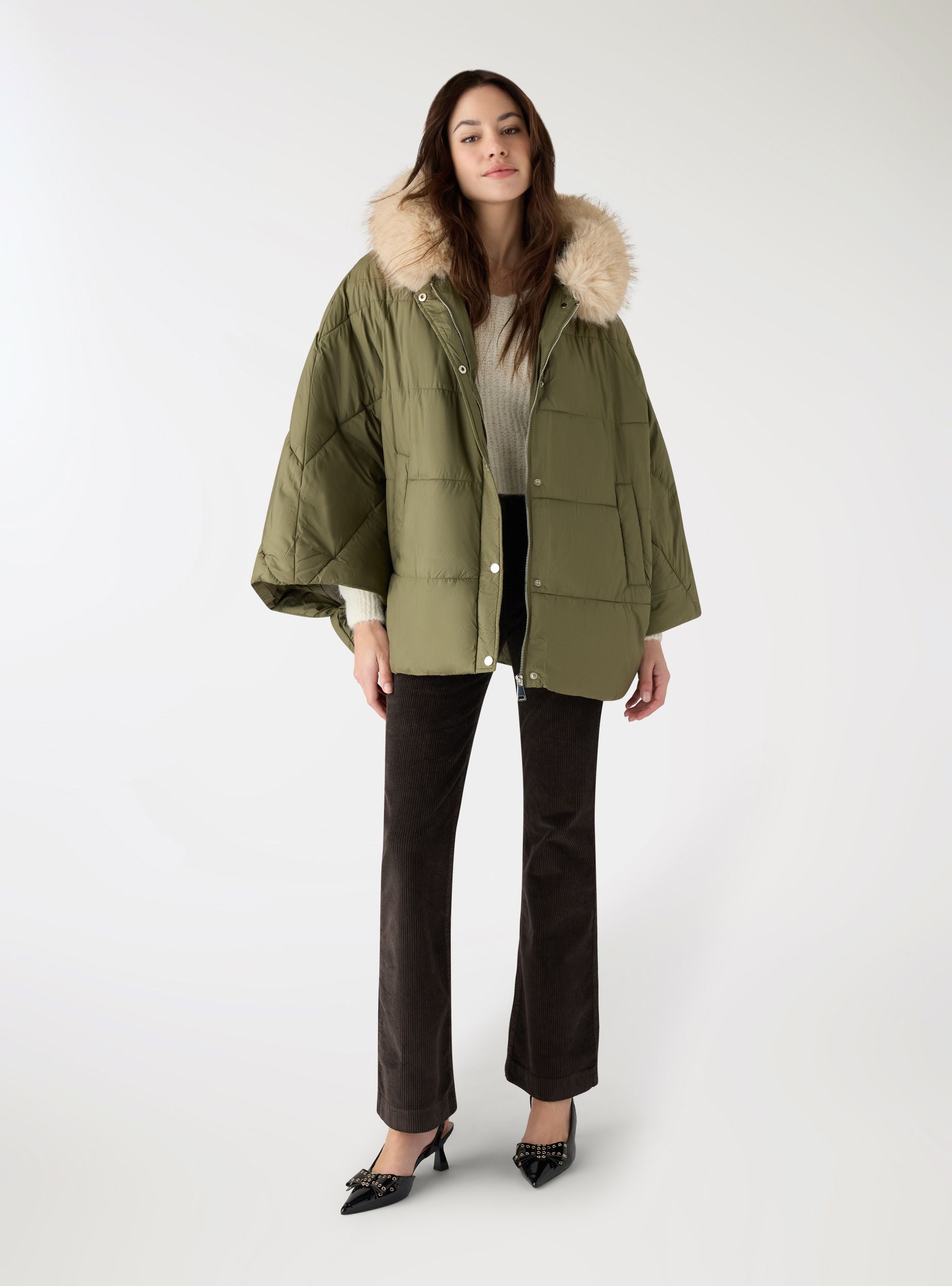 Giubbotto imbottito da donna con cappuccio, perfetto per i giorni freddi in città e nel tempo libero. Linea ampia e comoda, chiusura frontale con bottoni a pressione e tasche laterali a filetto per tenere le mani al caldo. Trapunta orizzontale e dettagli pelosi sul bordo del cappuccio donano un tocco ricercato. Da abbinare a jeans e stivaletti per un look casual. Tinta unita.Dettagli