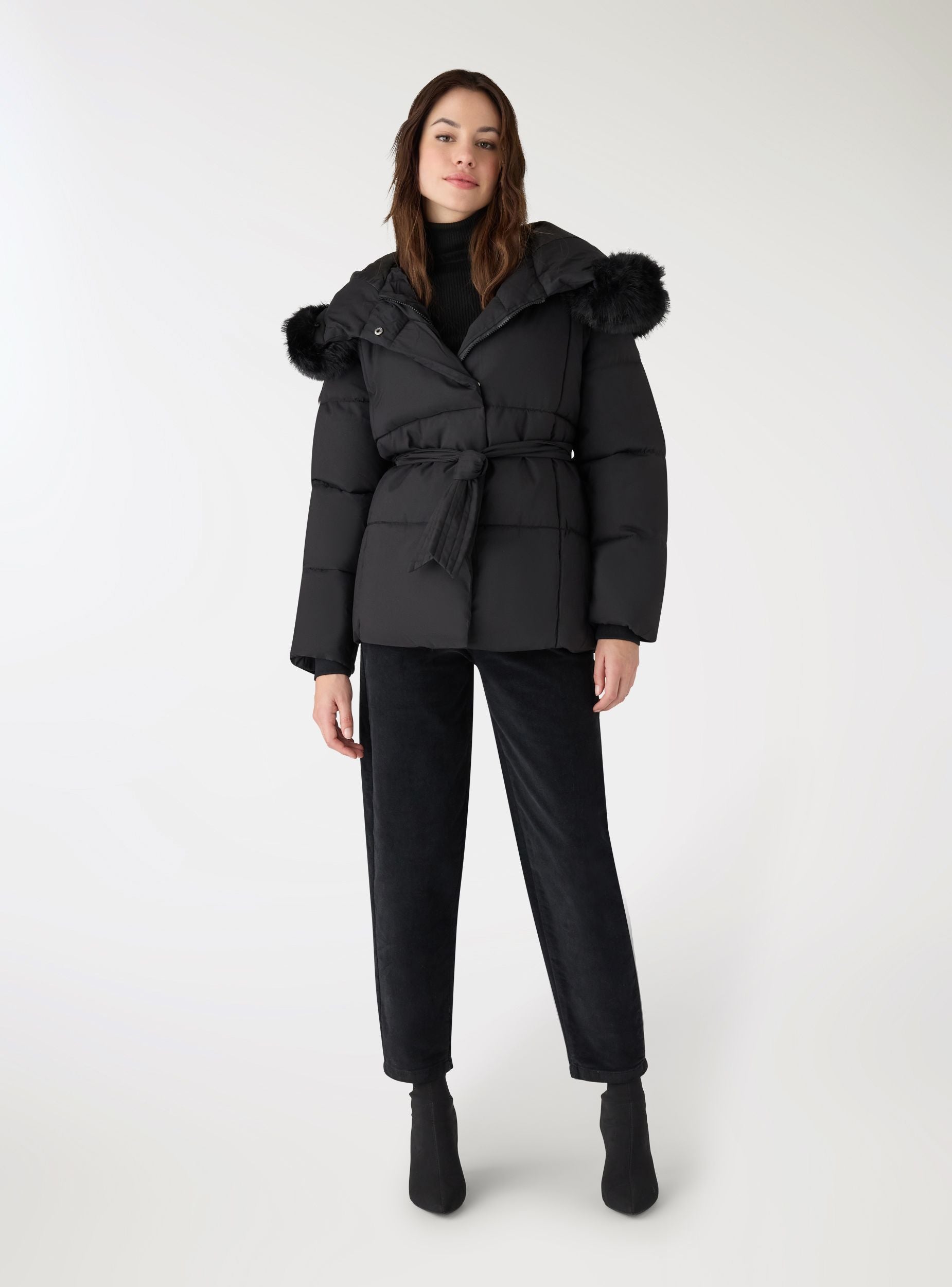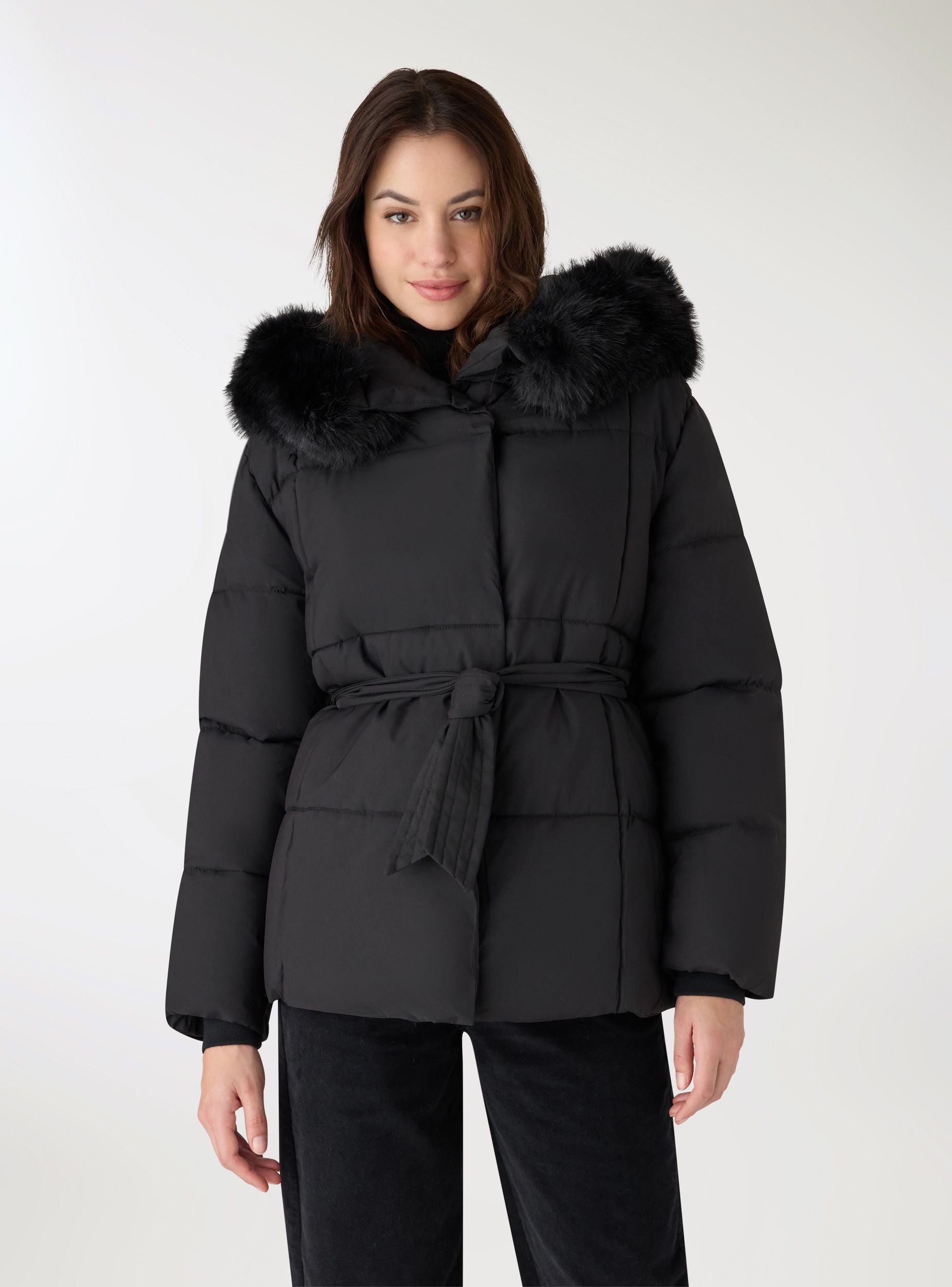 Giubbotto imbottito da donna in tinta unita, con cappuccio bordato e cintura da annodare in vita per valorizzare la silhouette. Design a quadri e maniche lunghe con polsini a coste per maggiore comfort. Ideale per il tempo libero e la città, si abbina a jeans e stivali per look caldi e curati nelle giornate fredde. Chiusura con cintura e tasche laterali discrete.Dettagli