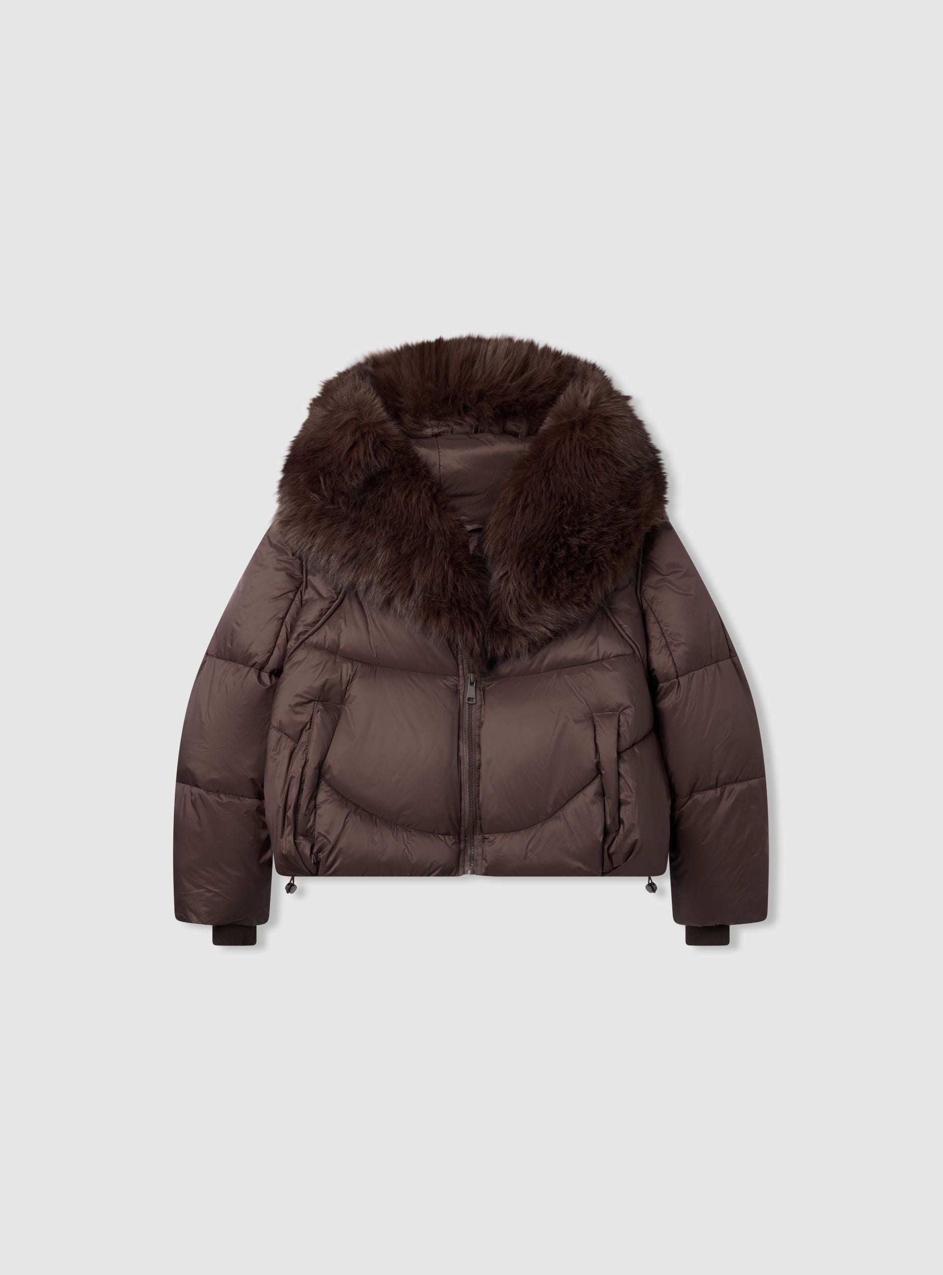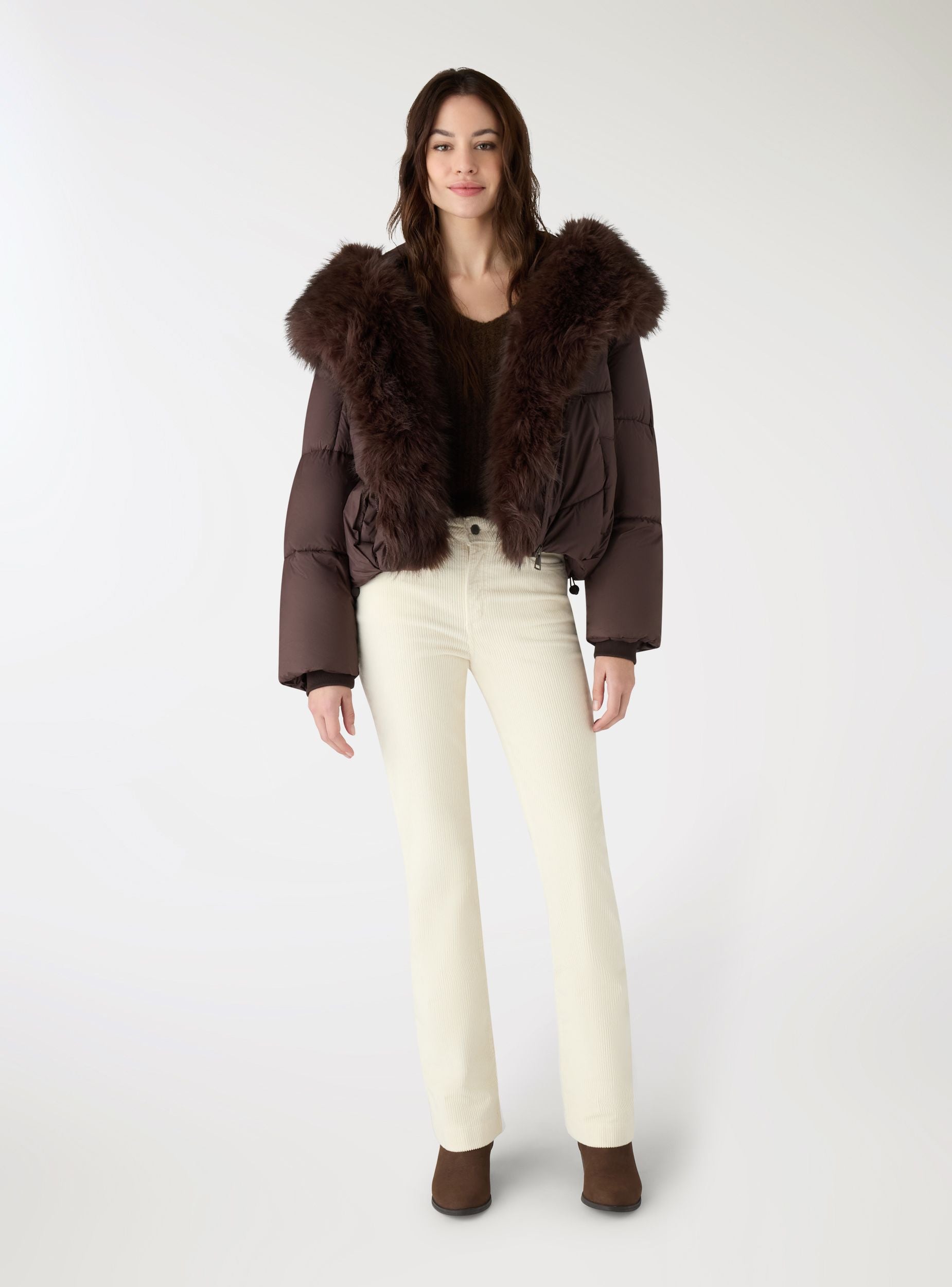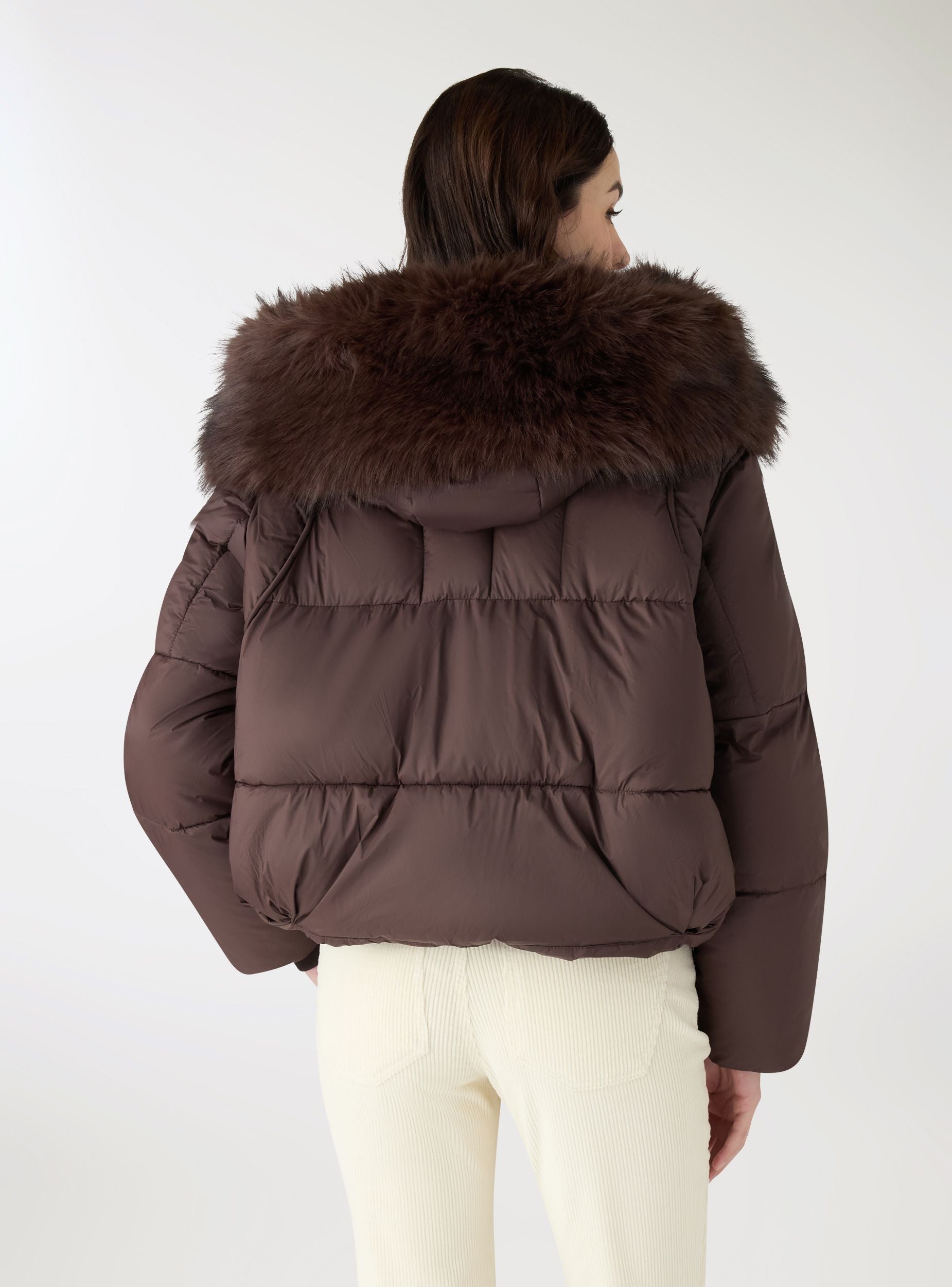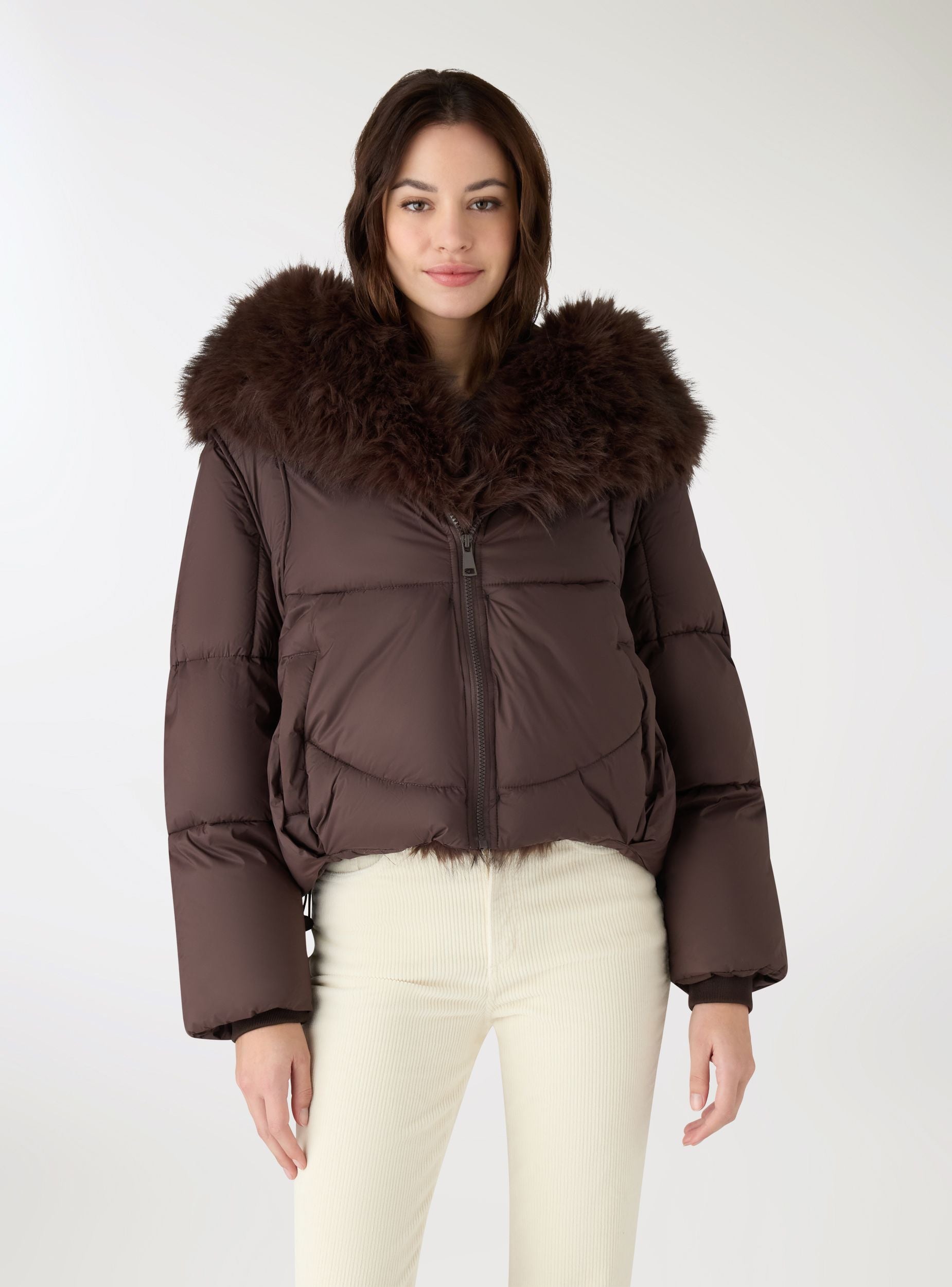 Giubbotto imbottito da donna a tinta unita, lunghezza corta, con cappuccio ampio rifinito da bordo peloso e chiusura con zip frontale. Dal design curvilineo e fondo regolabile con coulisse. Polsi in maglia per maggiore comfort e protezione dal freddo. Ideale per look cittadini e tempo libero, da abbinare a jeans e anfibi o a leggings e stivali per uno stile pratico e accogliente.Dettagli