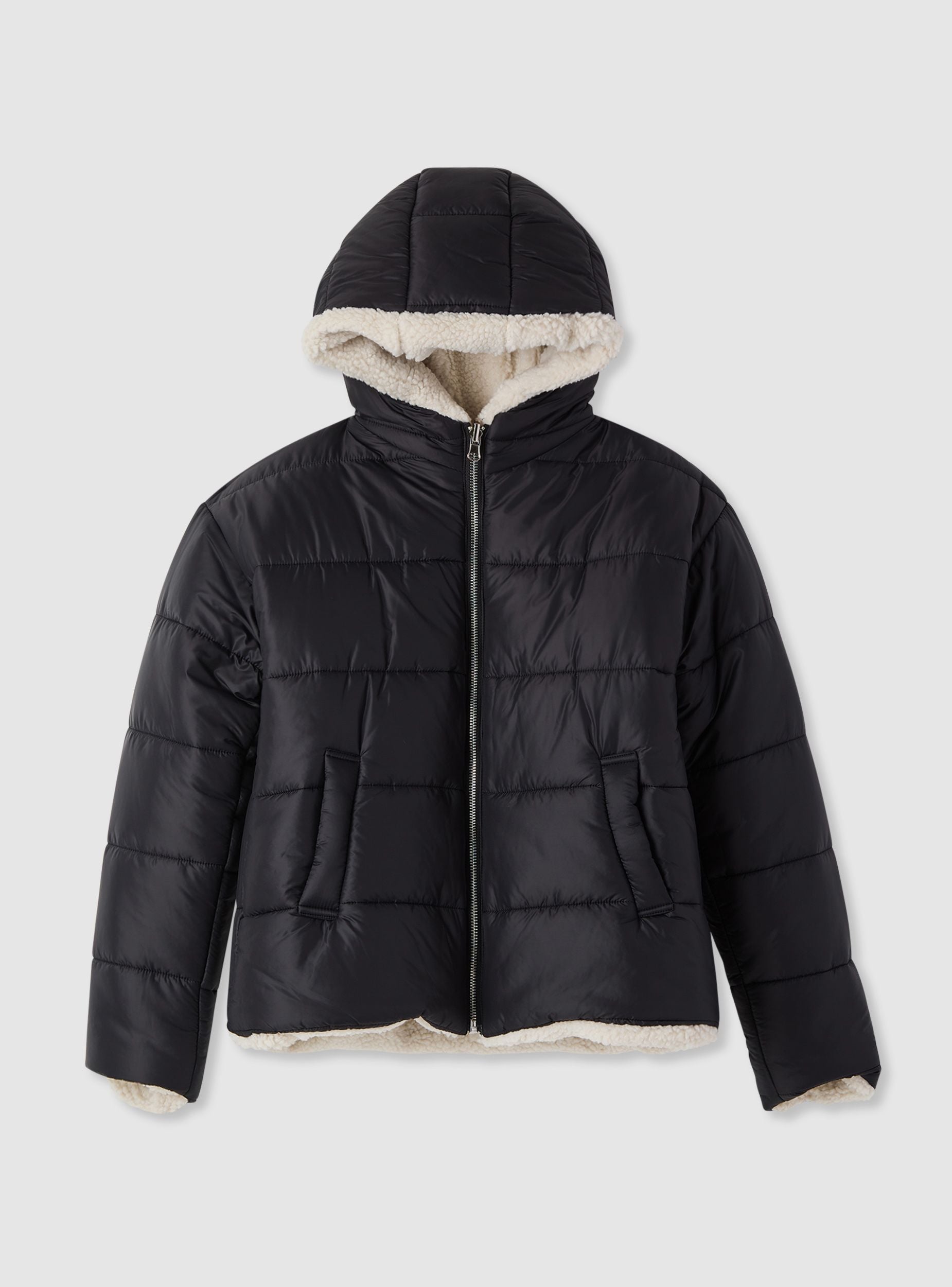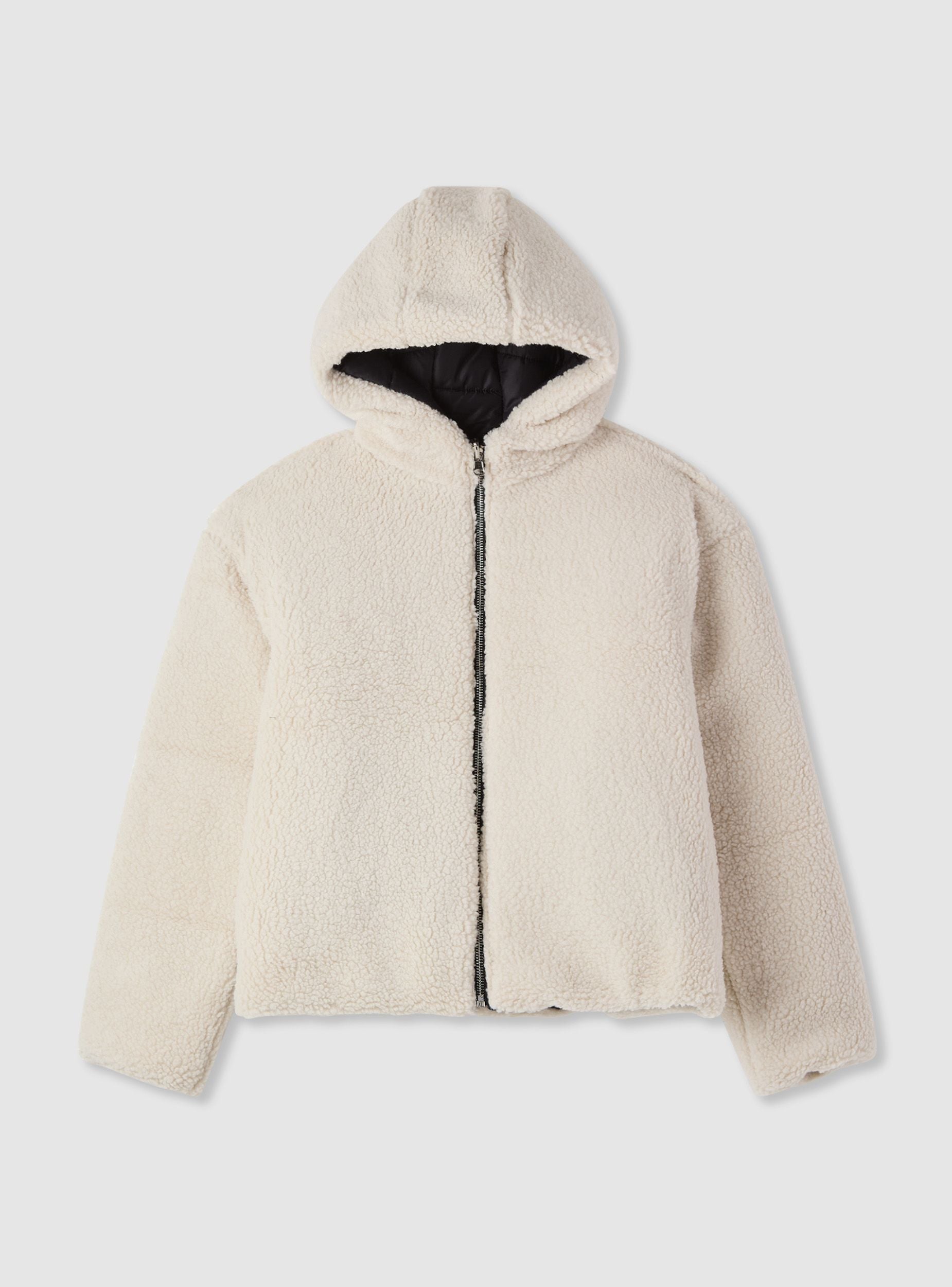 Giubbotto da bambina con cappuccio, imbottito e double face. Un lato trapuntato con chiusura a zip frontale e tasche laterali inclinate, l’altro in morbido effetto peluche per un look diverso ogni giorno. Vestibilità regular, ideale per la scuola e il tempo libero nelle giornate fredde. Design a tinta unita facile da abbinare a jeans e pantaloncini, perfetto sopra maglietta o felpa.Dettagli