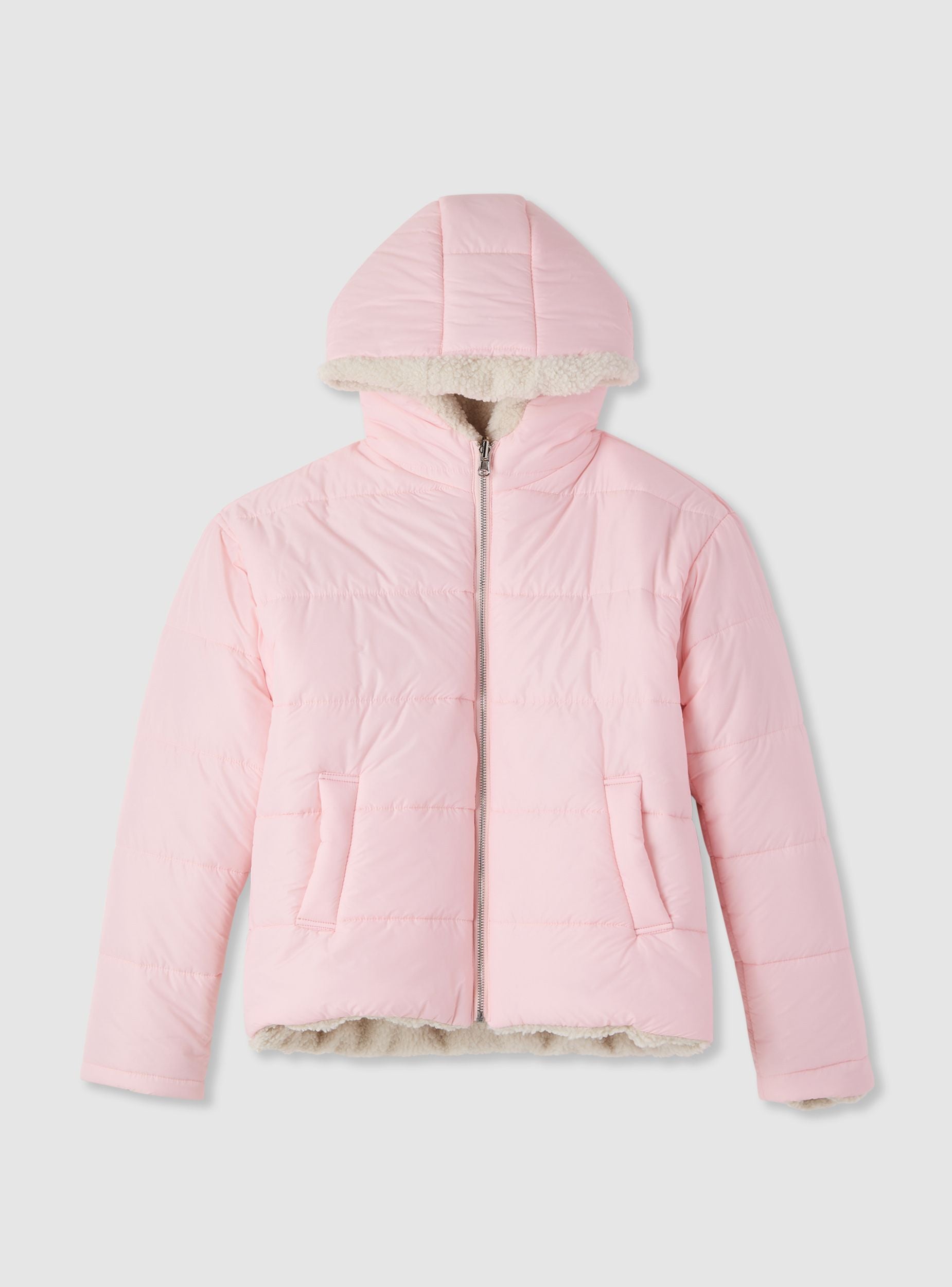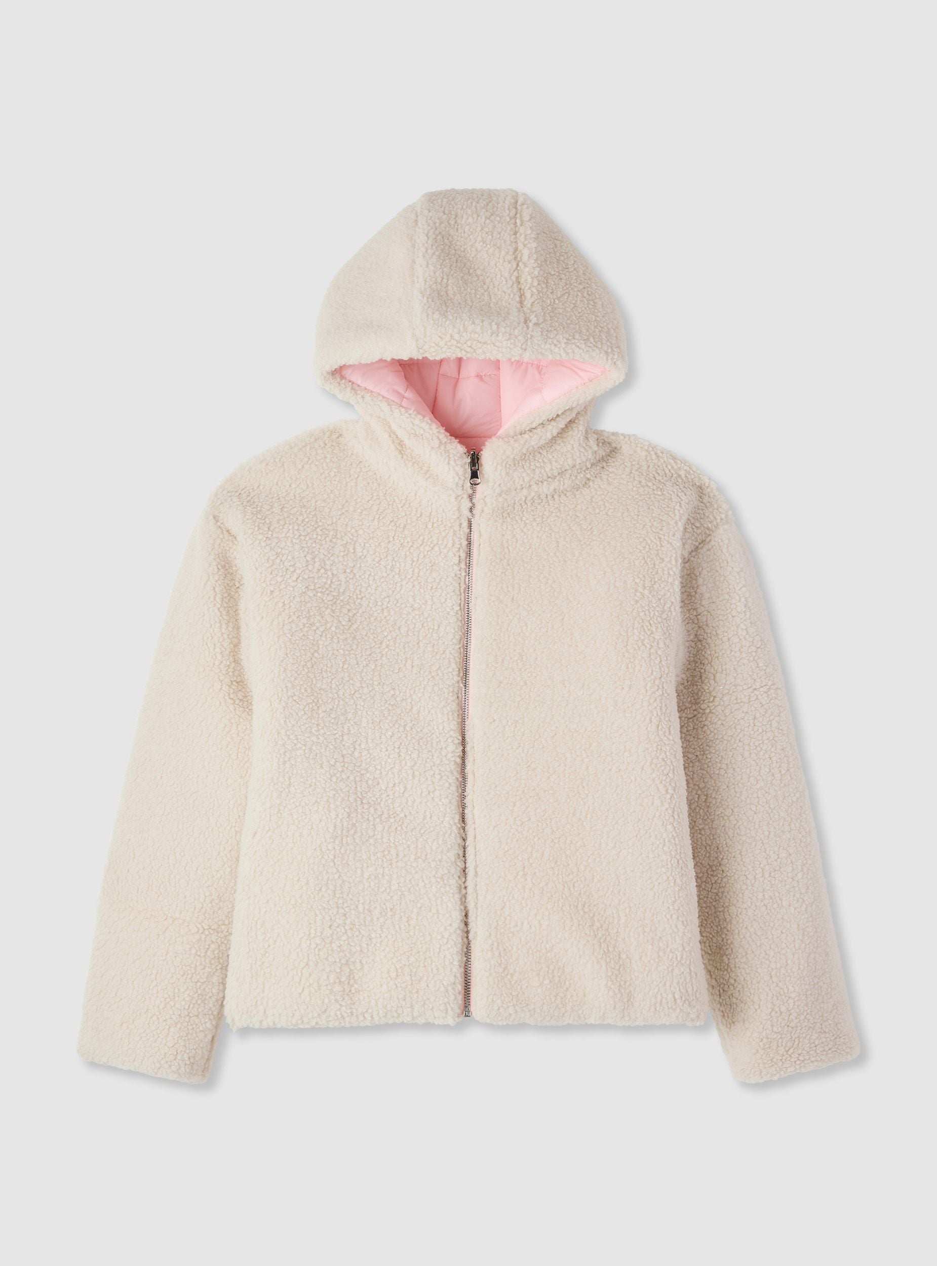 Giubbotto da bambina con cappuccio, imbottito e double face. Un lato trapuntato con chiusura a zip frontale e tasche laterali inclinate, l’altro in morbido effetto peluche per un look diverso ogni giorno. Vestibilità regular, ideale per la scuola e il tempo libero nelle giornate fredde. Design a tinta unita facile da abbinare a jeans e pantaloncini, perfetto sopra maglietta o felpa.Dettagli