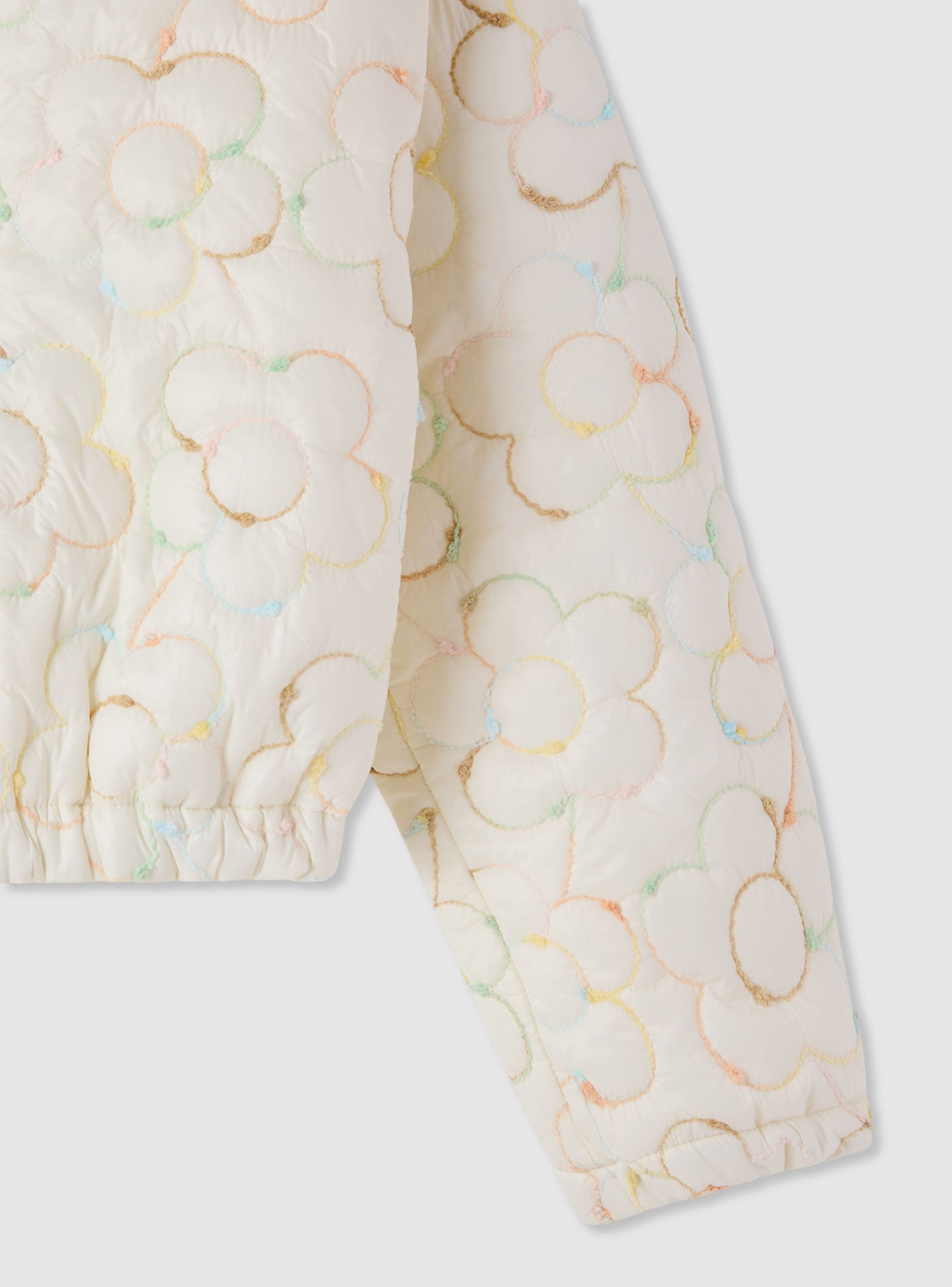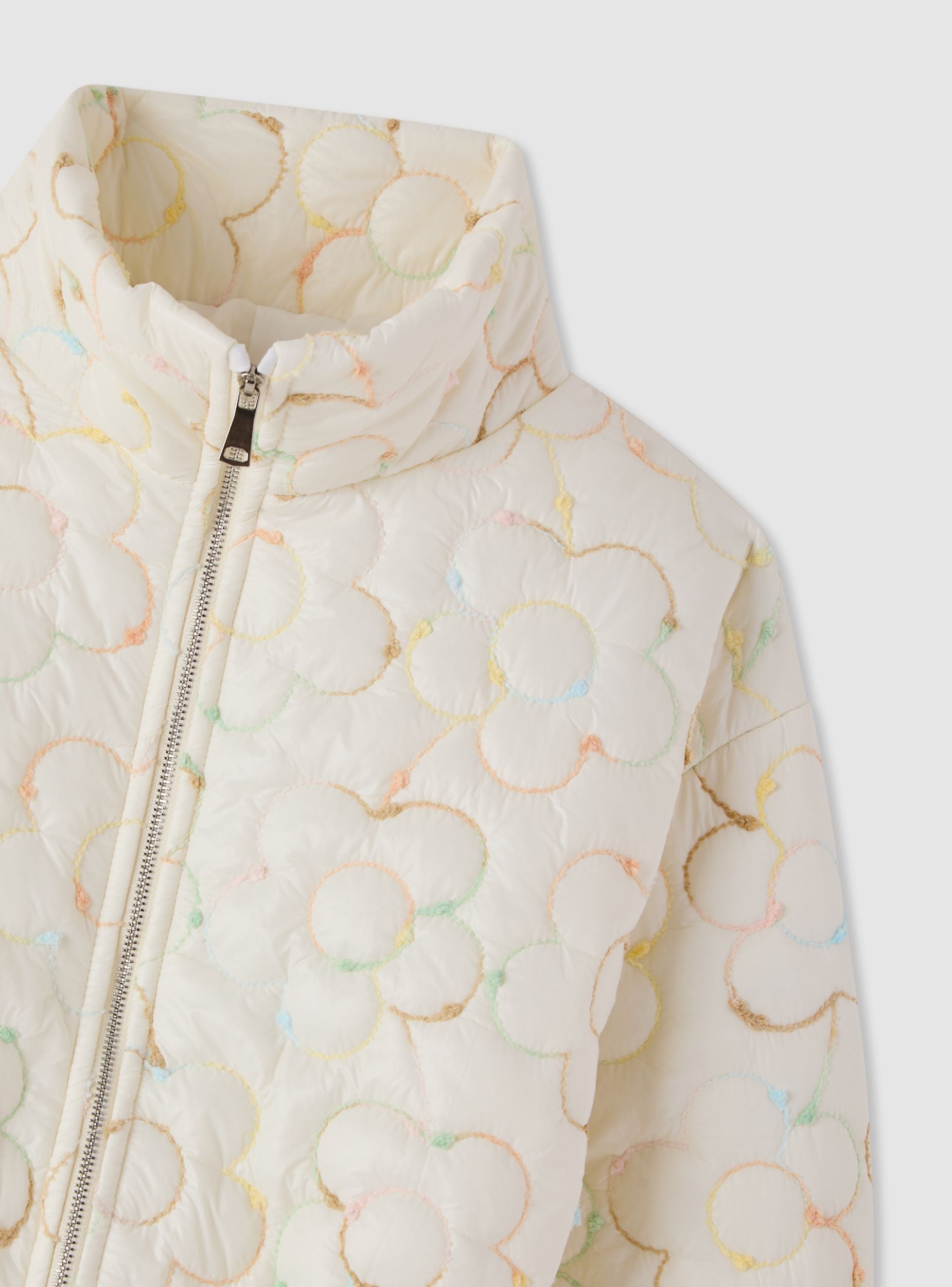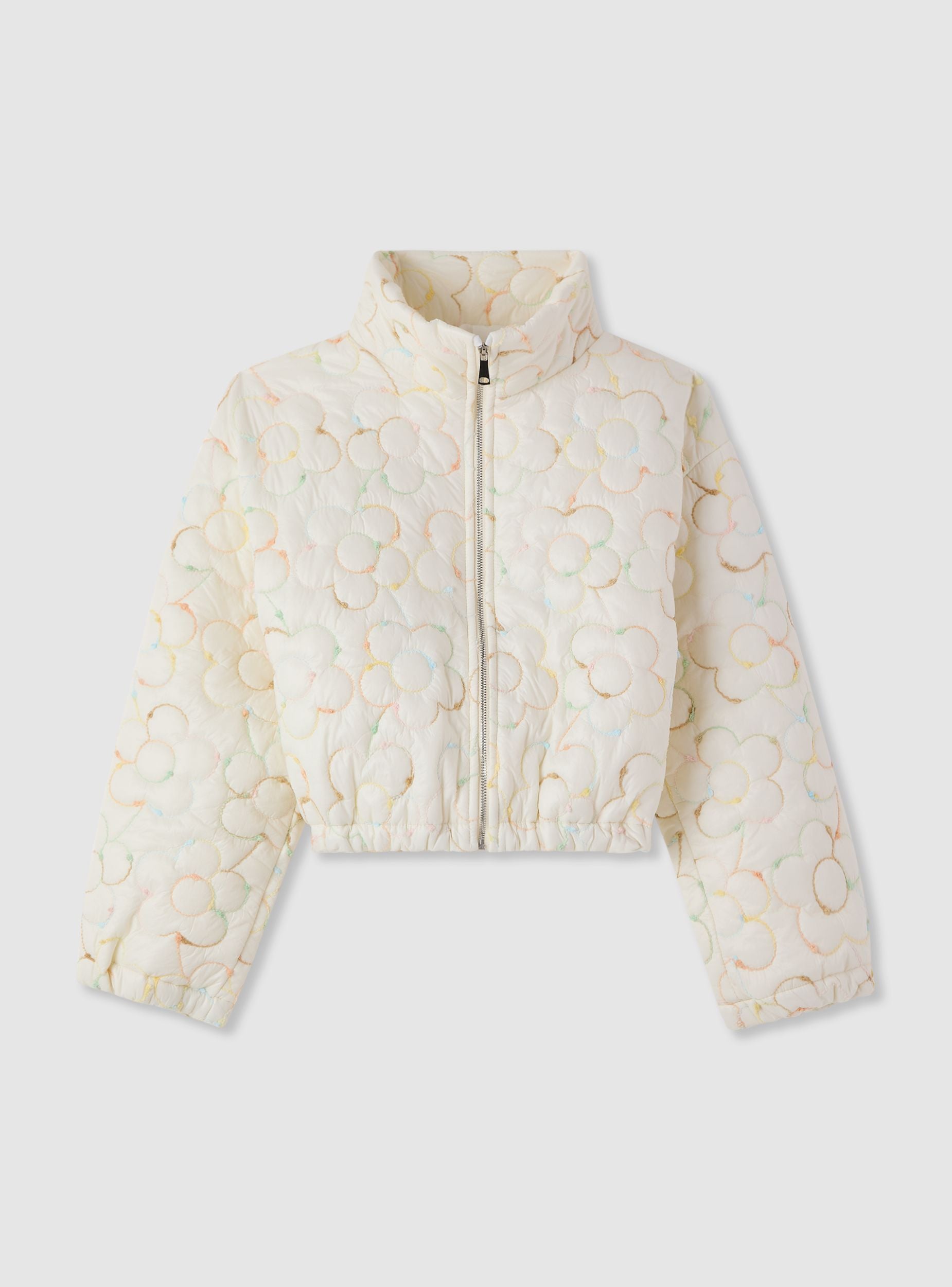 Giubbotto imbottito da bambina a tinta unita con stampa fiori. Collo alto avvolgente e chiusura frontale con zip, elastico al fondo e ai polsi per una vestibilità comoda. Perfetto per il tempo libero e per completare look casual con jeans e sneakers, aggiunge un tocco giocoso grazie alla fantasia floreale trapuntata.Dettagli