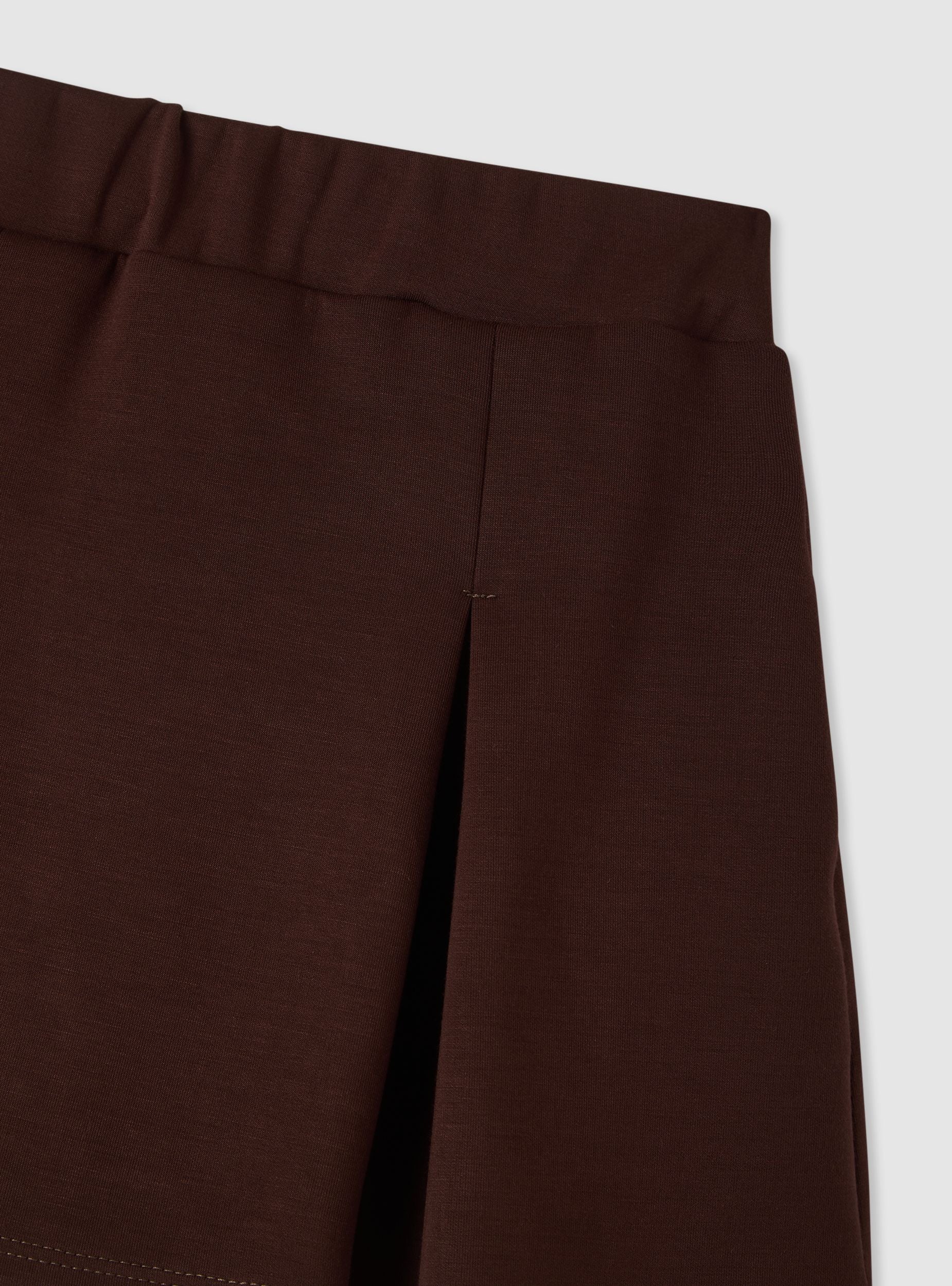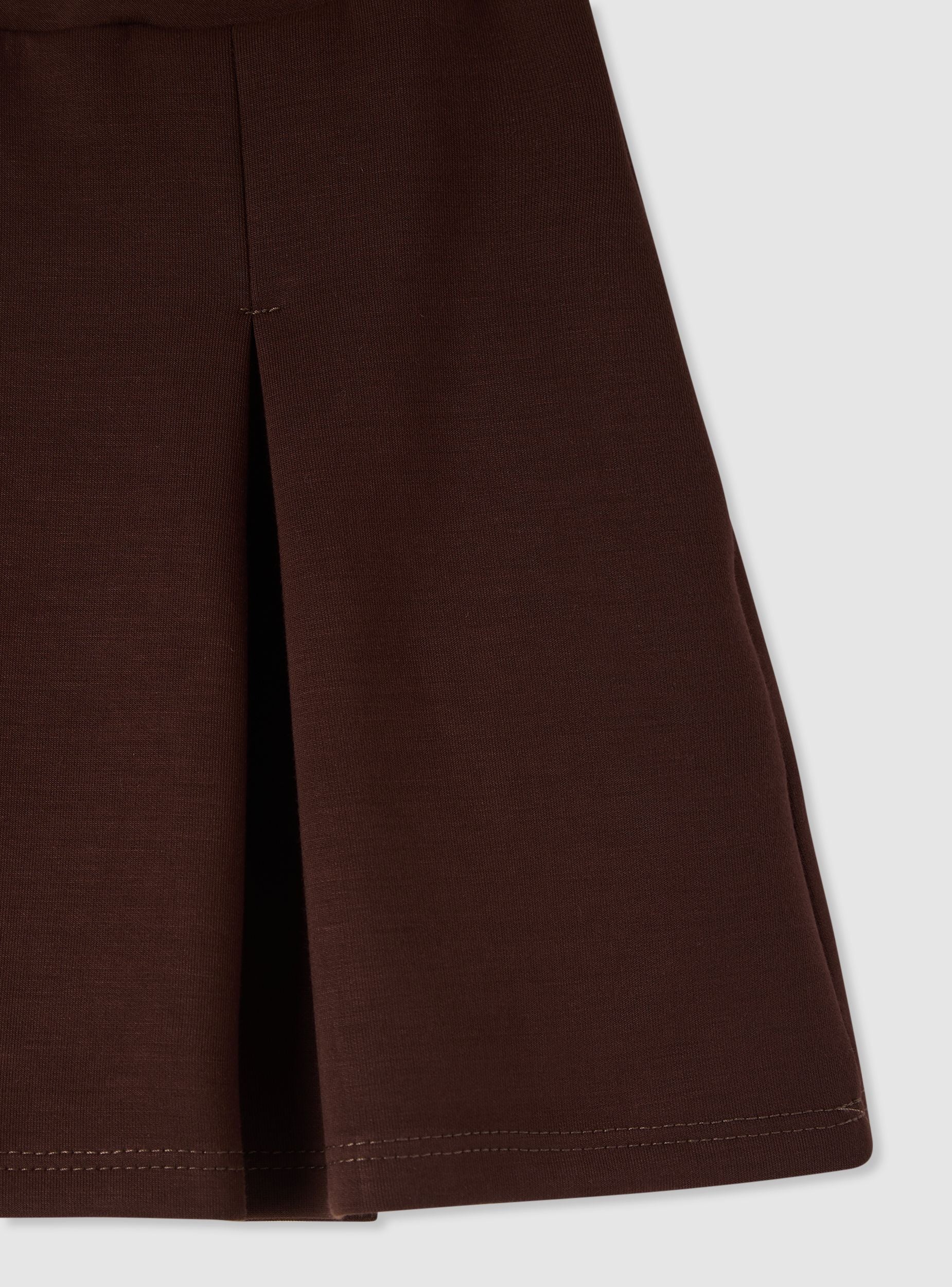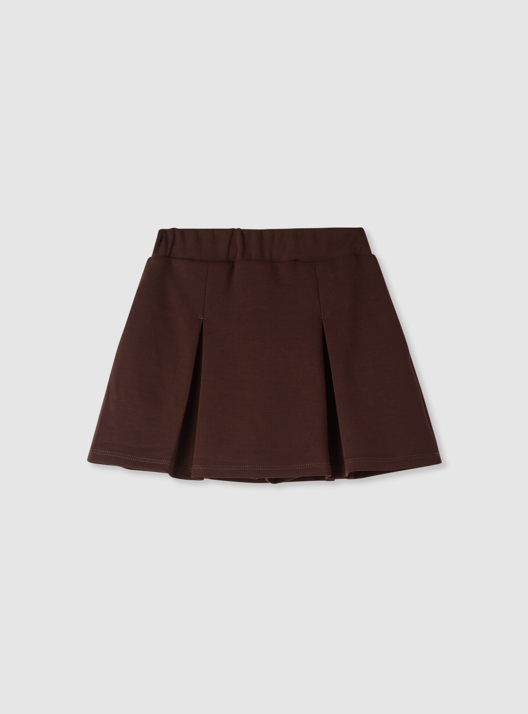 Gonna da bambina a tinta unita con pieghe frontali e fascia in vita elasticizzata, pensata per scuola e tempo libero. Lunghezza mini e linea svasata che facilita il movimento. Si abbina a maglietta e cardigan o a felpa per look casual. Dettagli puliti e cuciture visibili sull’orlo valorizzano il design essenziale.Dettagli