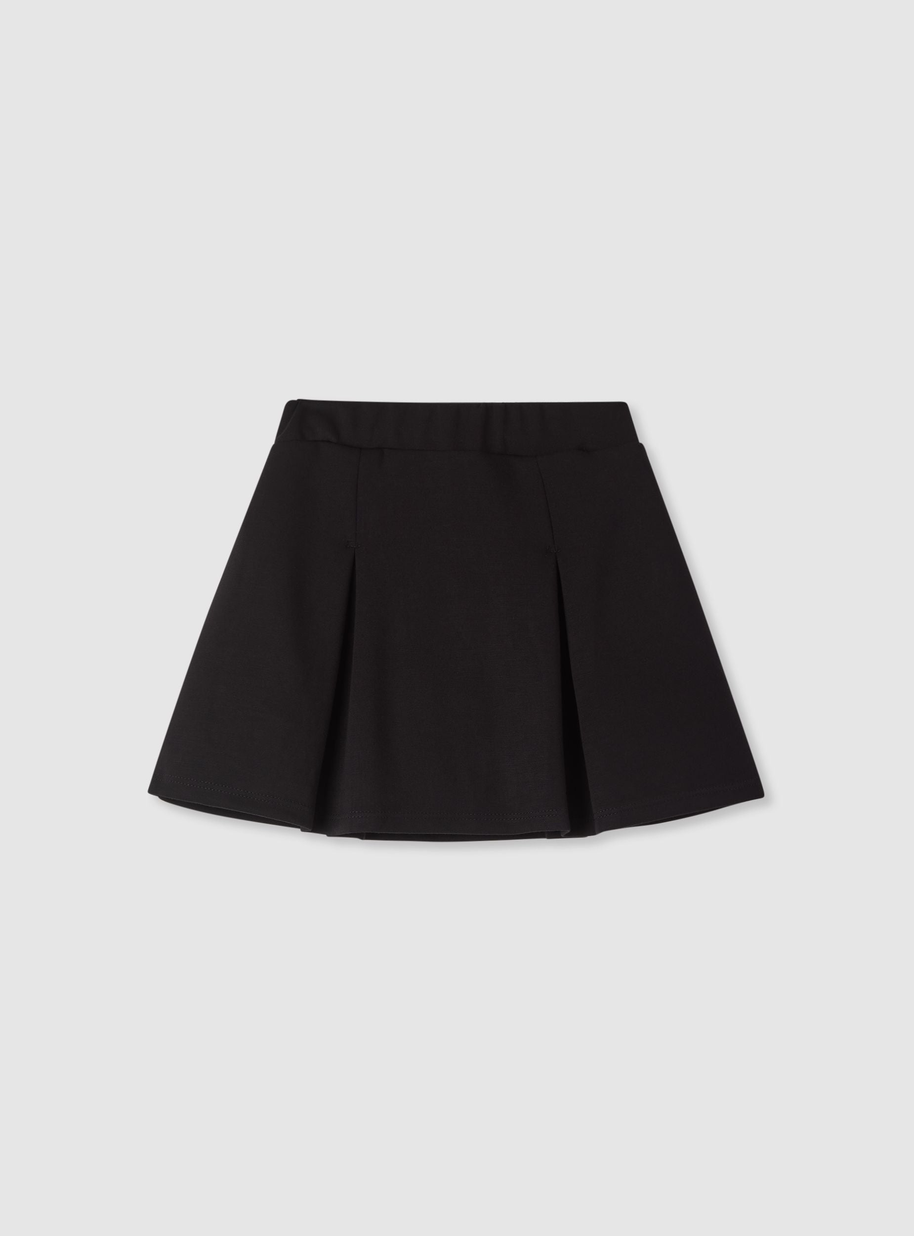 Gonna da bambina a tinta unita con pieghe frontali e fascia in vita elasticizzata, pensata per scuola e tempo libero. Lunghezza mini e linea svasata che facilita il movimento. Si abbina a maglietta e cardigan o a felpa per look casual. Dettagli puliti e cuciture visibili sull’orlo valorizzano il design essenziale.Dettagli