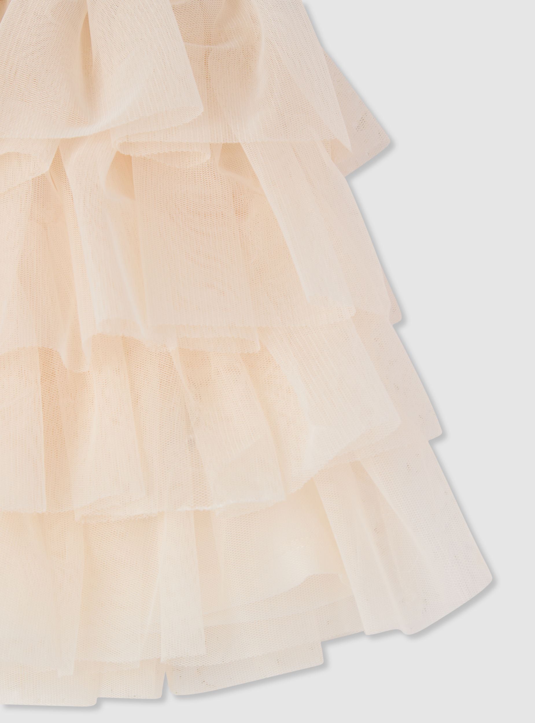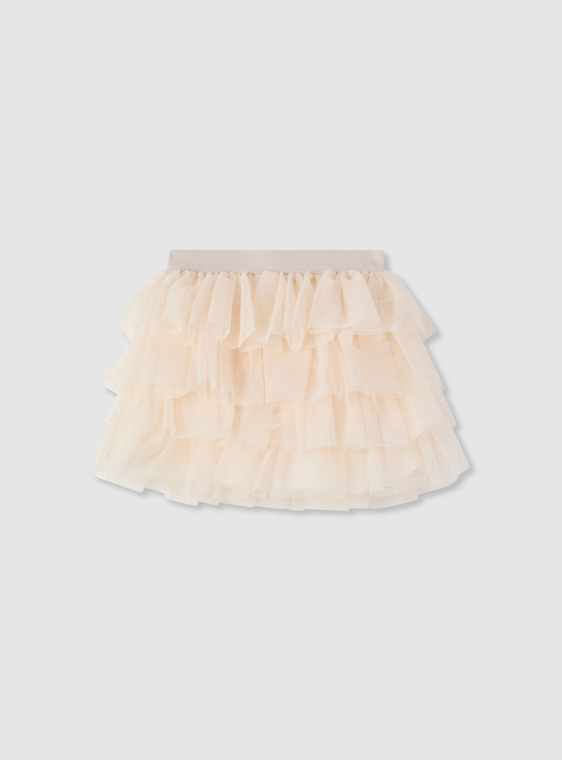 Gonna da bambina con strati di tulle a balze. Modello mini dal design svasato, perfetto per cerimonie, feste o per aggiungere un tocco romantico agli outfit quotidiani. Si abbina a una maglietta e ballerine per il giorno o a una camicia e cardigan per occasioni speciali.Dettagli