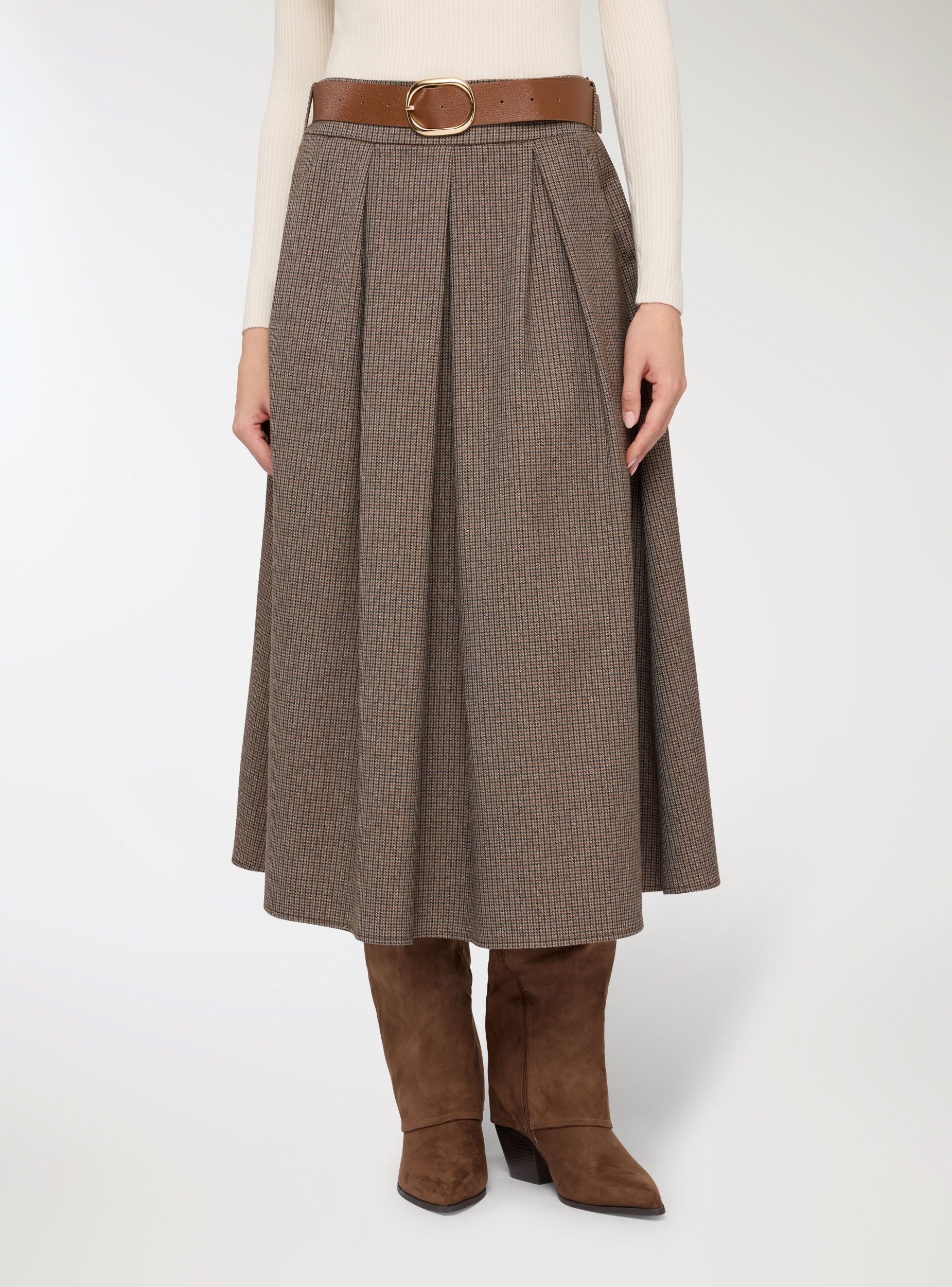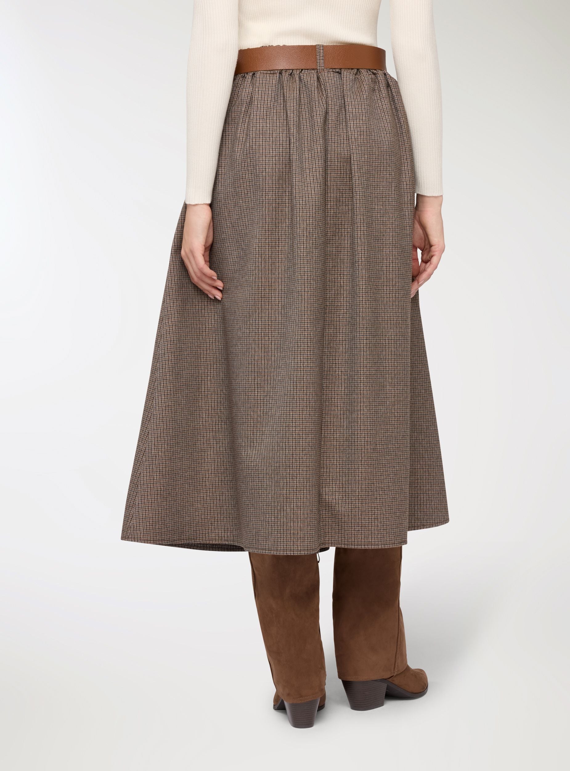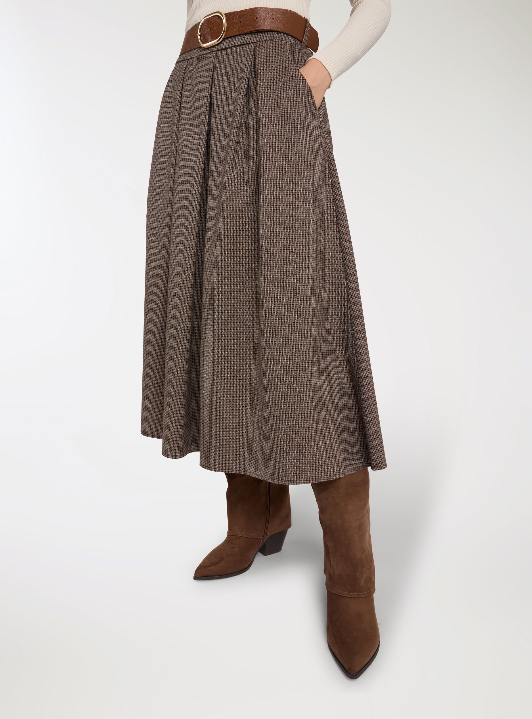 Gonna da donna a fantasia pied de poule, lunghezza midi e linea svasata che valorizza la figura. Vita media con cintura coordinata e fibbia metallica, comoda da regolabile. Tasche laterali e pieghe frontali che aggiungono movimento. Perfetta in ufficio con camicia e stivaletti o nel tempo libero con maglietta e cardigan.Dettagli