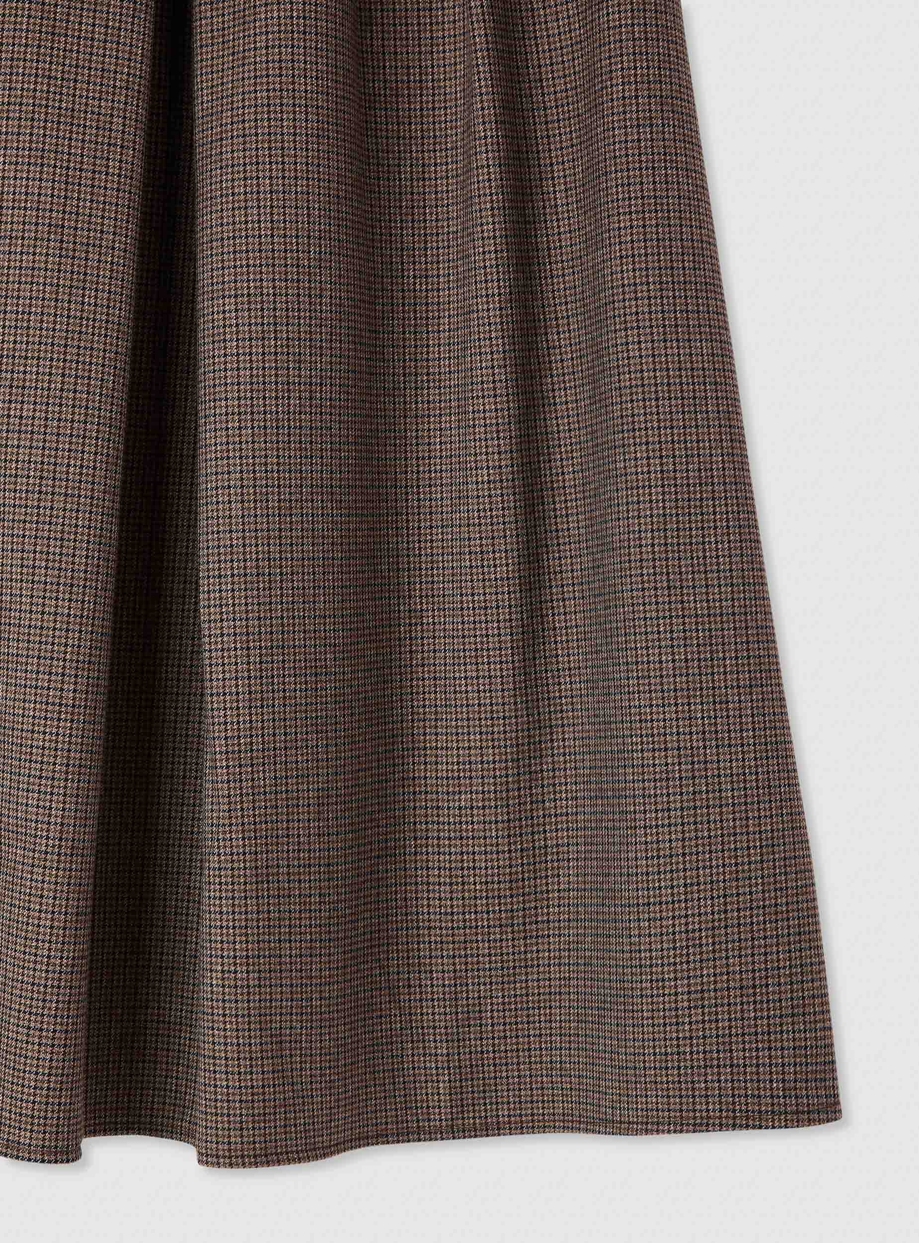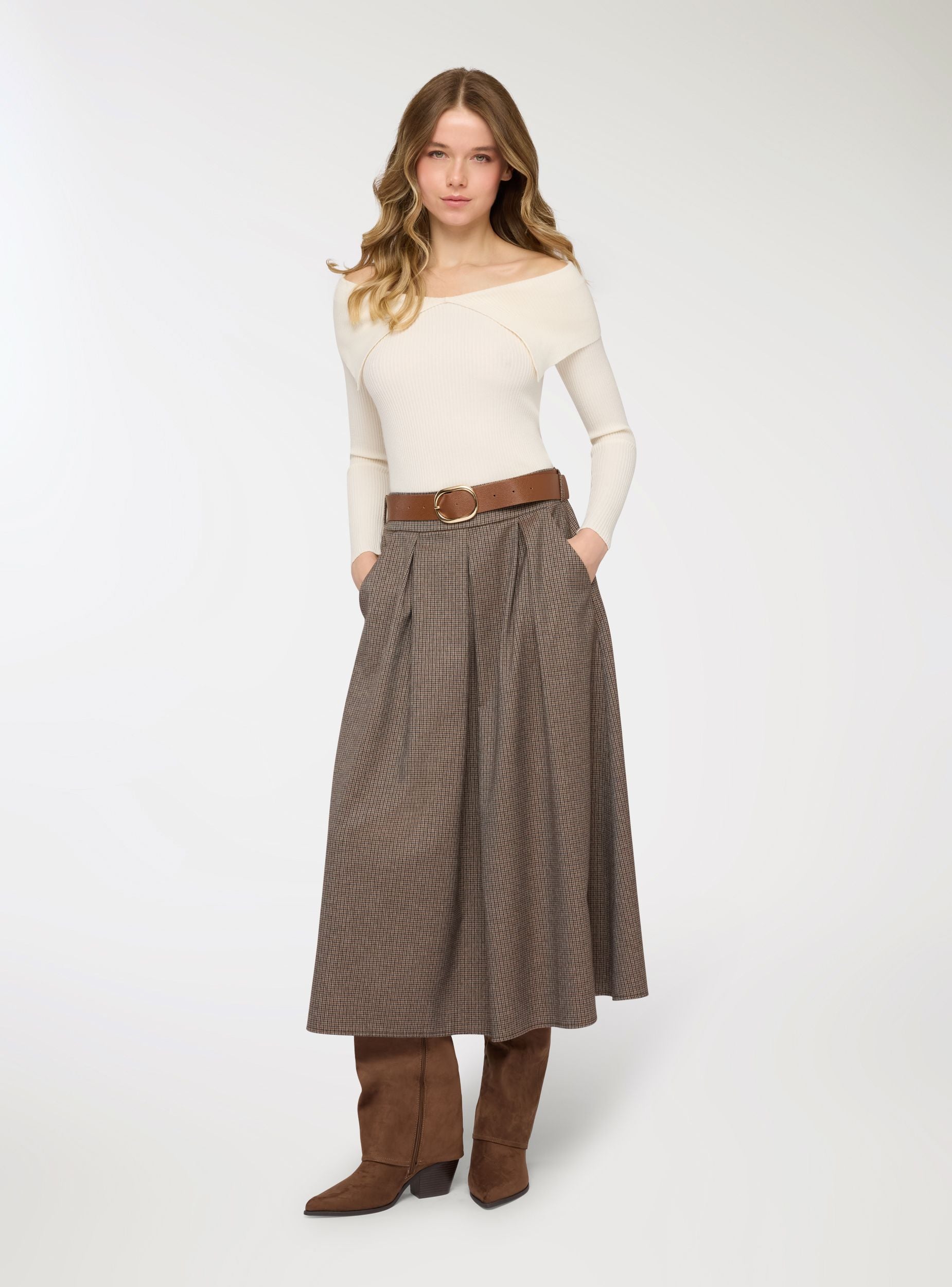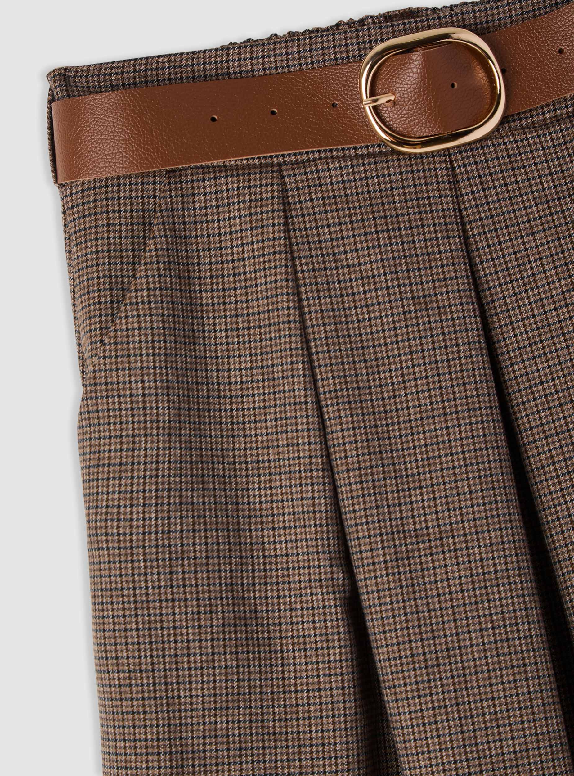 Gonna da donna a fantasia pied de poule, lunghezza midi e linea svasata che valorizza la figura. Vita media con cintura coordinata e fibbia metallica, comoda da regolabile. Tasche laterali e pieghe frontali che aggiungono movimento. Perfetta in ufficio con camicia e stivaletti o nel tempo libero con maglietta e cardigan.Dettagli