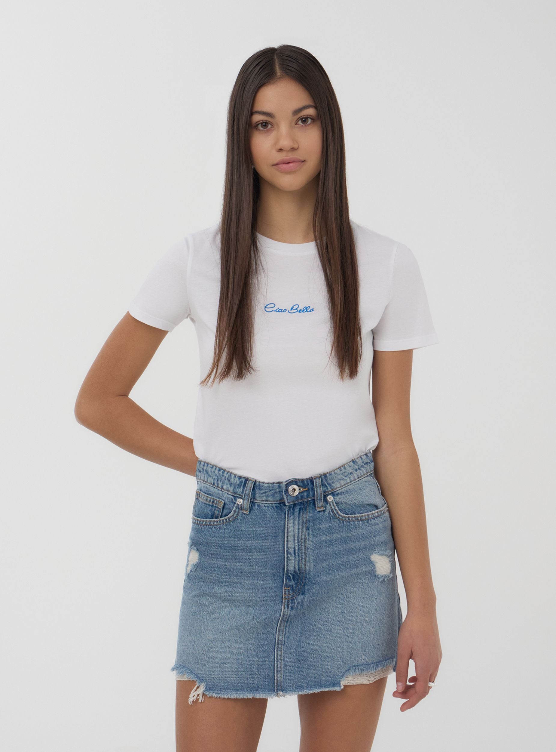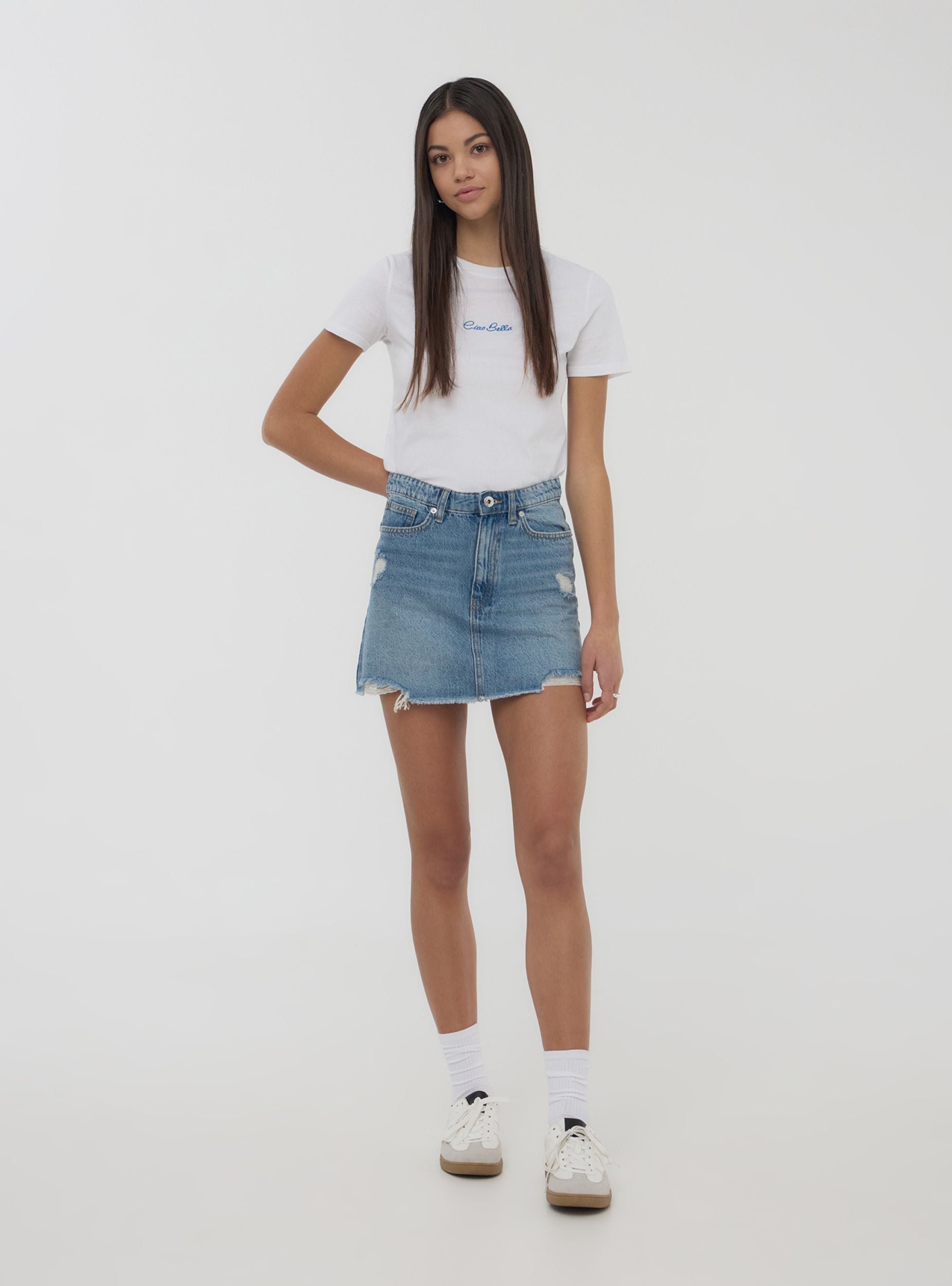 Gonna corta da donna dallo stile grintoso e attuale, caratterizzata da una tinta unita con lavaggio denim medio e dettagli effetto vissuto. Il design a cinque tasche unisce praticità ed estetica, mentre gli strappi e l’orlo sfrangiato aggiungono un tocco audace. Dotata di chiusura con bottone e zip e passanti in vita per una vestibilità regolabile. Perfetta con una t-shirt e sneakers per il giorno o con un top e sandali per un look più curato.Dettagli