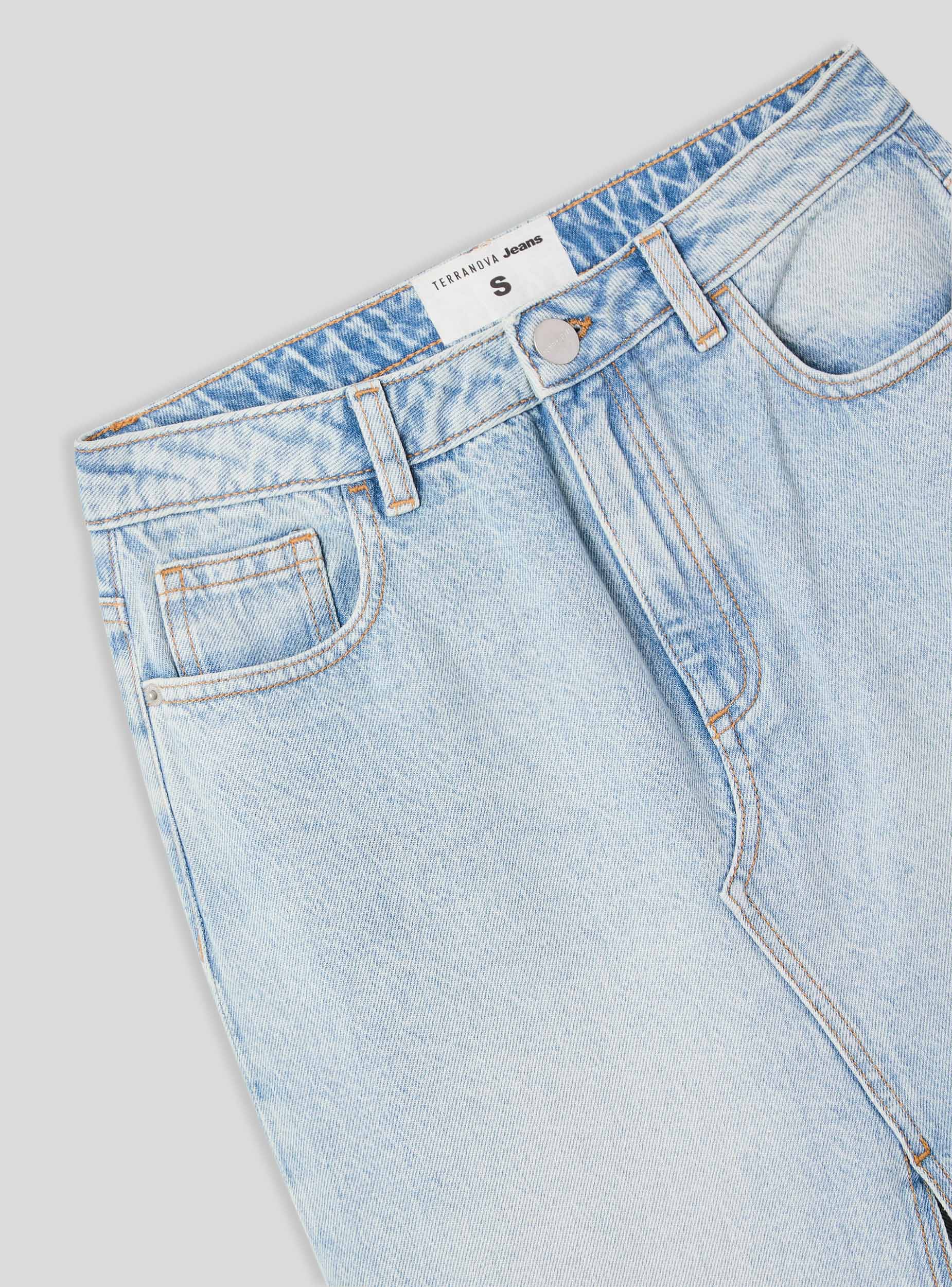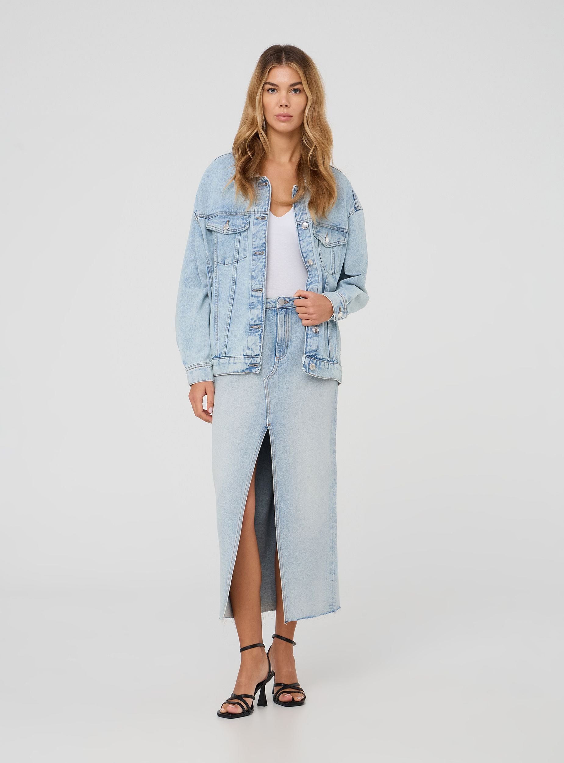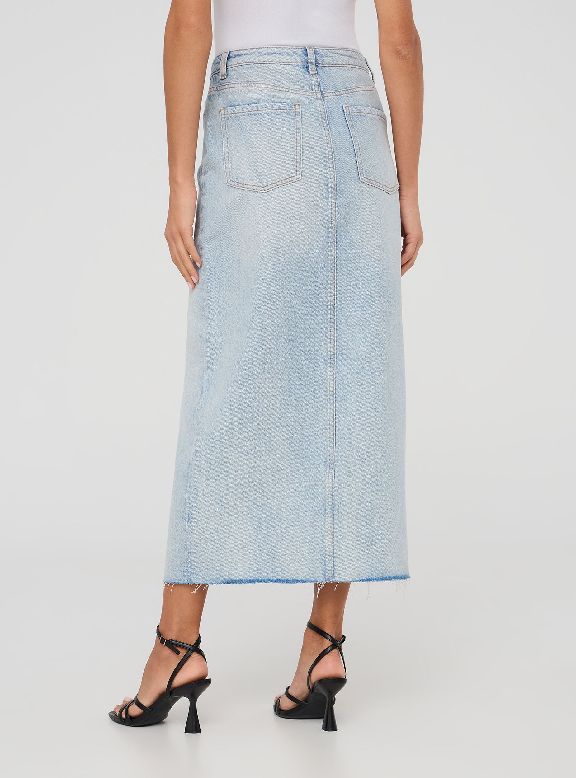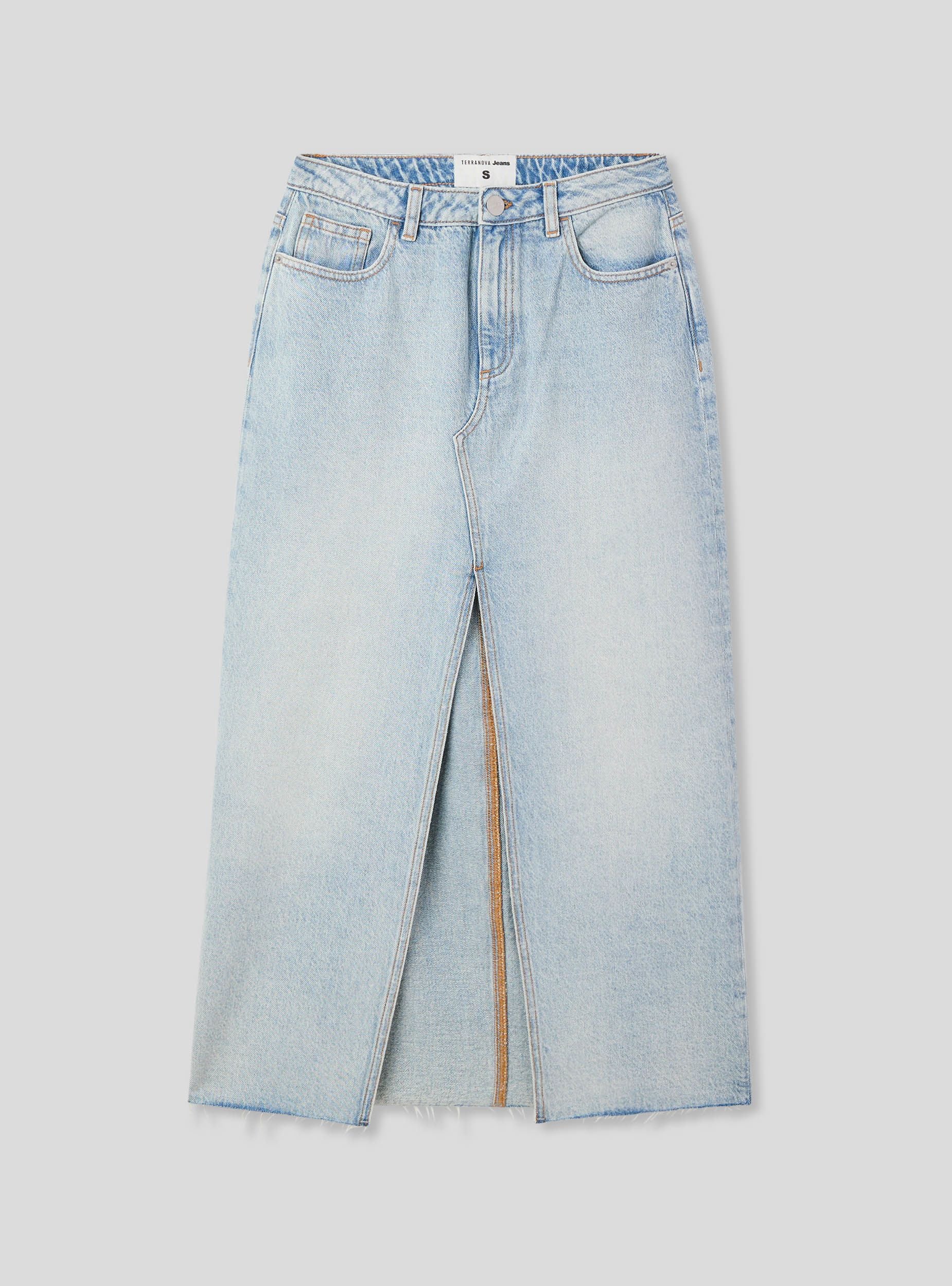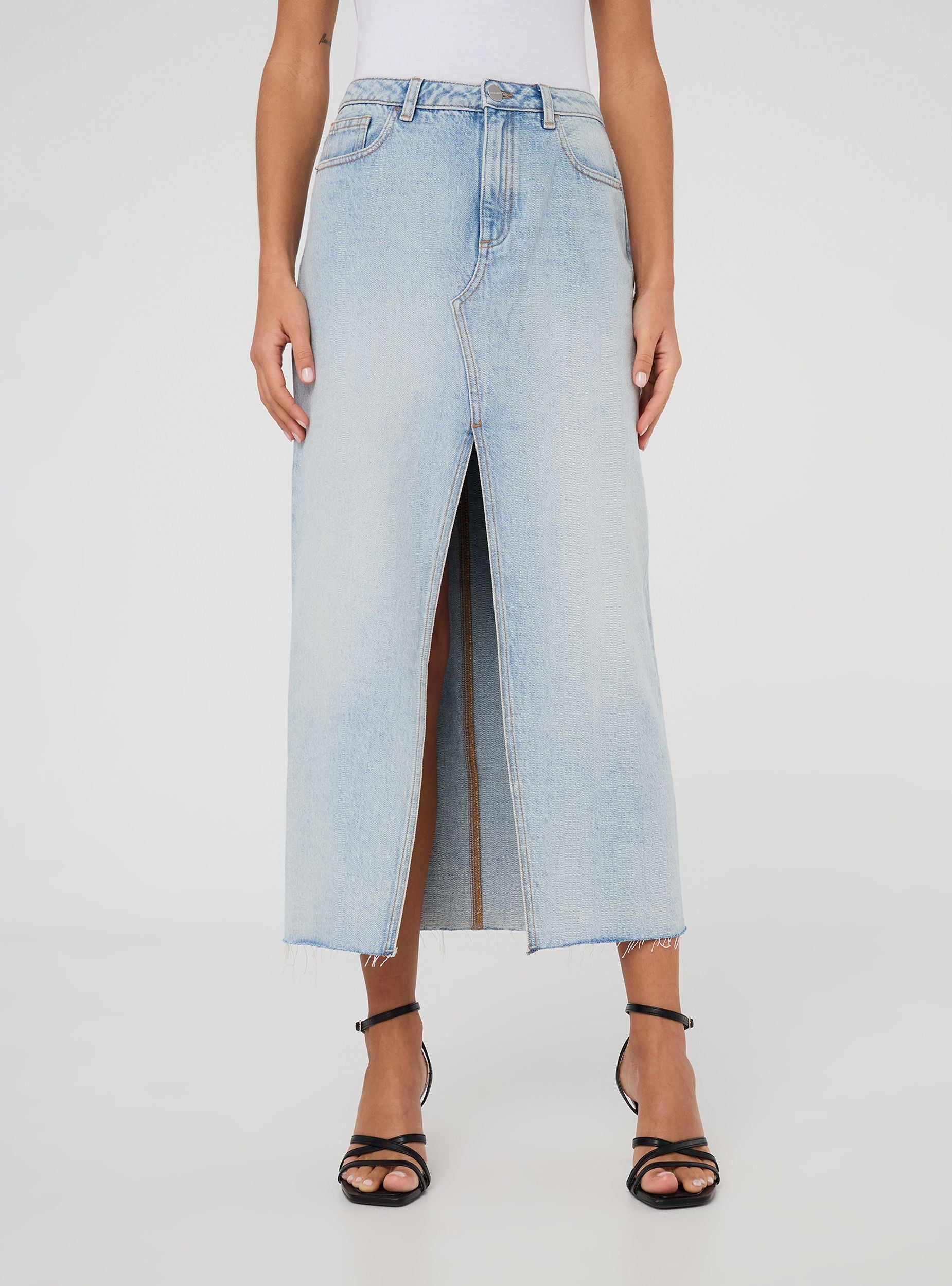 Gonna da donna a tinta unita, dalla linea lunga e femminile, realizzata in denim chiaro. Caratterizzata da uno spacco frontale che aggiunge un tocco moderno e versatile. Dotata di chiusura con bottone e zip, passanti in vita e cinque tasche pratiche, è perfetta per un look casual e disinvolto, adatta a ogni occasione.Dettagli
