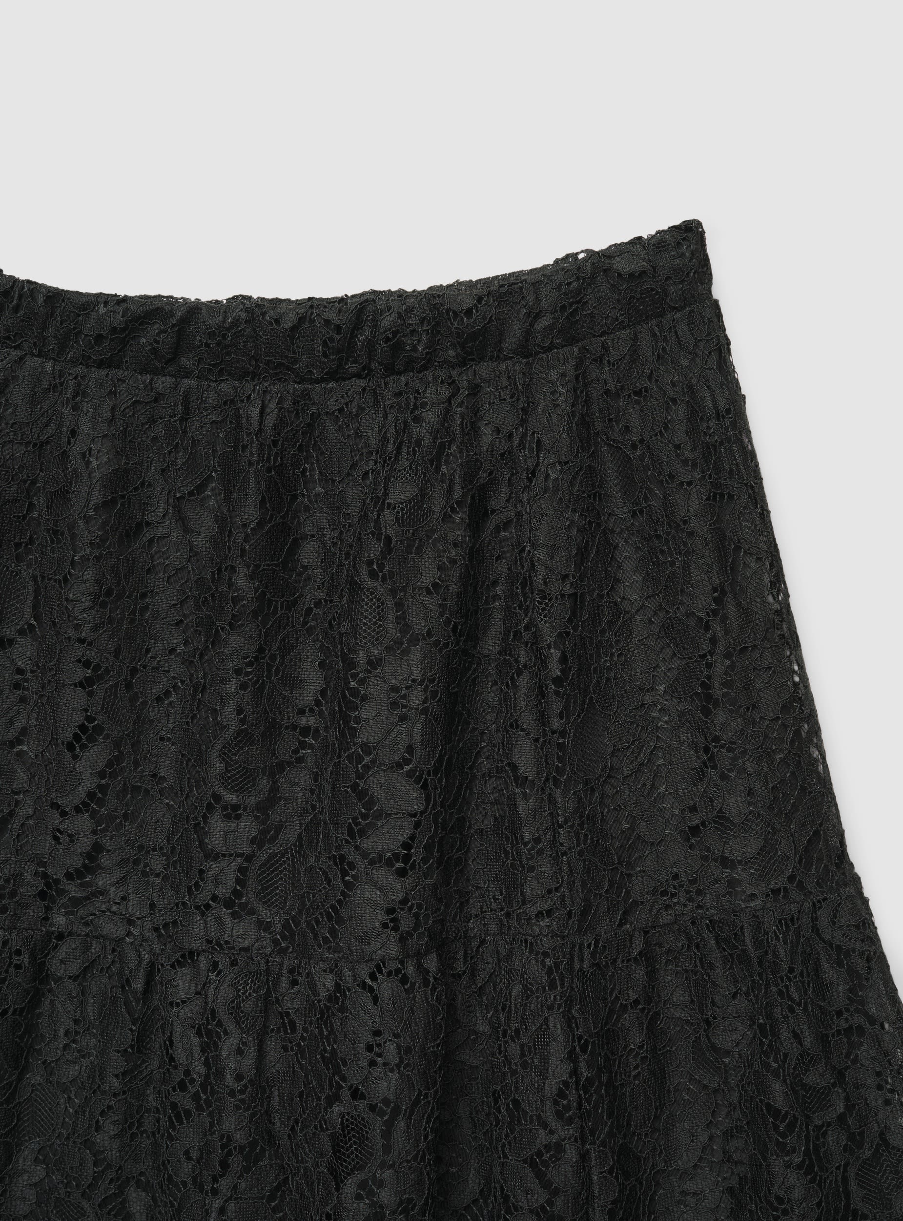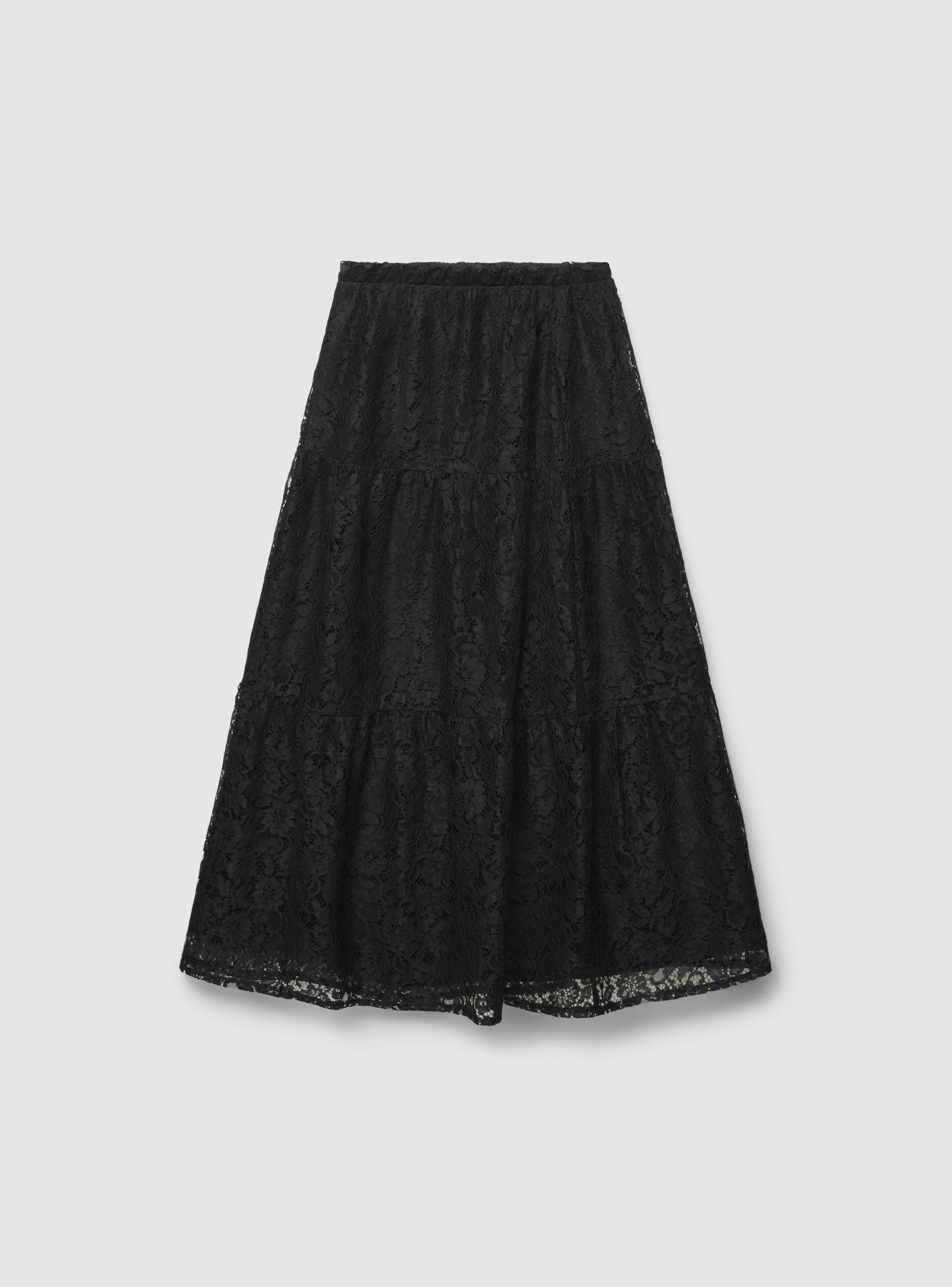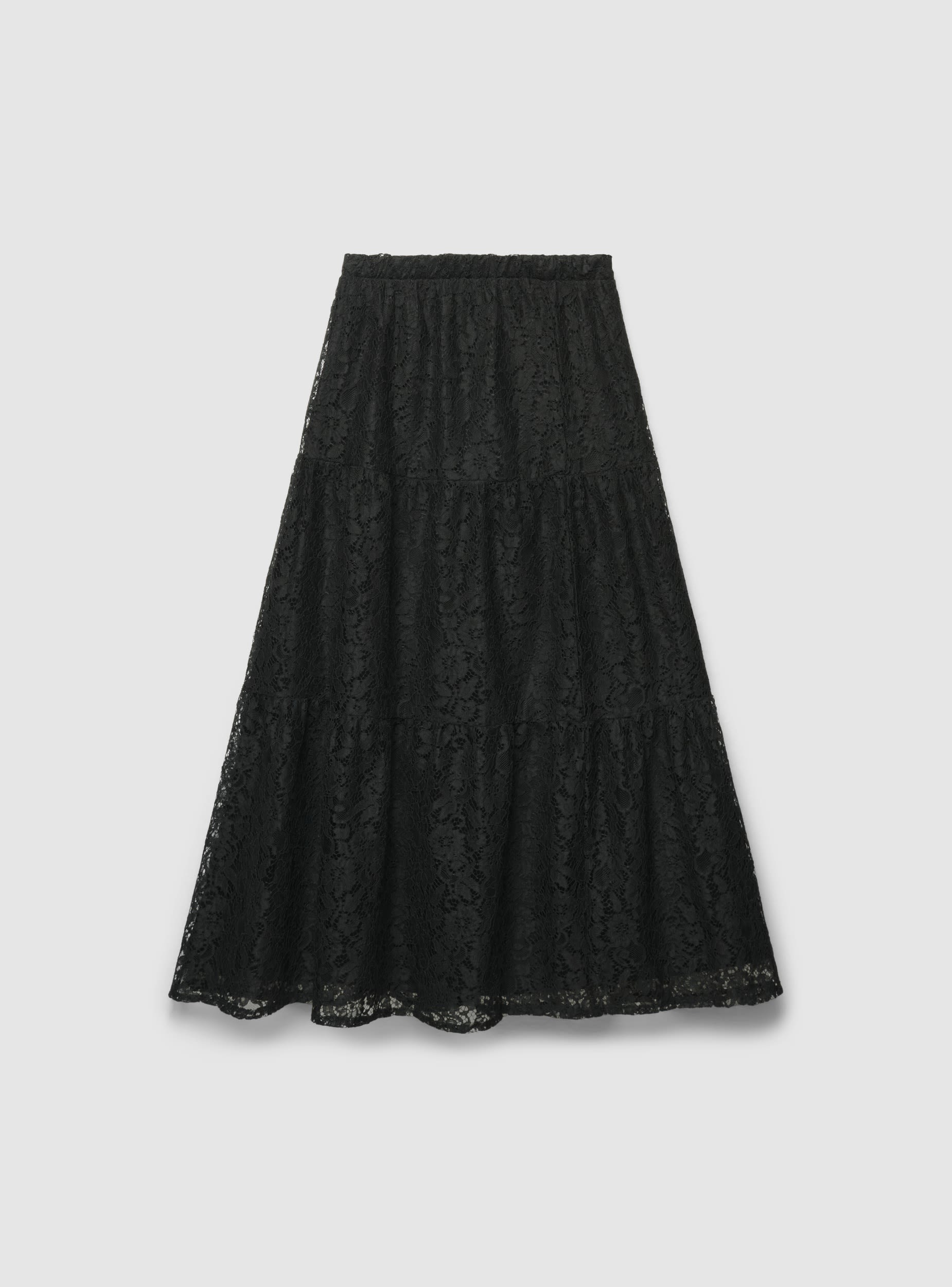 Gonna da donna in pizzo, lunghezza lunga e silhouette svasata con balze a livelli. Vita con elastico per una vestibilità confortevole e facile da indossare. Perfetta per cerimonie, serate e occasioni speciali, si abbina a camicie morbide o top aderenti e sandali. Design a tinta unita con lavorazione floreale in pizzo che dona movimento e femminilità.Dettagli