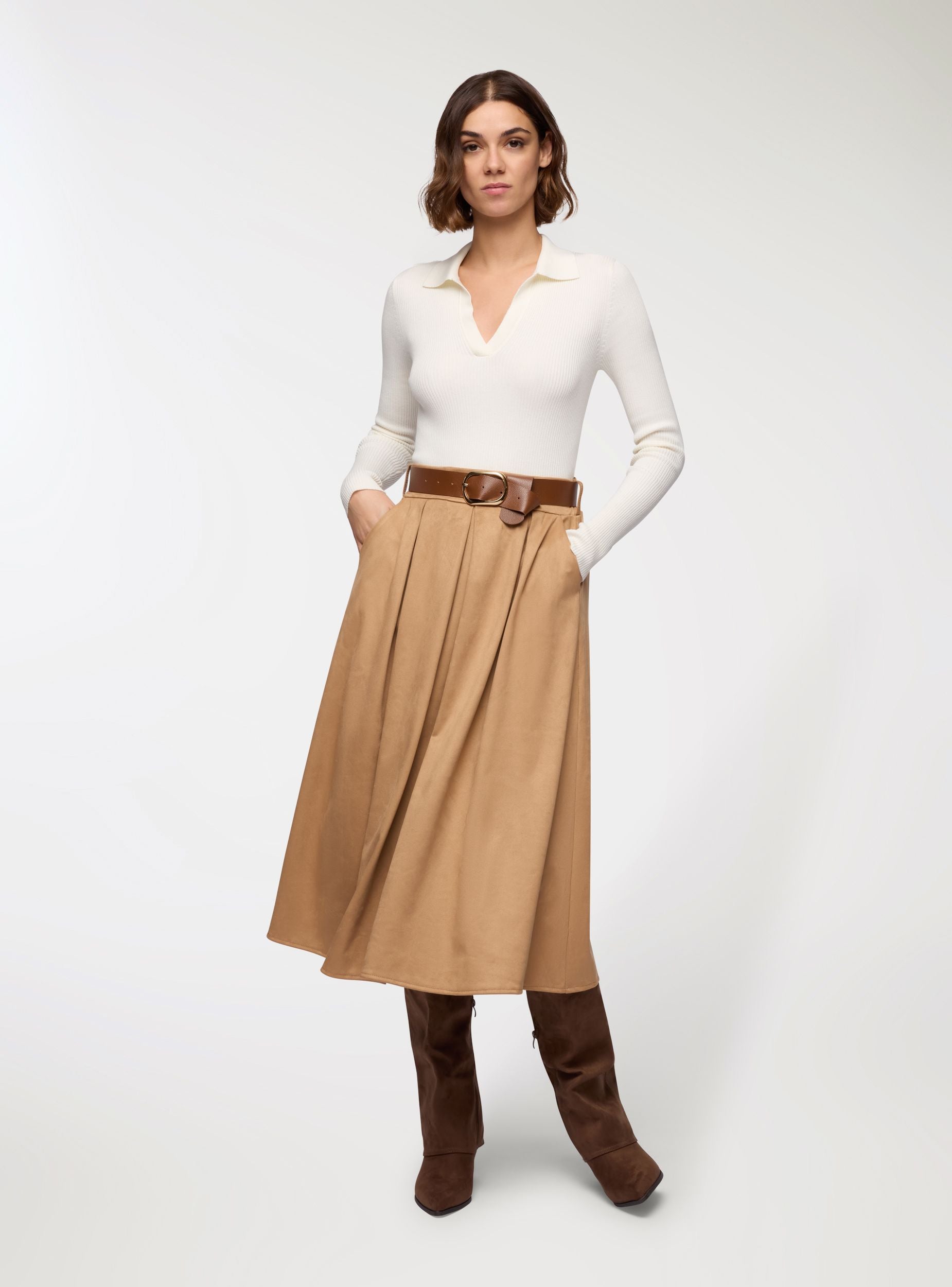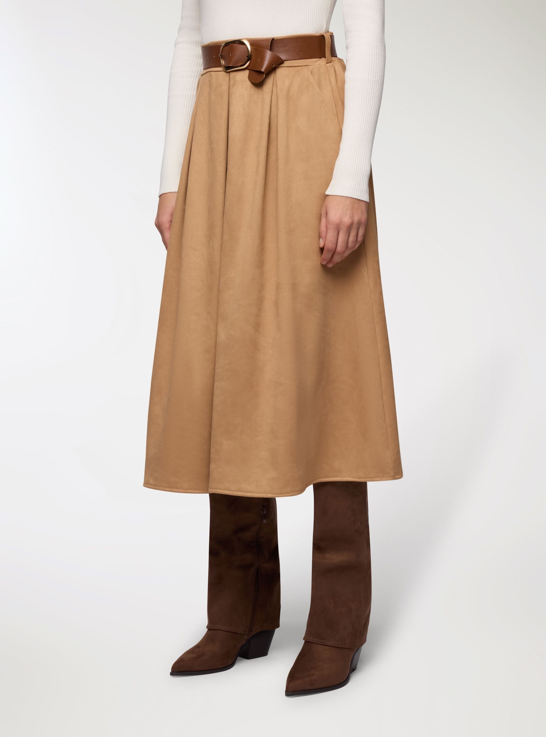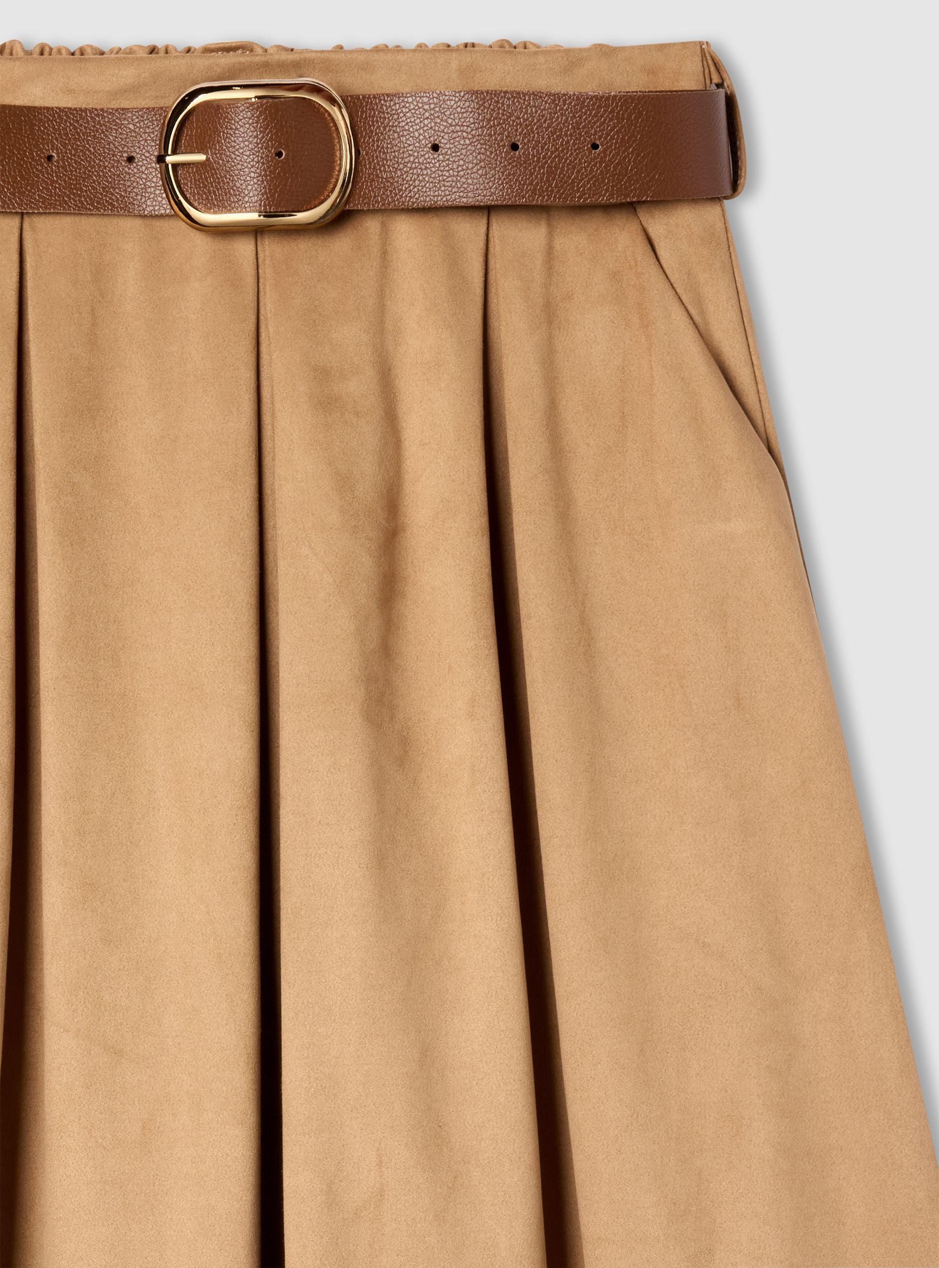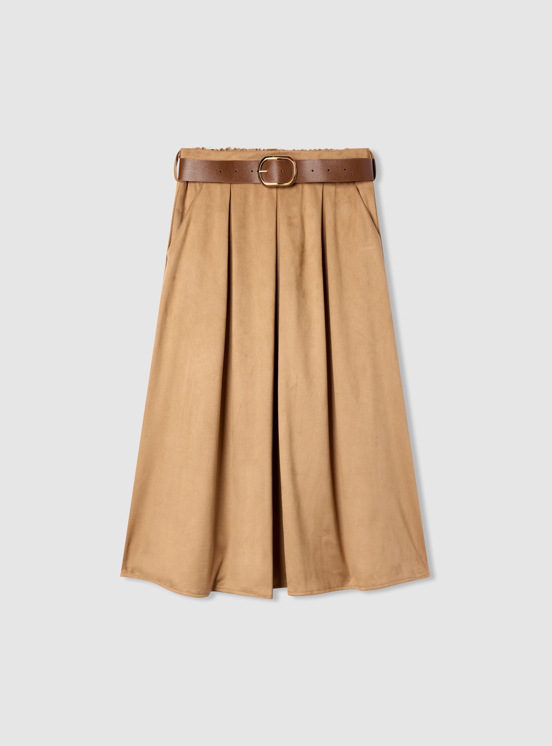 Gonna da donna a tinta unita in simildainetto con linea svasata e lunghezza midi. Vita elasticizzata con cintura abbinata e fibbia metallica, pieghe davanti che donano movimento e tasche laterali. Perfetta per look quotidiani o ufficio, si abbina a maglie aderenti e stivali. Vestibilità regular e stile versatile, ideale anche con camicie e blazer per un outfit curato.Dettagli