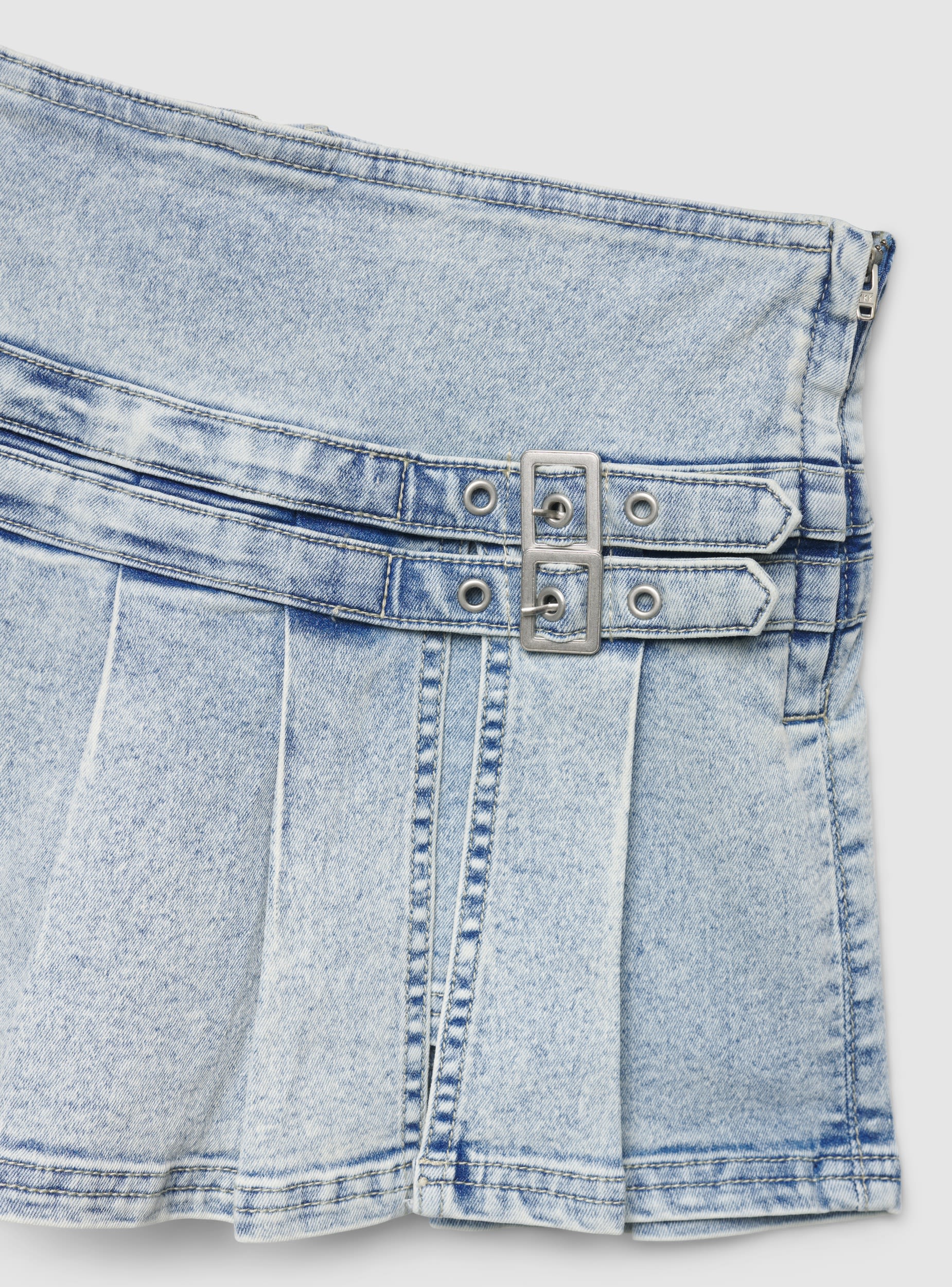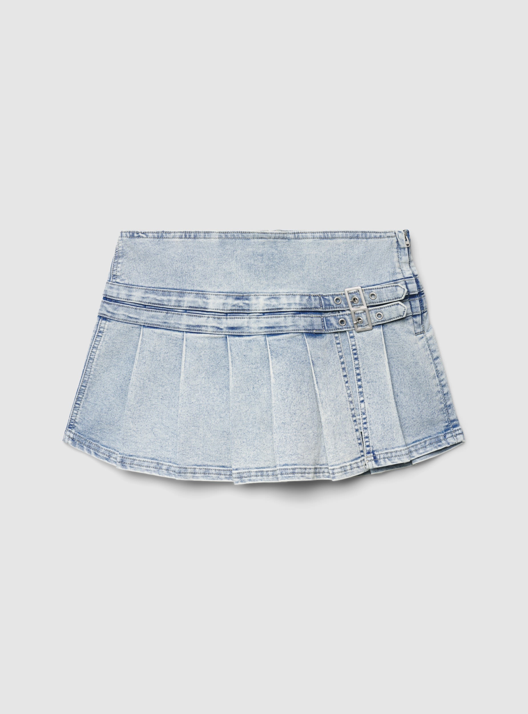 Gonna da donna a tinta unita con pieghe marcate e cinturini con doppia fibbia sul fianco. Mini lunghezza ideale per look urbani e trendy, facile da abbinare a maglietta e sneakers o a una camicia e stivaletti. Chiusura laterale con zip per una vestibilità pratica. Design strutturato che valorizza la silhouette, perfetto per serate o weekend. Stile grintoso con dettagli metallici in evidenza.Dettagli