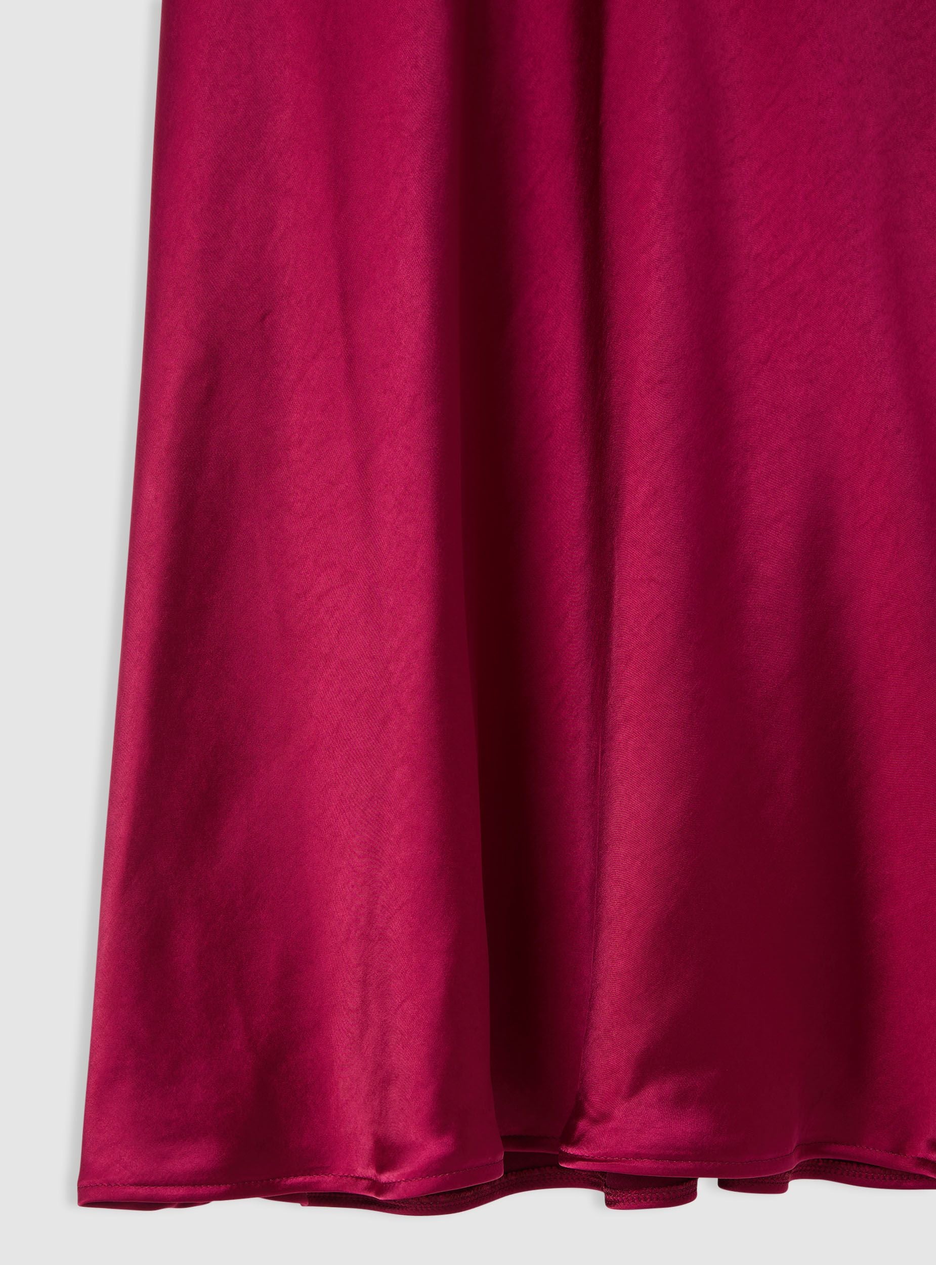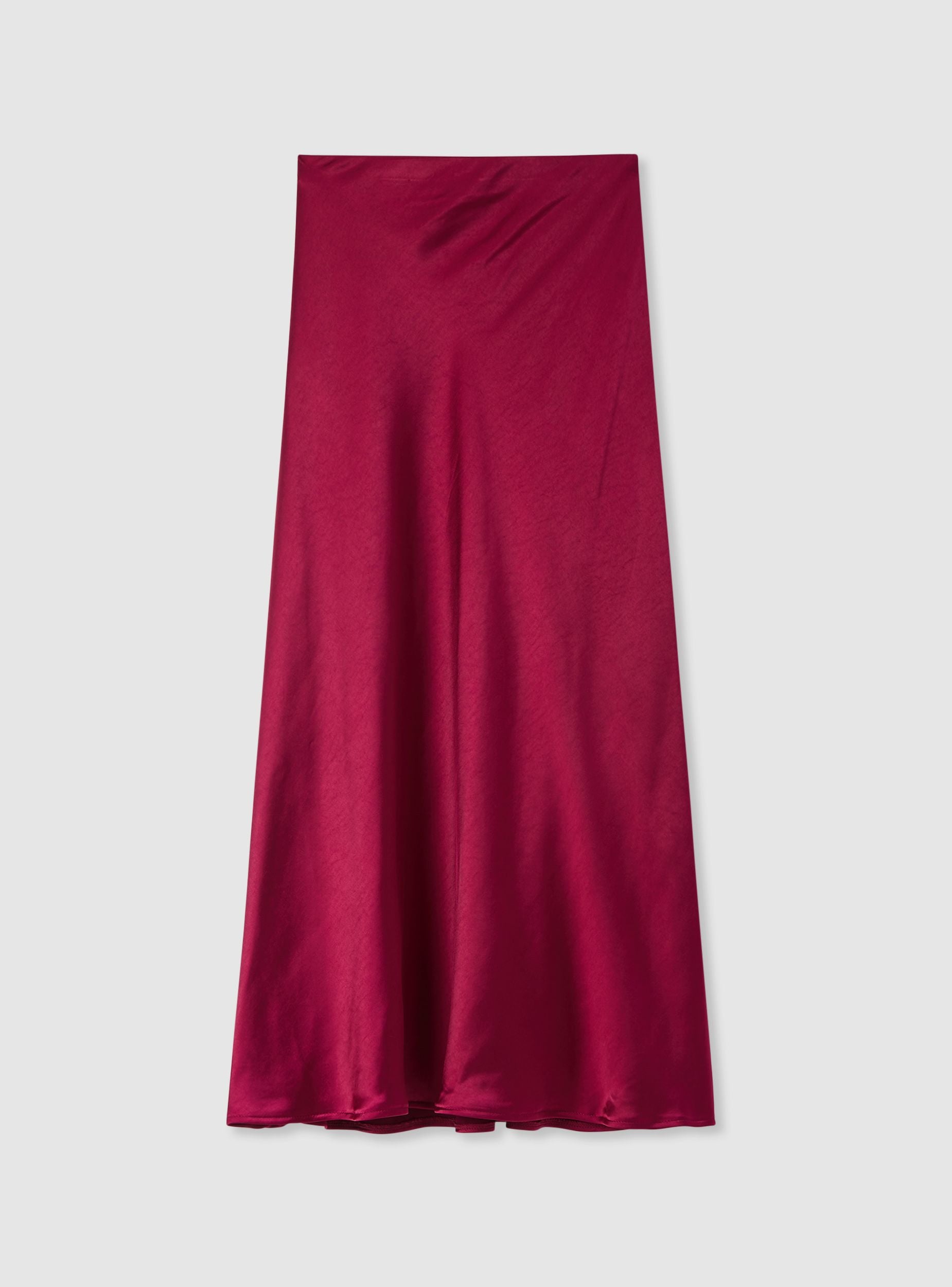 Gonna da donna lunga a tinta unita con linea svasata e vita liscia. Il tessuto effetto raso scivola morbido seguendo la figura con una vestibilità regular, ideale per look da sera o occasioni speciali con camicie e top, ma perfetta anche con maglioncini e stivaletti per il giorno. Design minimal senza tasche per un profilo pulito e femminile.Dettagli