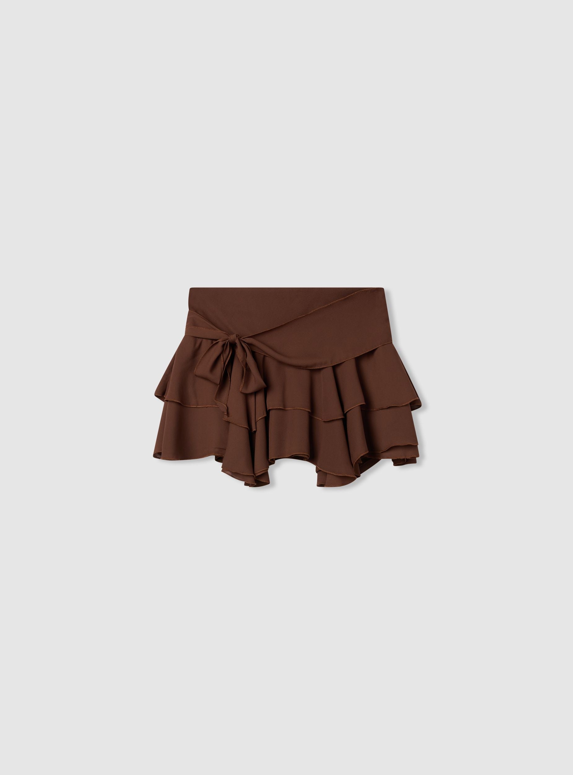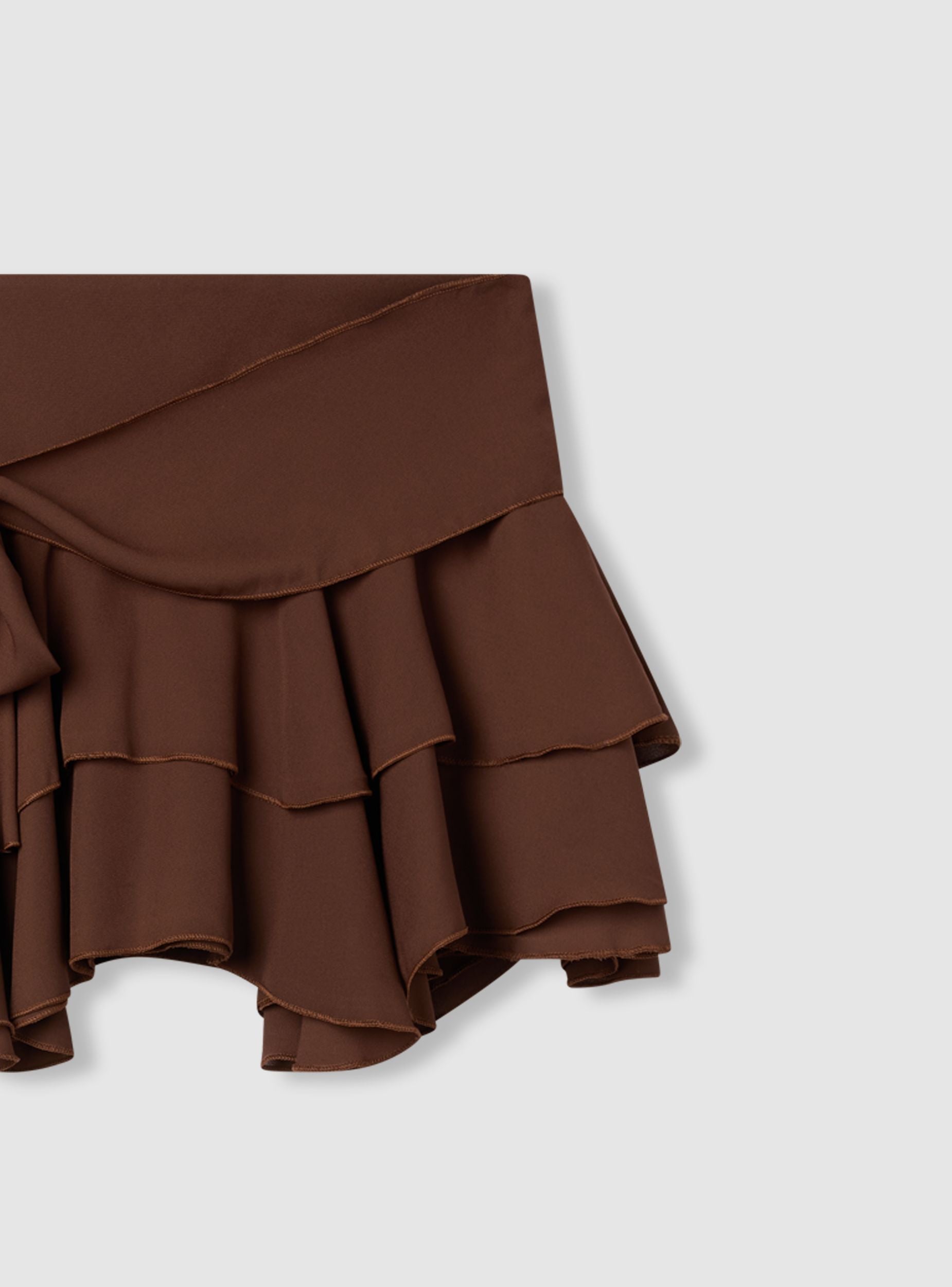 Pantaloncini-gonna da donna a tinta unita con balze sovrapposte e orlo asimmetrico, ideali per look femminili dal giorno alla sera. Cintura ampia con nodo laterale che valorizza il punto vita e dona movimento. Lunghezza mini, vestibilità confortevole grazie alla struttura a pantaloncini. Perfetti con top aderenti e sandali o con camicie leggere per un outfit curato e versatile.Dettagli
