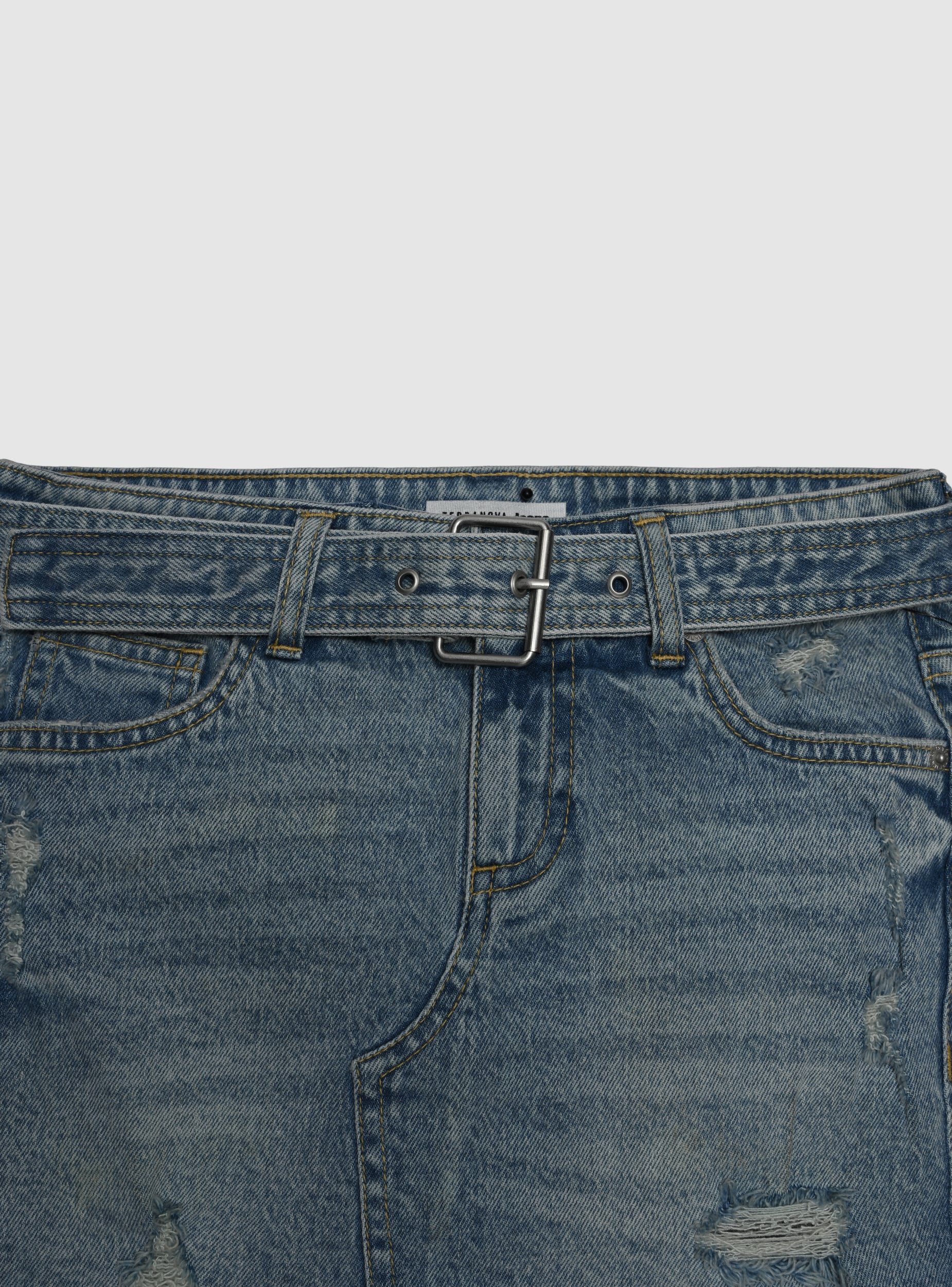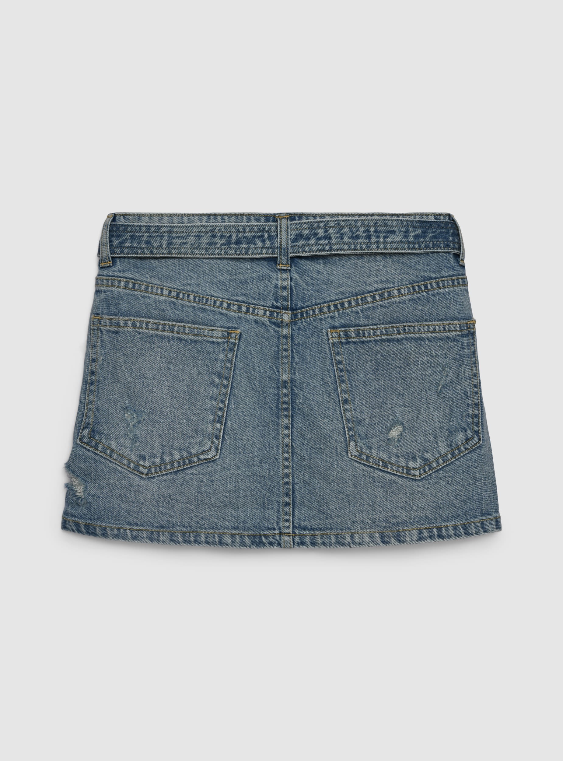 Gonna da donna in stile denim dal taglio mini, ideale per look urban e da tempo libero. Modello a tinta unita con strappi e dettagli effetto used, passanti in vita e cintura coordinata con fibbia. Chiusura con bottone e zip, due tasche davanti e due tasche applicate sul retro. Perfetta con maglietta e sneakers o con top e stivaletti.Dettagli
