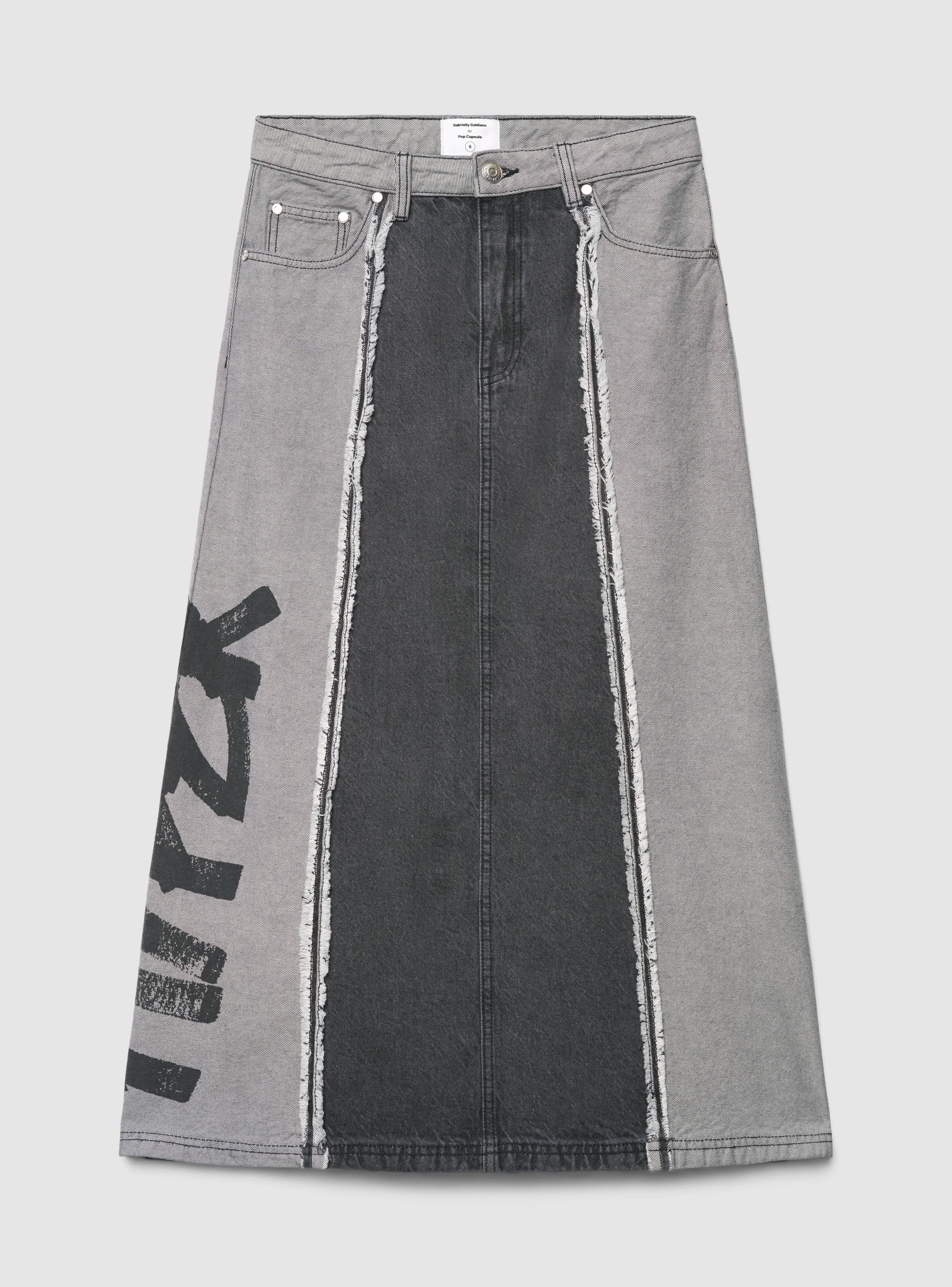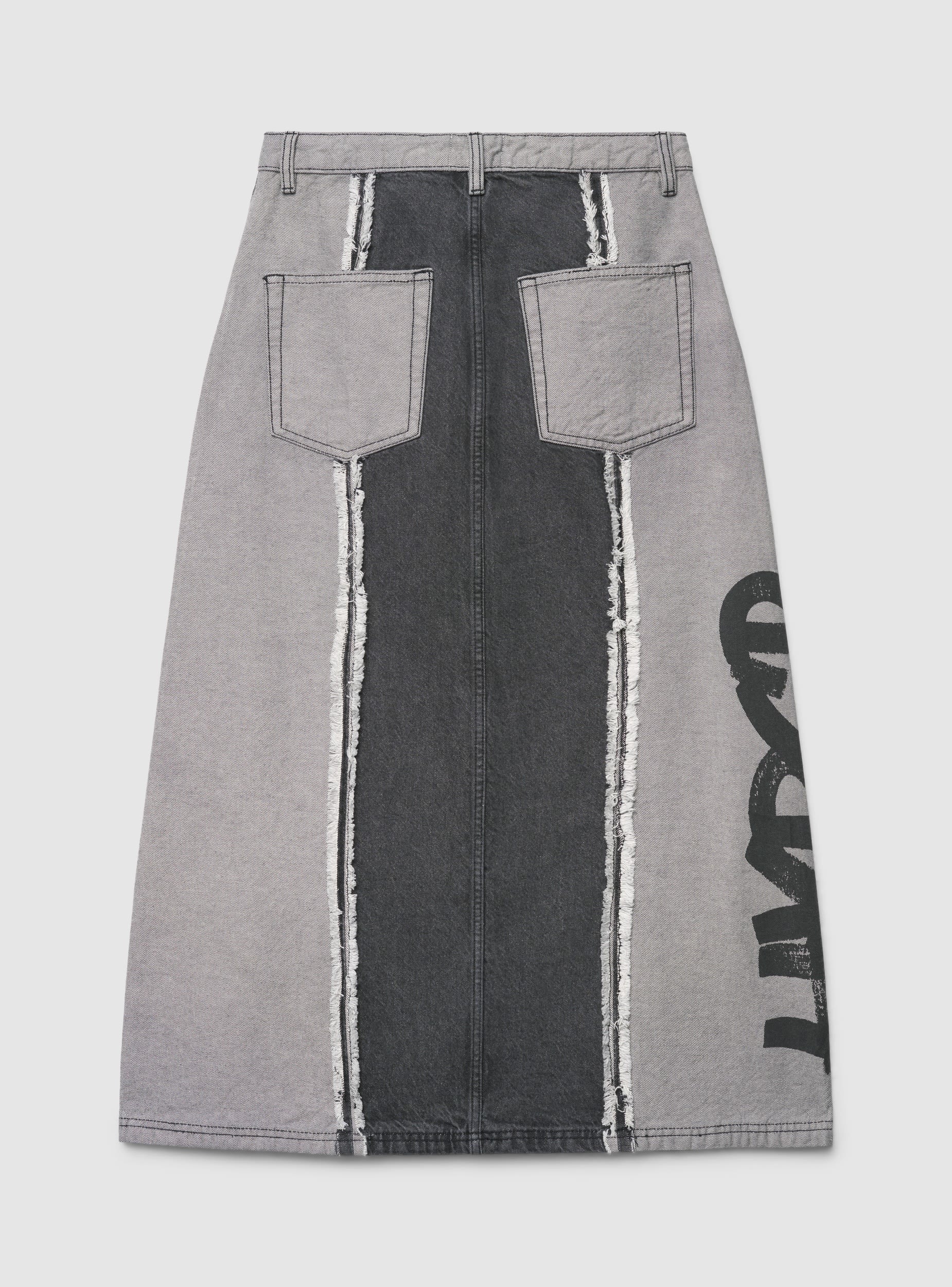 Gonna da donna lunga in denim dal mood urban, rifinita con pannello a contrasto e cuciture a vista con bordi sfrangiati. Chiusura con bottone e zip, passanti in vita e tasche stile cinque tasche sul davanti più tasche applicate sul retro. La maxi stampa con scritta dona carattere e si abbina facilmente a magliette e sneakers per look quotidiani.Dettagli