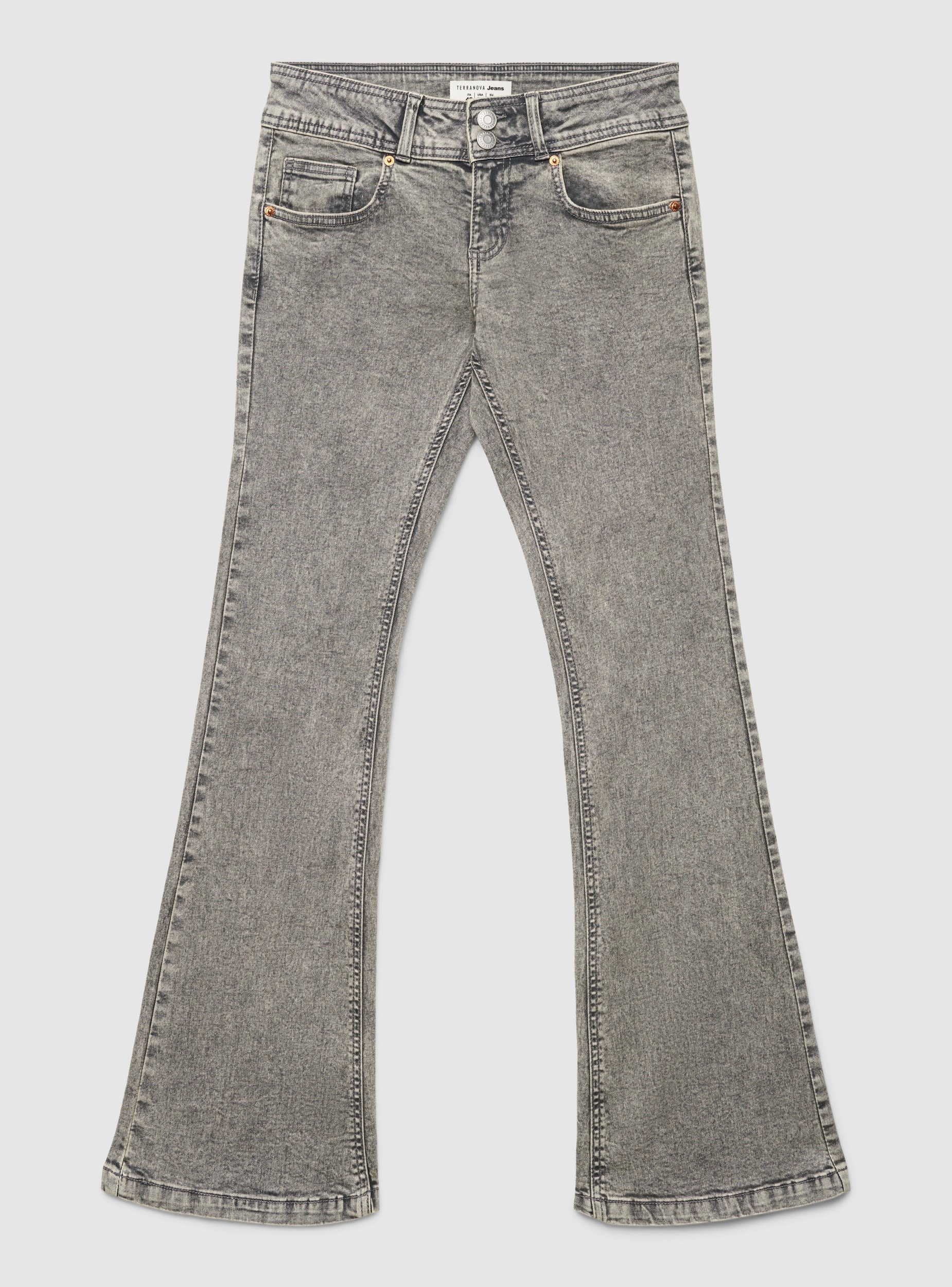 Jeans da donna dal design a tinta unita con gamba a zampa e lunghezza lunga, ideali per slanciare la silhouette. Modello a vita bassa con chiusura frontale con bottoni e passanti in vita. Presenta tasche anteriori e tasche posteriori con patta, perfette per un look urbano da abbinare a top aderenti o maglie morbide e sneakers o stivaletti.Dettagli
