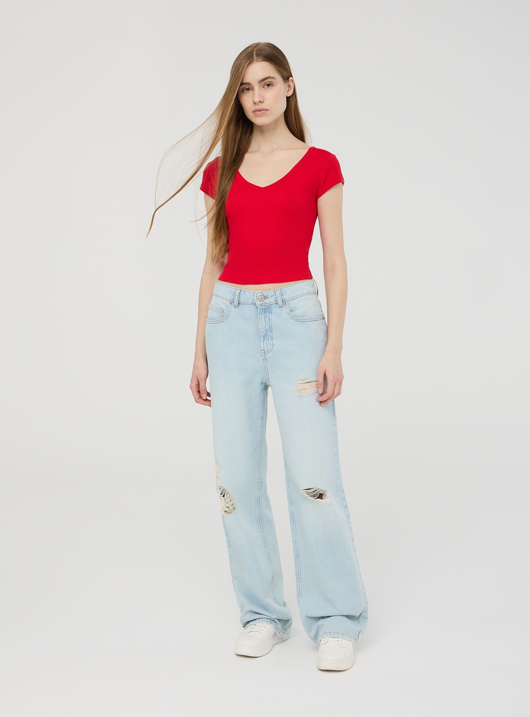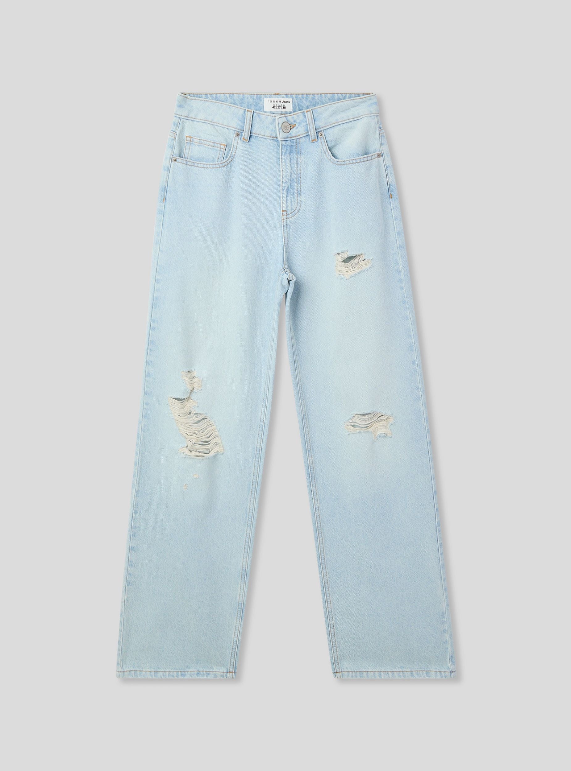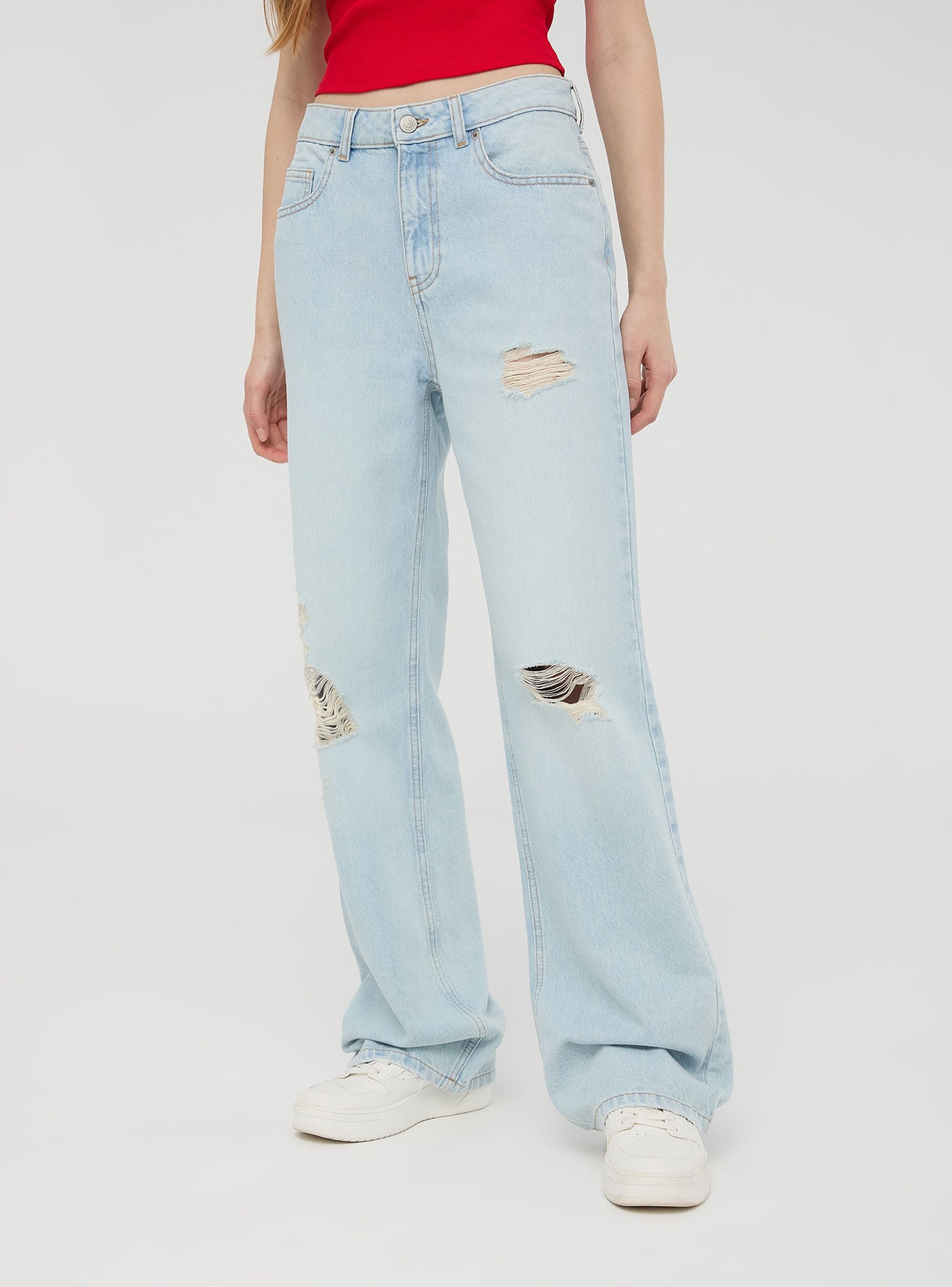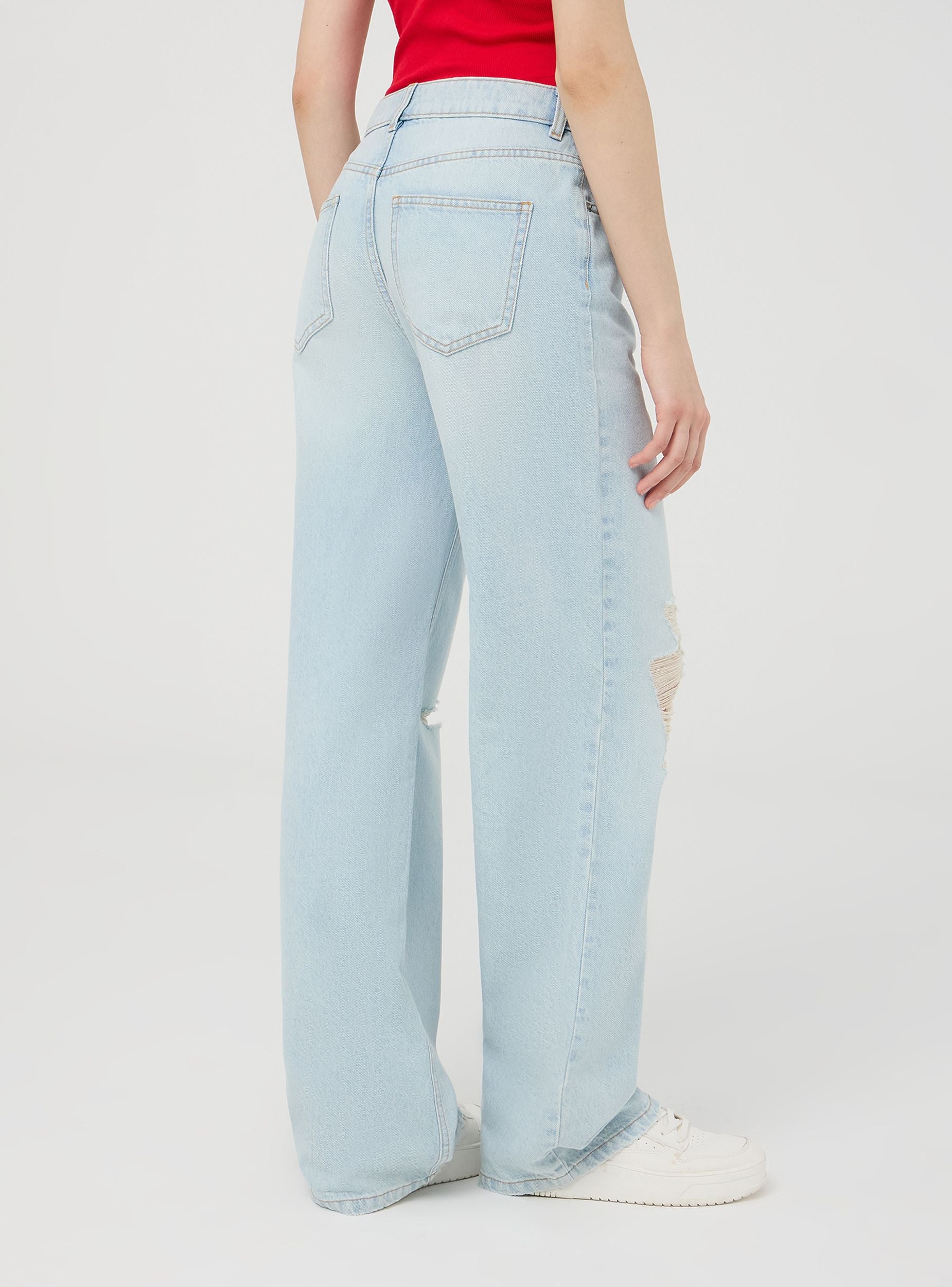 Jeans da donna con vestibilità ampia, caratterizzati da strappi per un look moderno e grintoso. Il design cinque tasche, la chiusura con zip e bottone e i passanti in vita garantiscono praticità e stile. Il lavaggio chiaro denim li rende ideali per outfit casual, abbinati a t-shirt e sneakers, oppure per look più ricercati con camicie oversize e sandali.Dettagli