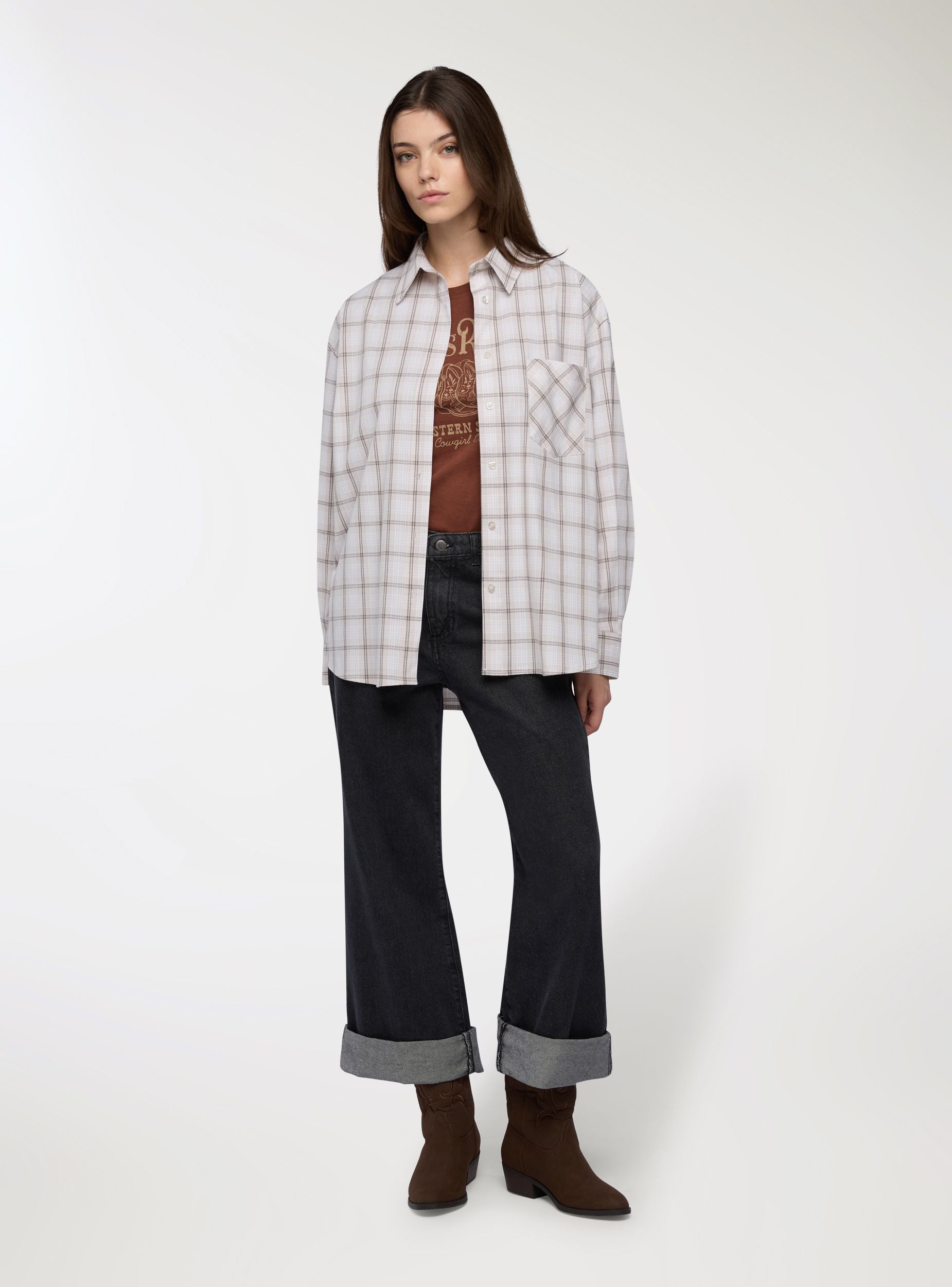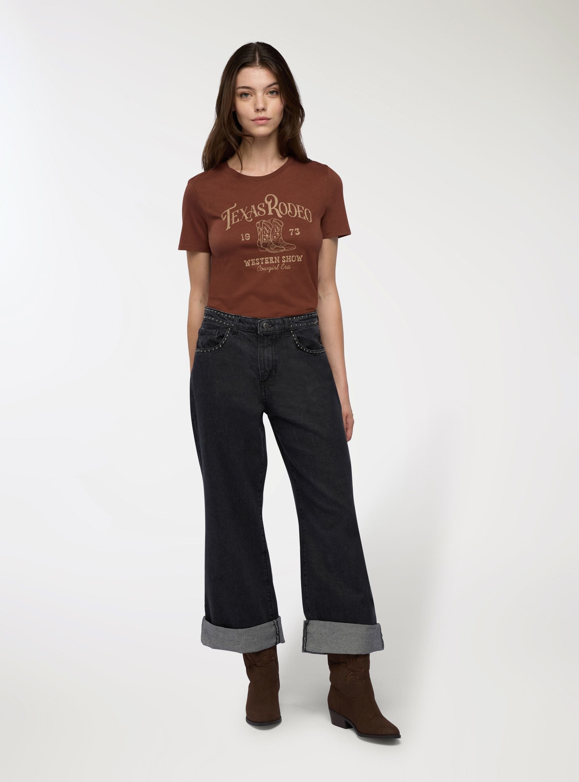 Jeans da donna a gamba dritta con dettaglio di borchie su cintura e tasche, perfetti per un look urbano dal carattere deciso. Modello lungo con risvolto al fondo, chiusura con bottone e zip, cinque tasche. Vestibilità regular che si abbina facilmente a maglietta grafica e sneakers per il giorno, oppure a camicia e stivaletti per la sera.