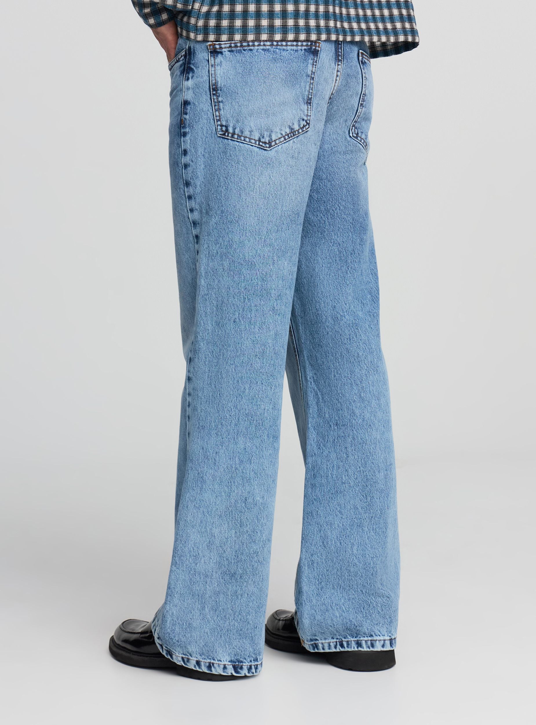Jeans da uomo a tinta unita con taglio baggy e fondo svasato. Vita media con passanti e chiusura a bottone e zip, cinque tasche con taschino frontale. Ideale per look casual urbani con felpe o camicie oversize e sneakers.Dettagli
