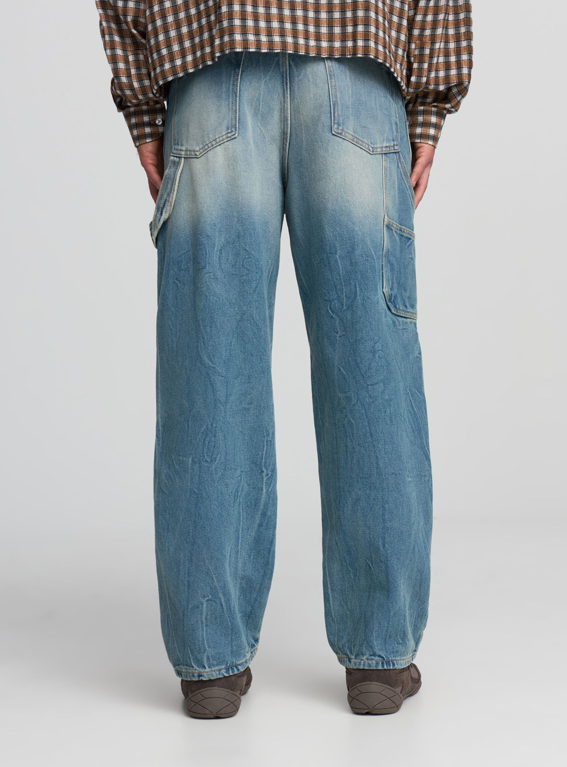 Jeans da uomo a tinta unita dal fit ampio e gamba lunga, ispirato al workwear. Vita media con passanti, chiusura con bottone e zip. 5 tasche, ideale per look casual urbani con felpe o magliette e sneakers.Dettagli