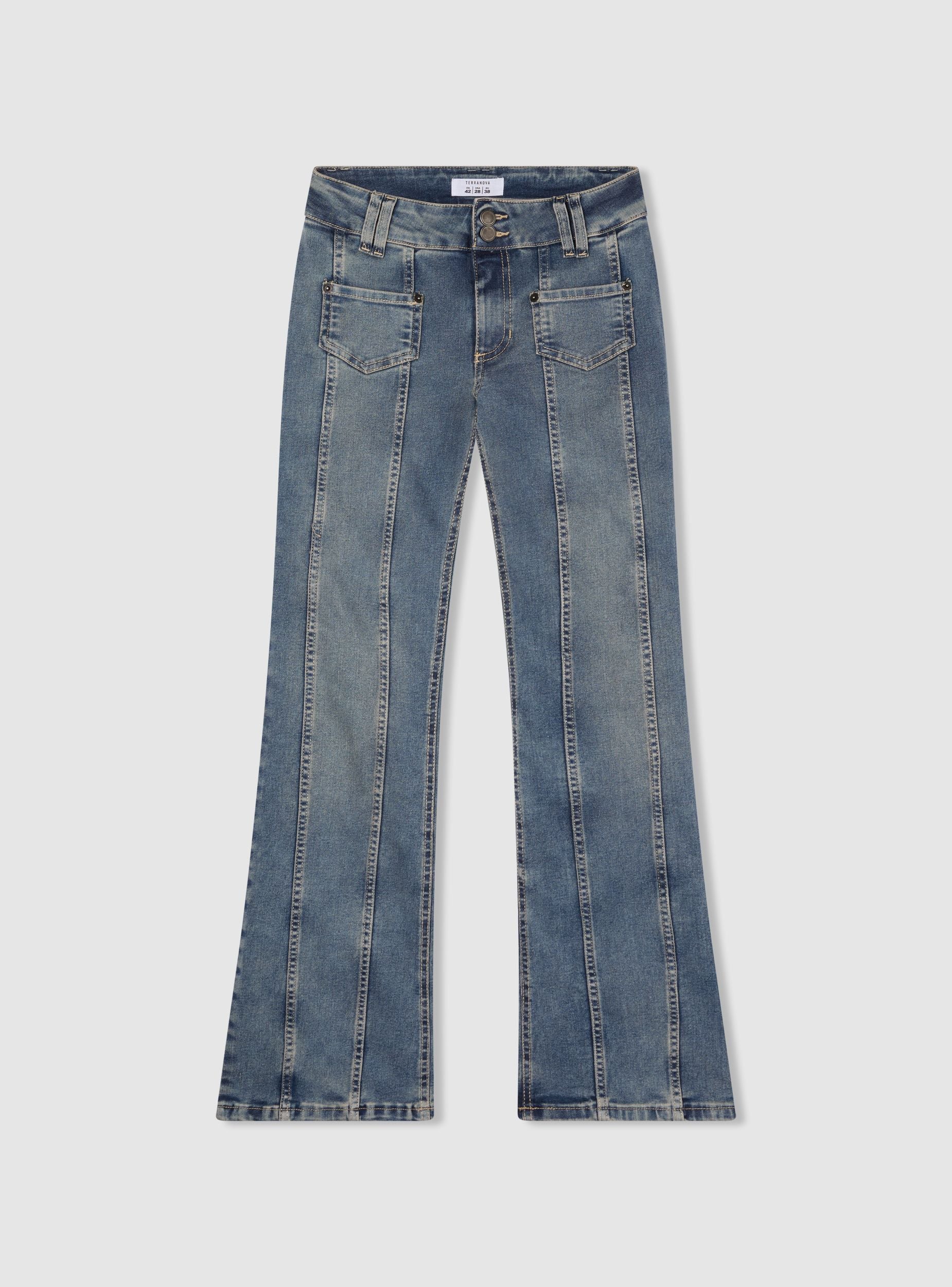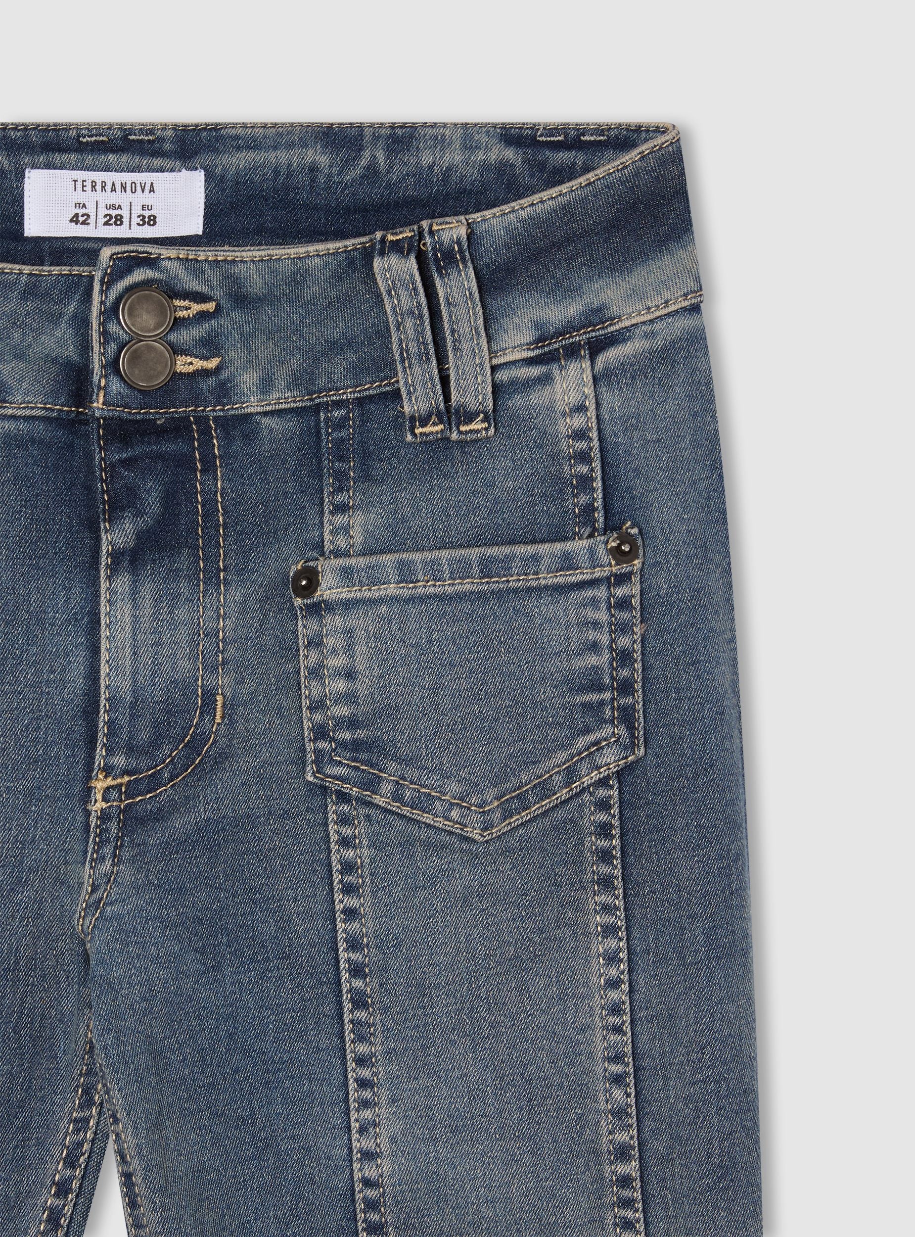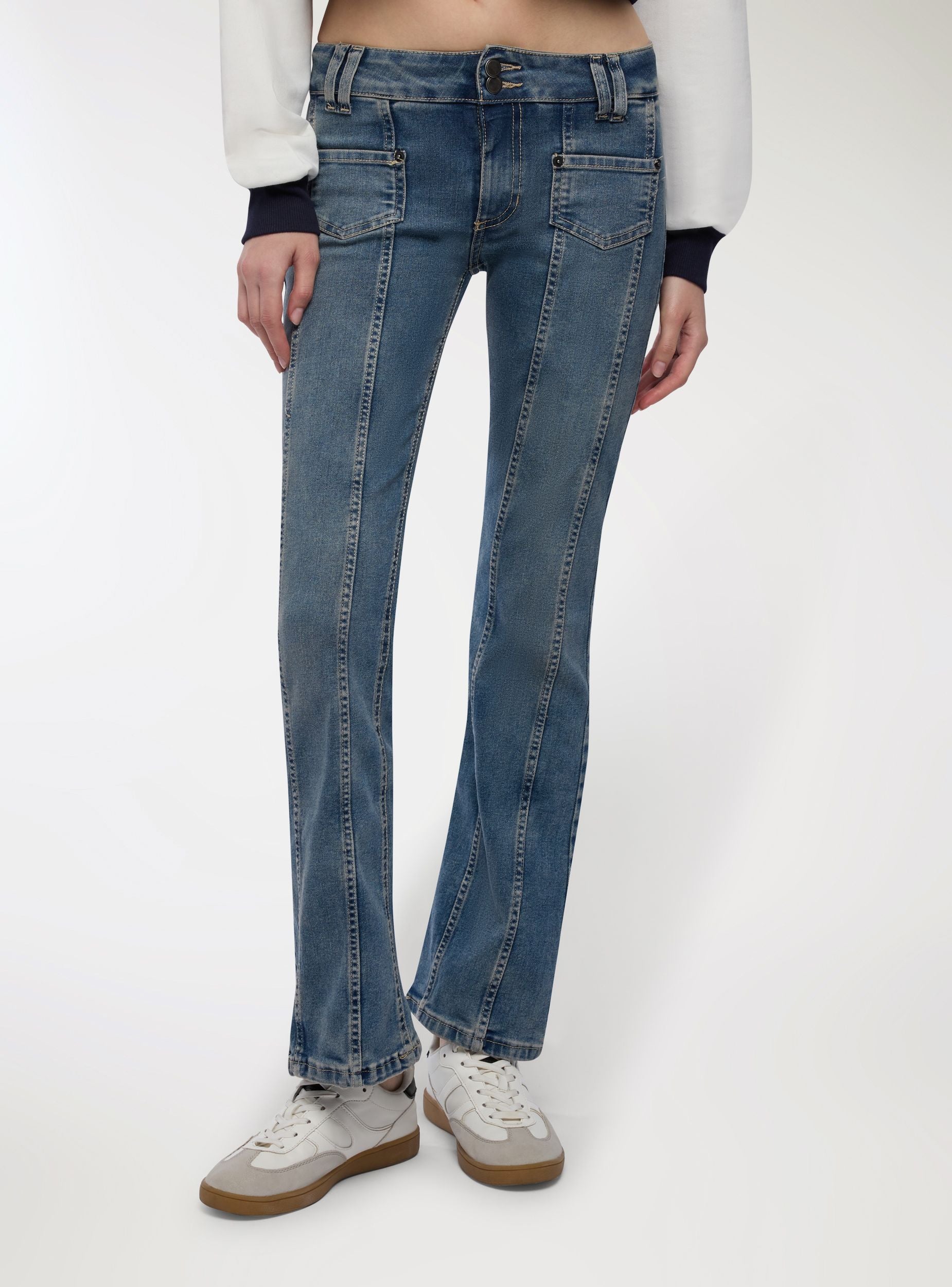 Jeans da donna a tinta unita con linea flare e lavaggio medio, perfetti per look casual e urban. Modello lungo con vita media, chiusura frontale con bottoni e zip e passanti per cintura. Due tasche applicate davanti con dettagli di impunture verticali che slanciano la gamba, più tasche sul retro. Ideali con maglietta e sneakers o con camicia e stivaletti per un outfit versatile dal giorno alla sera.Dettagli