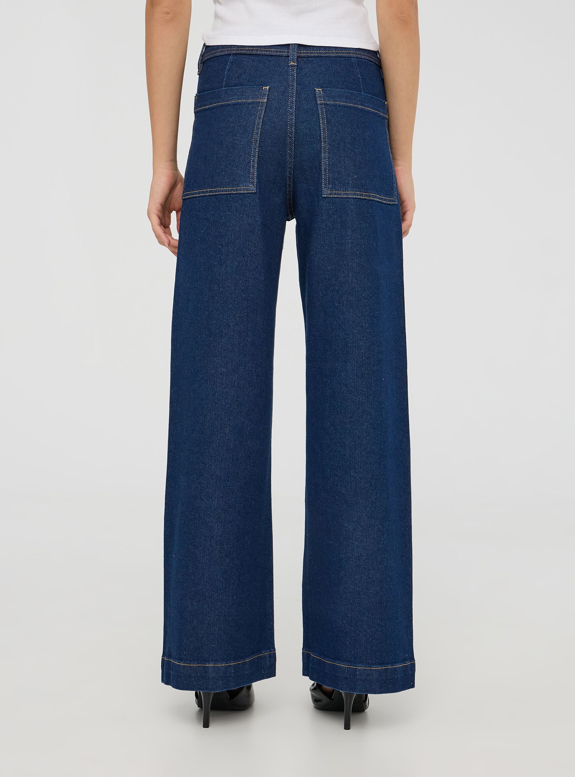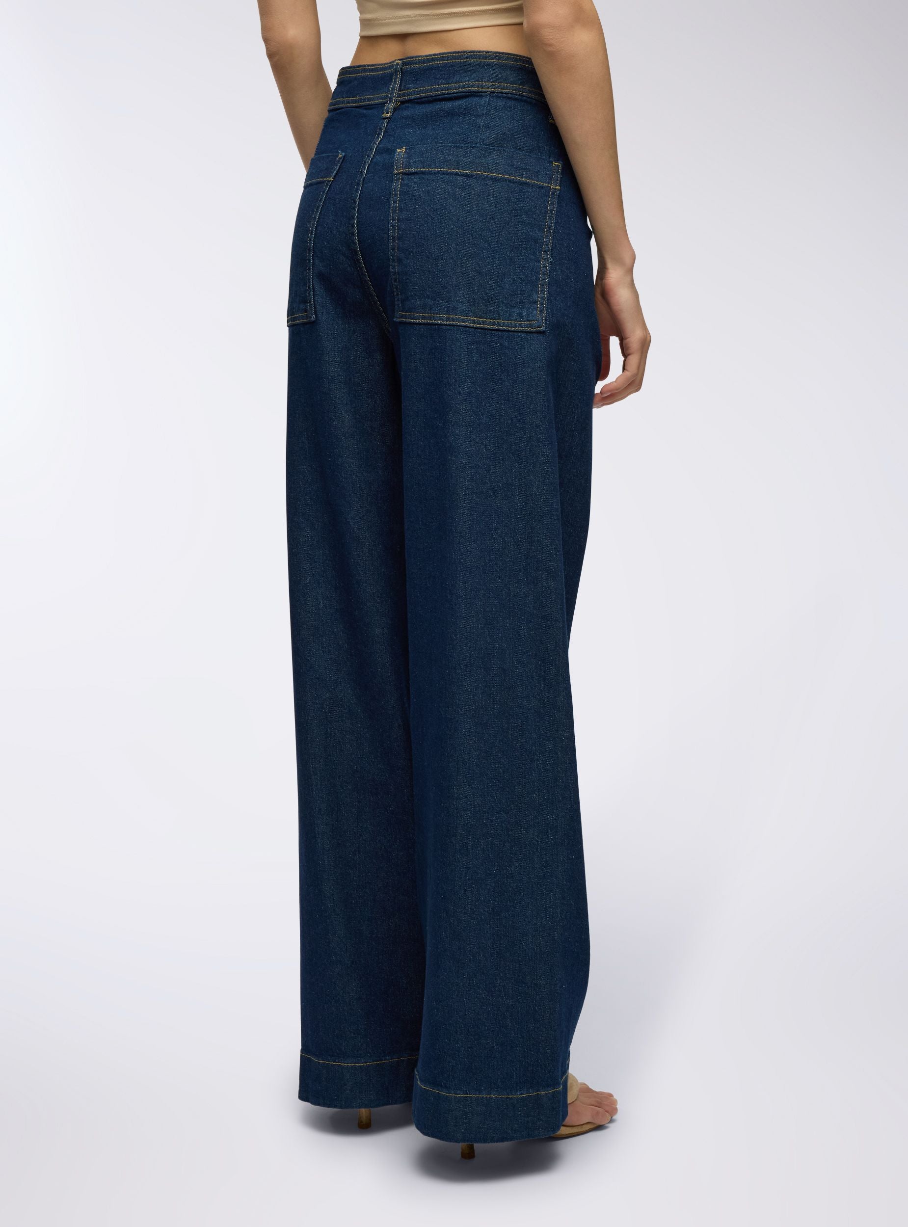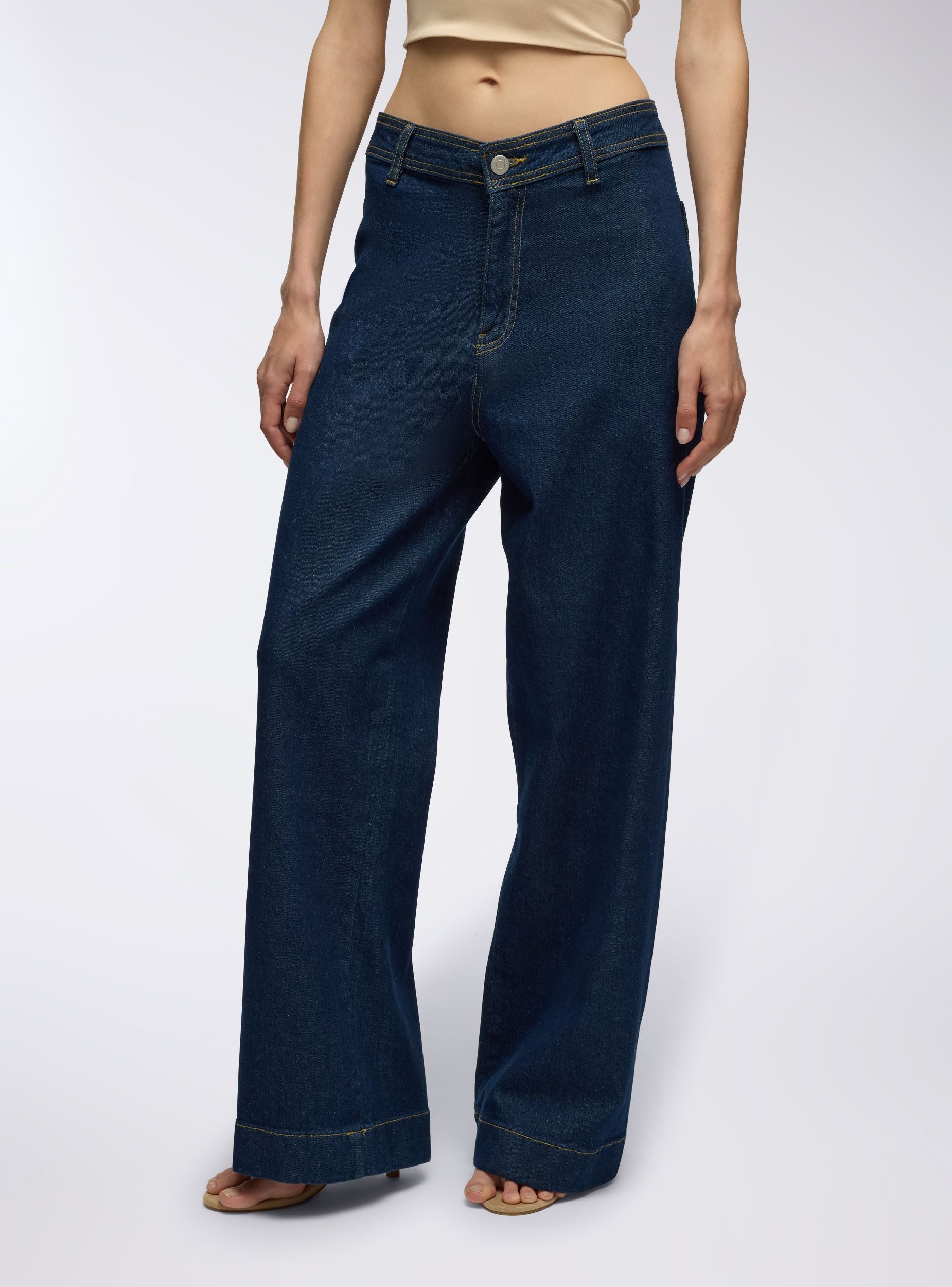 Jeans da donna, dal design a tinta unita e tonalità scura, ideali per un look contemporaneo. Caratterizzati da una chiusura con bottone, passanti in vita per eventuali cinture e comode tasche posteriori. Il modello wide leg offre una vestibilità ampia e moderna, perfetta per chi cerca uno stile unico e di tendenza.Dettagli
