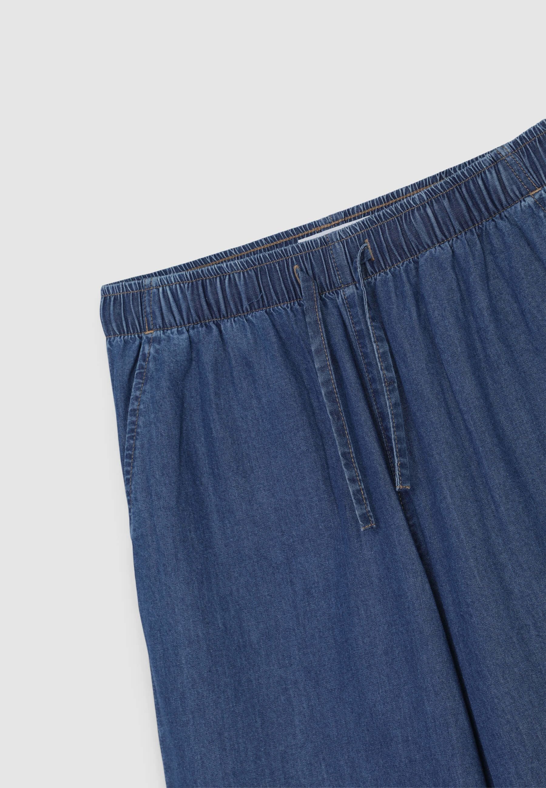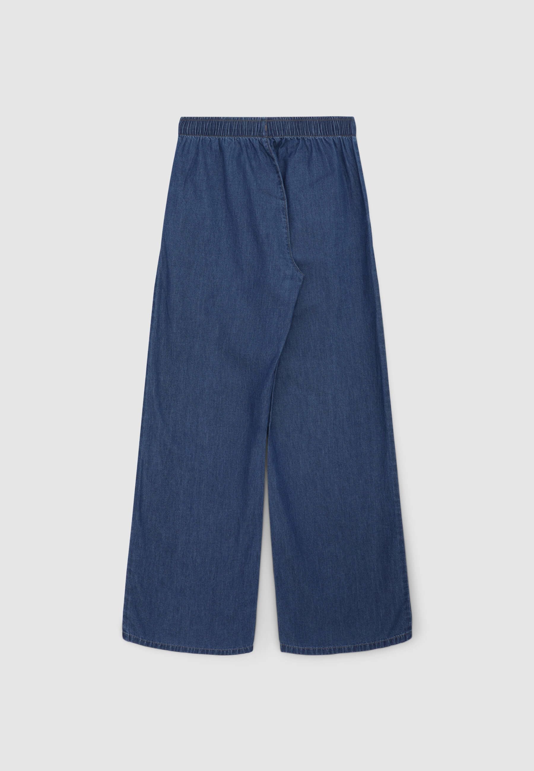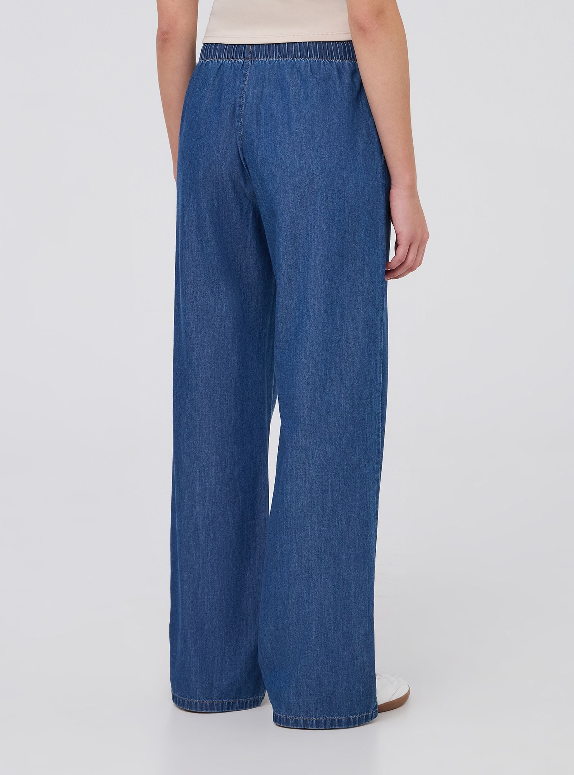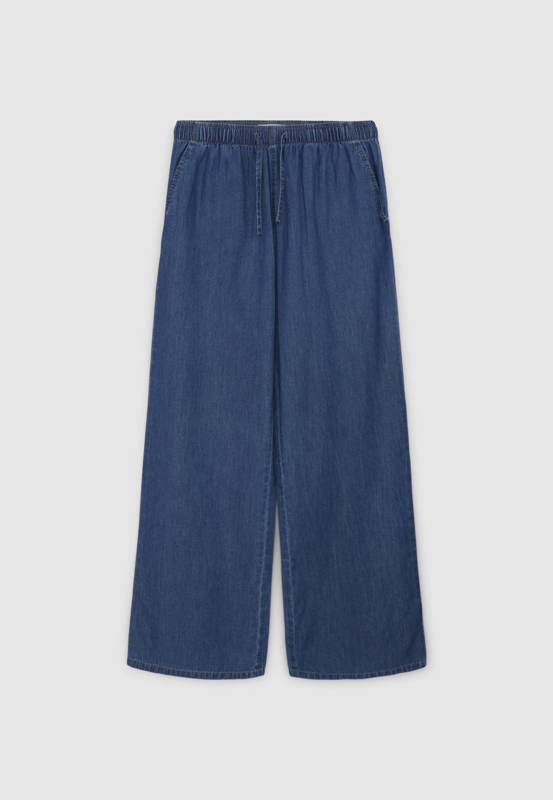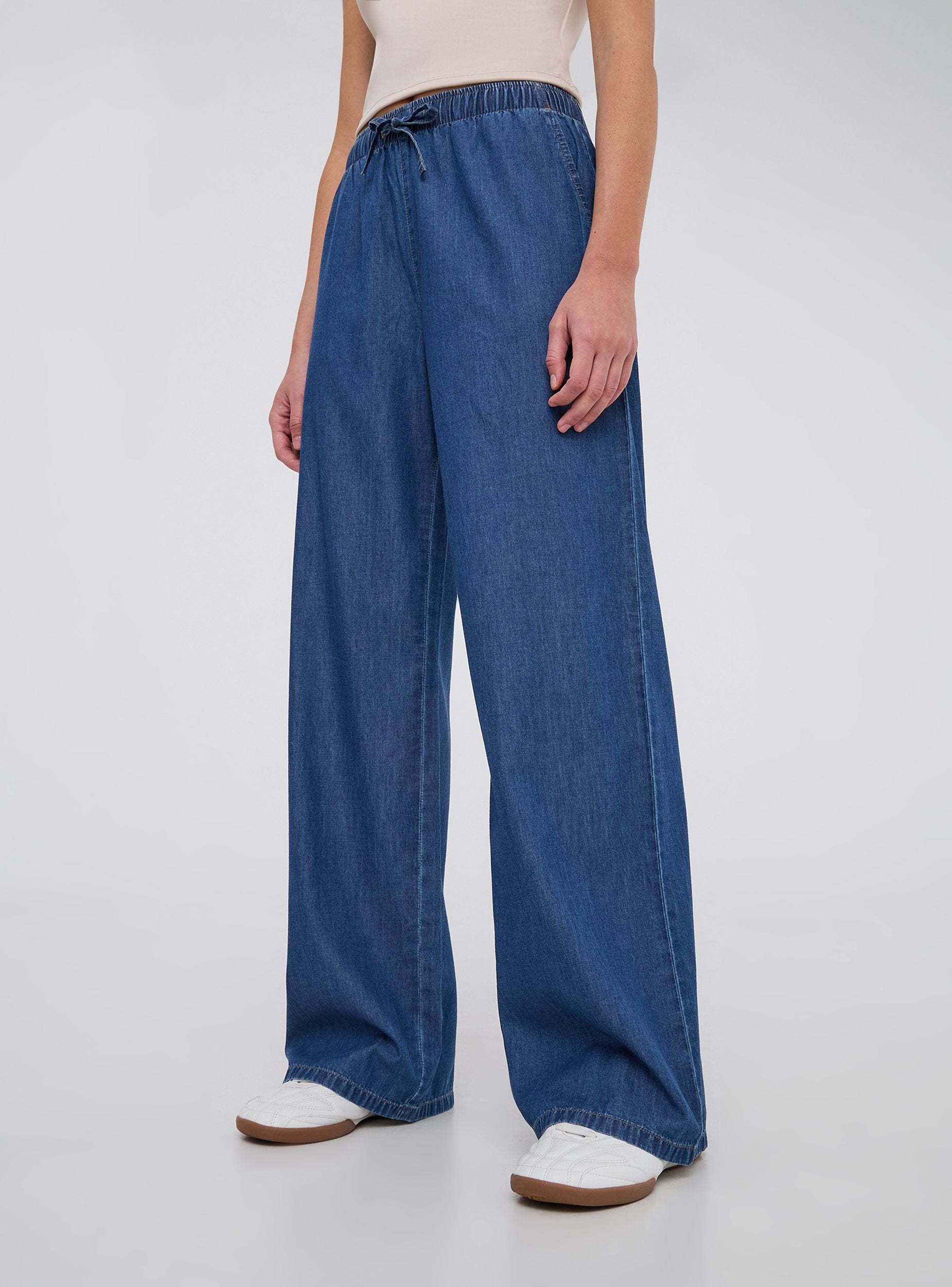 Jeans da donna con design a tinta unita, caratterizzati da una vestibilità comoda e ampia, perfetti per un look casual o per il tempo libero. La vita elastica con coulisse garantisce comfort e praticità, mentre le tasche laterali aggiungono funzionalità al modello. Il taglio wide leg offre uno stile moderno e versatile, ideale per creare outfit trendy e rilassati.Dettagli