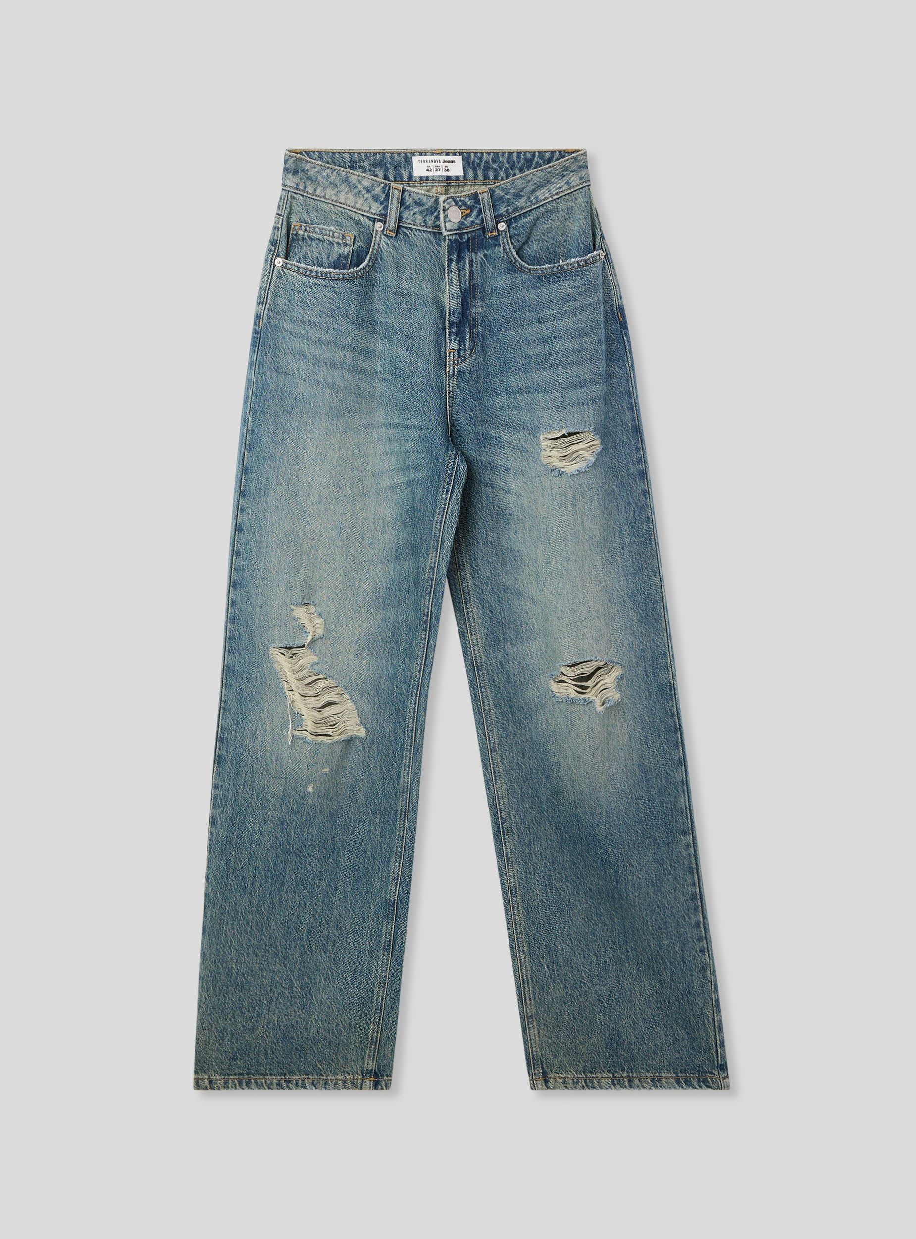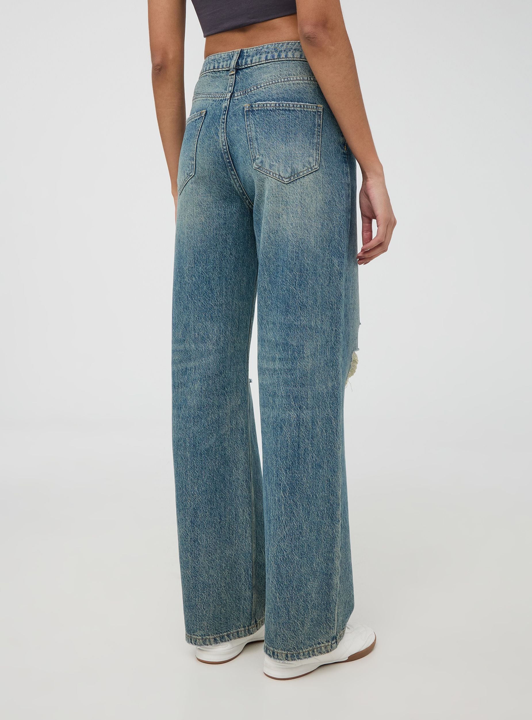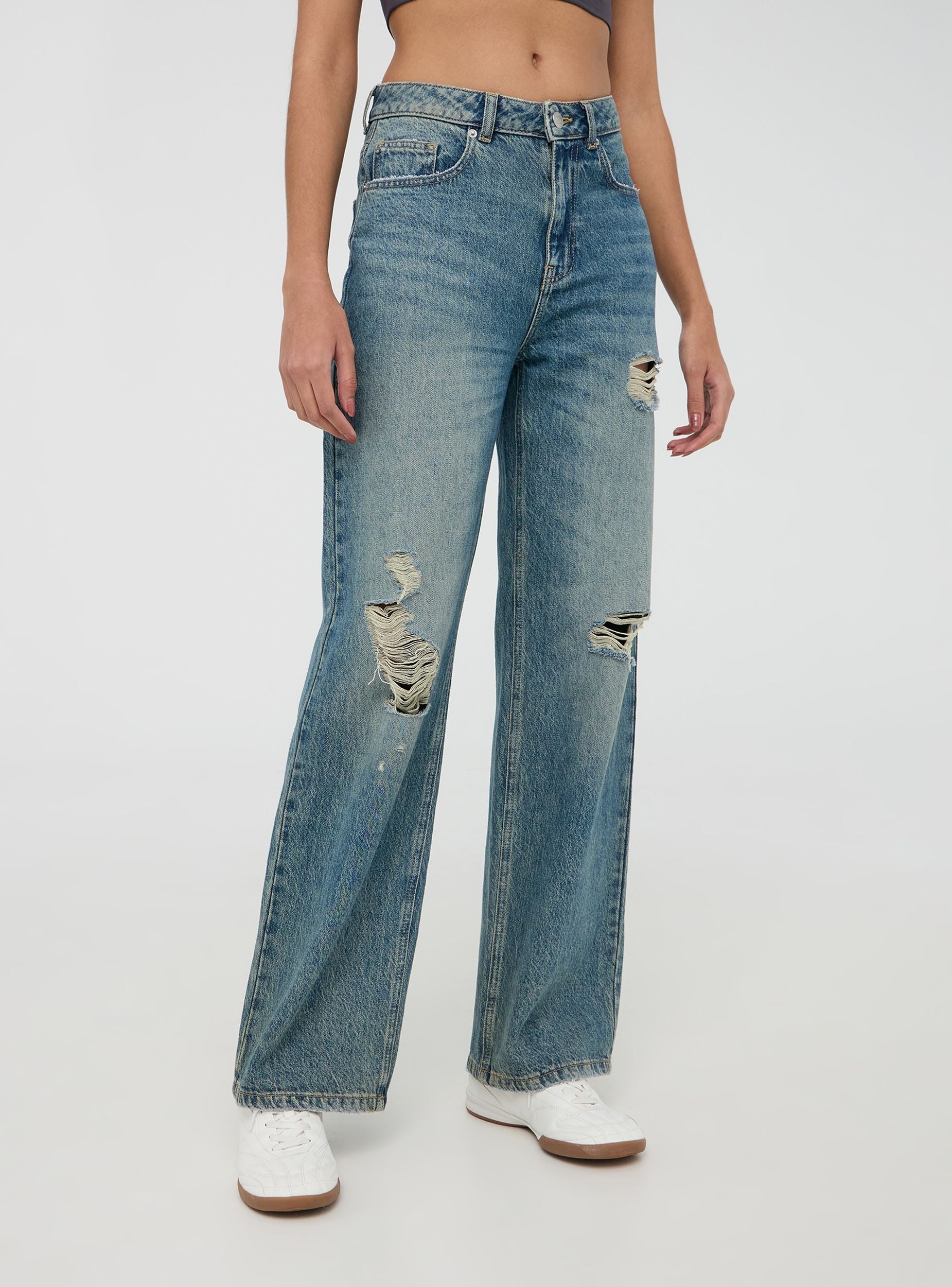 Jeans da donna perfetti per un look casual e rilassato, ideali per il tempo libero o per un'uscita informale. Presentano un taglio wide leg, lavaggio medio sovratinto e dettagli di strappi per un tocco trendy. Dotati di passanti in vita, cinque tasche e chiusura con bottone e zip, uniscono comfort e stile in ogni occasione.Dettagli