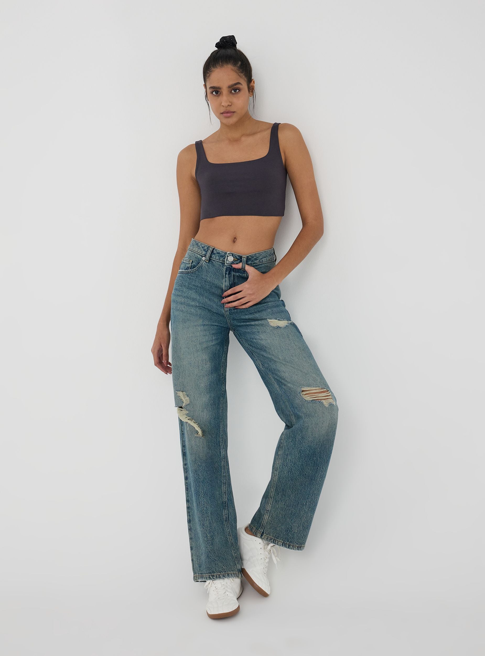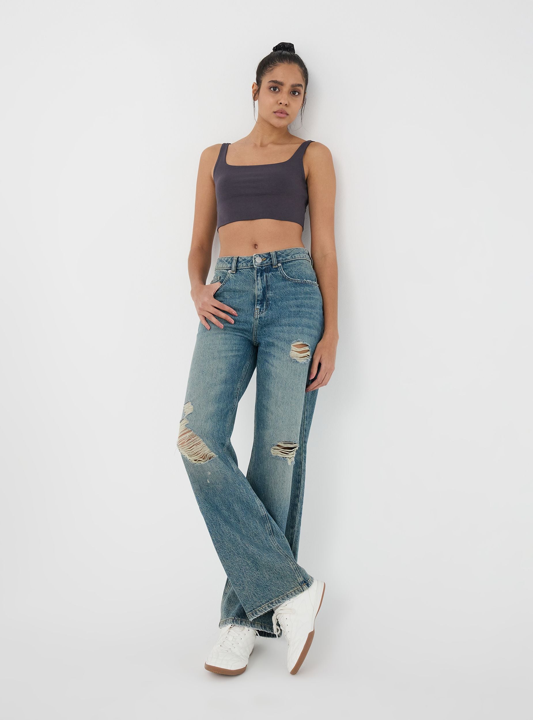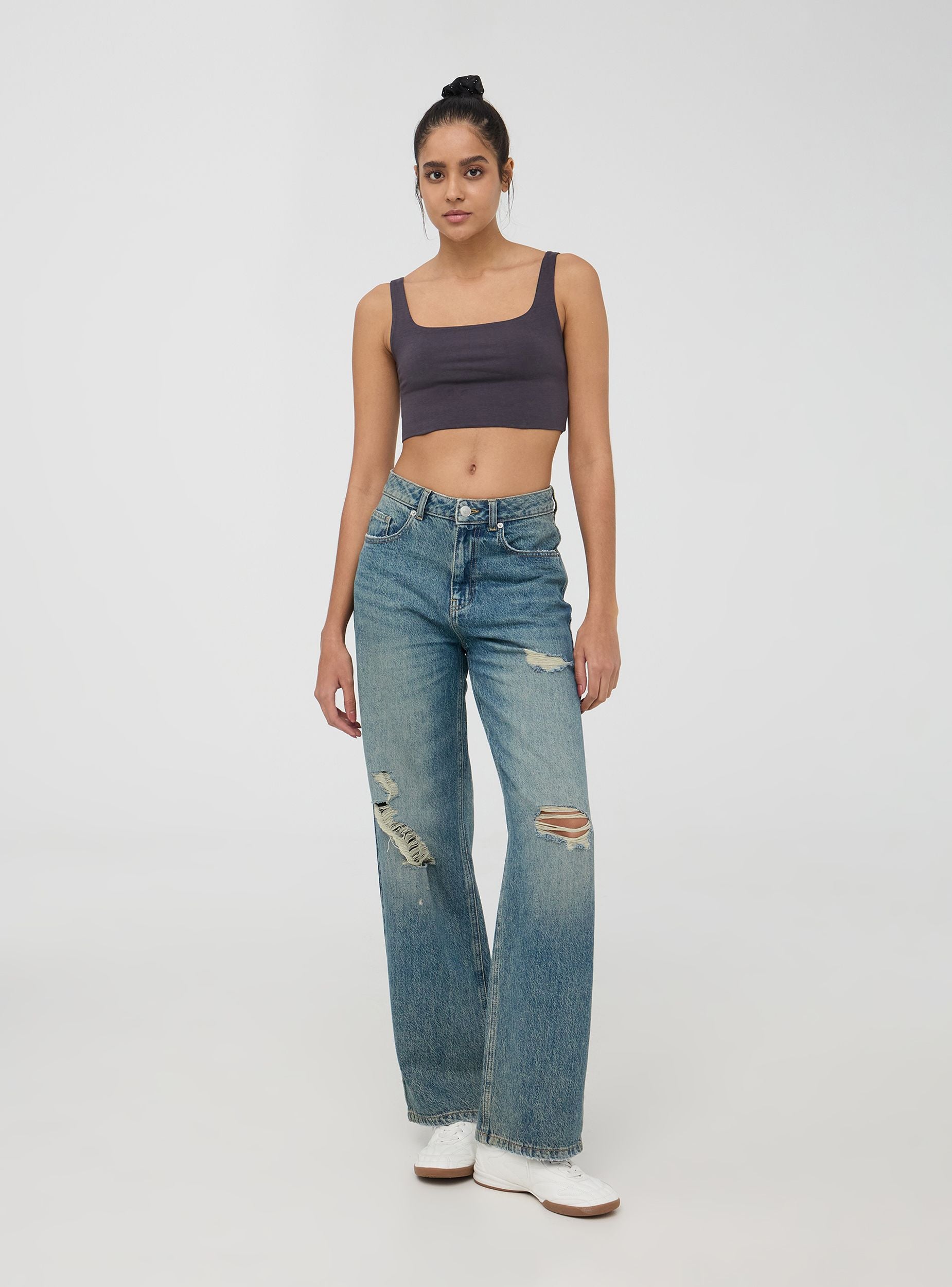 Jeans da donna perfetti per un look casual e rilassato, ideali per il tempo libero o per un'uscita informale. Presentano un taglio wide leg, lavaggio medio sovratinto e dettagli di strappi per un tocco trendy. Dotati di passanti in vita, cinque tasche e chiusura con bottone e zip, uniscono comfort e stile in ogni occasione.Dettagli