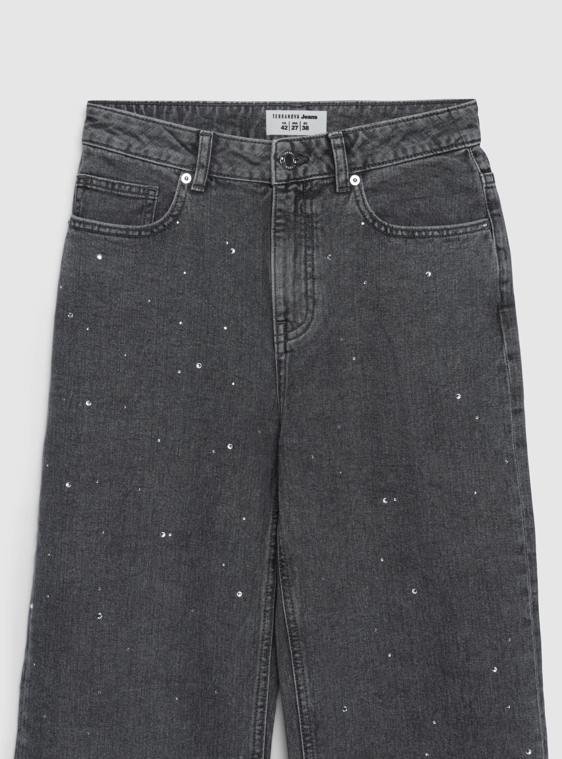 Jeans da donna a tinta unita con vestibilità ampia e gamba dritta. Vita alta con chiusura a bottone e zip, passanti per cintura e cinque tasche. Decorazione allover con applicazioni effetto luccicante che illumina il look, ideale per serate o outfit trendy con camicie, top e blazer. Lunghezza completa fino alla caviglia, perfetti con sneakers o stivaletti per creare abbinamenti versatili.Dettagli