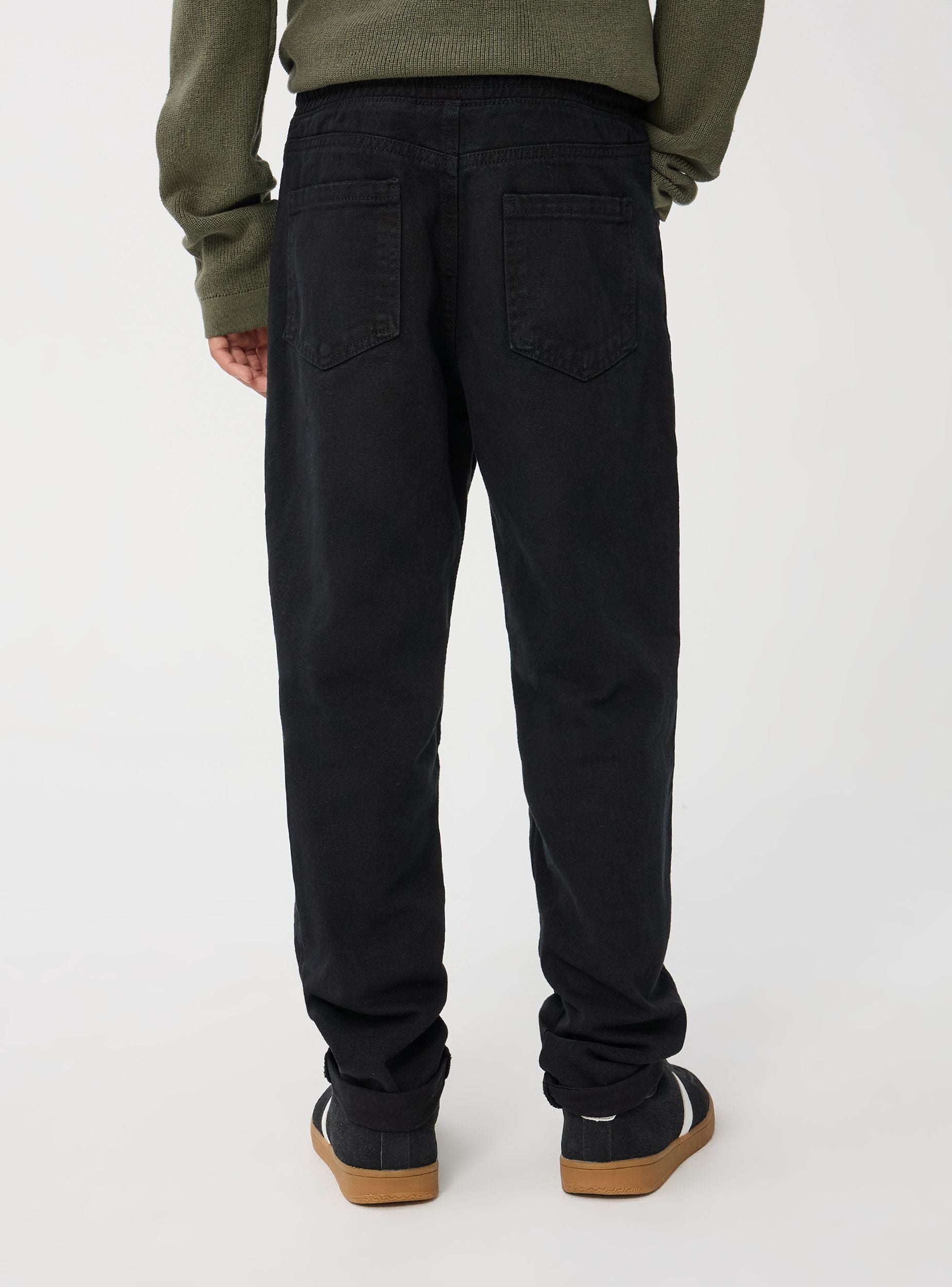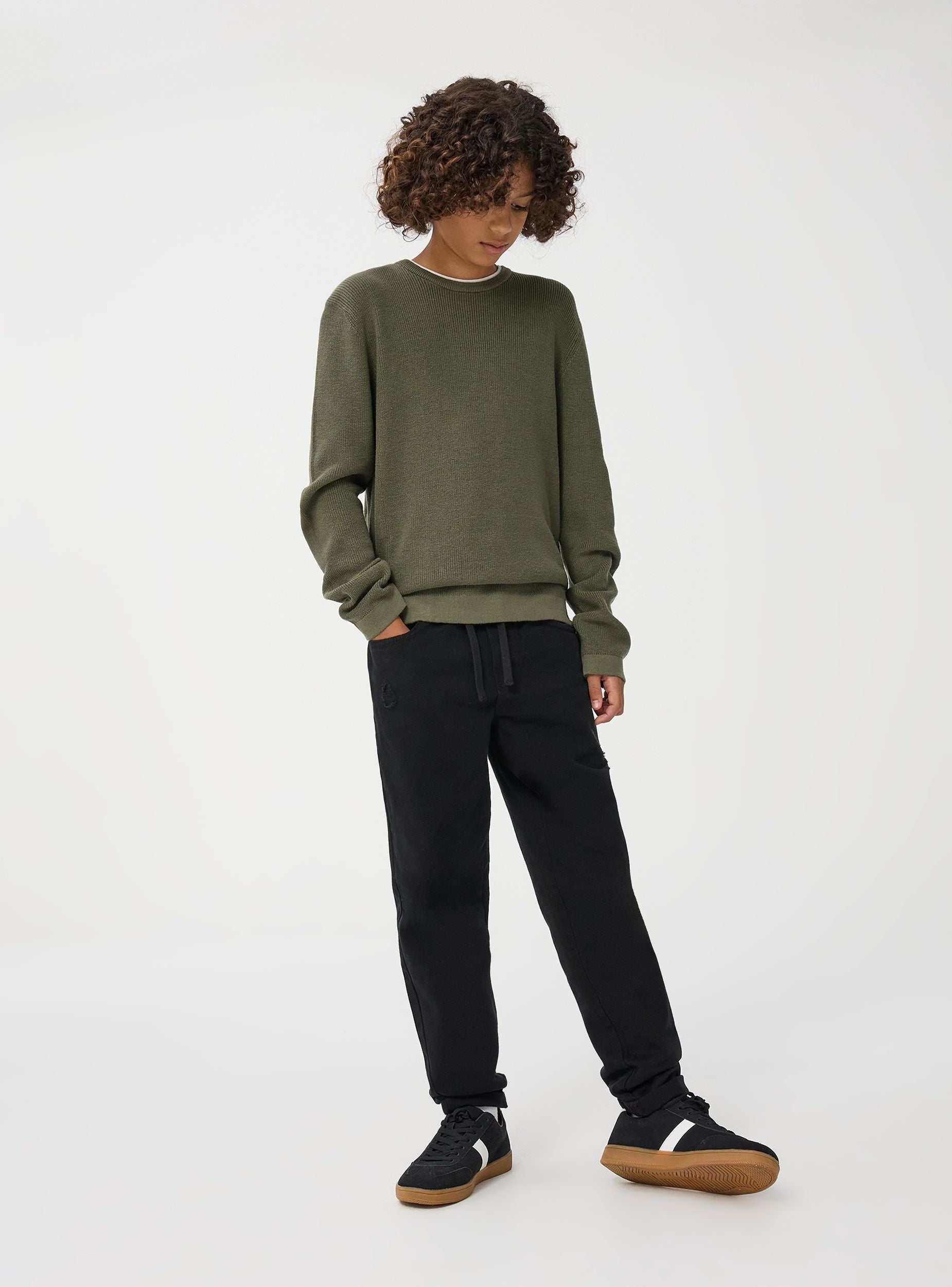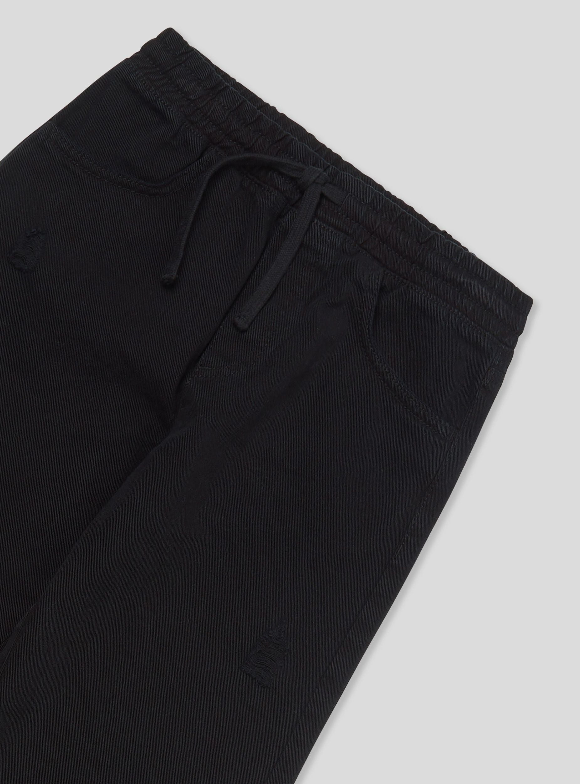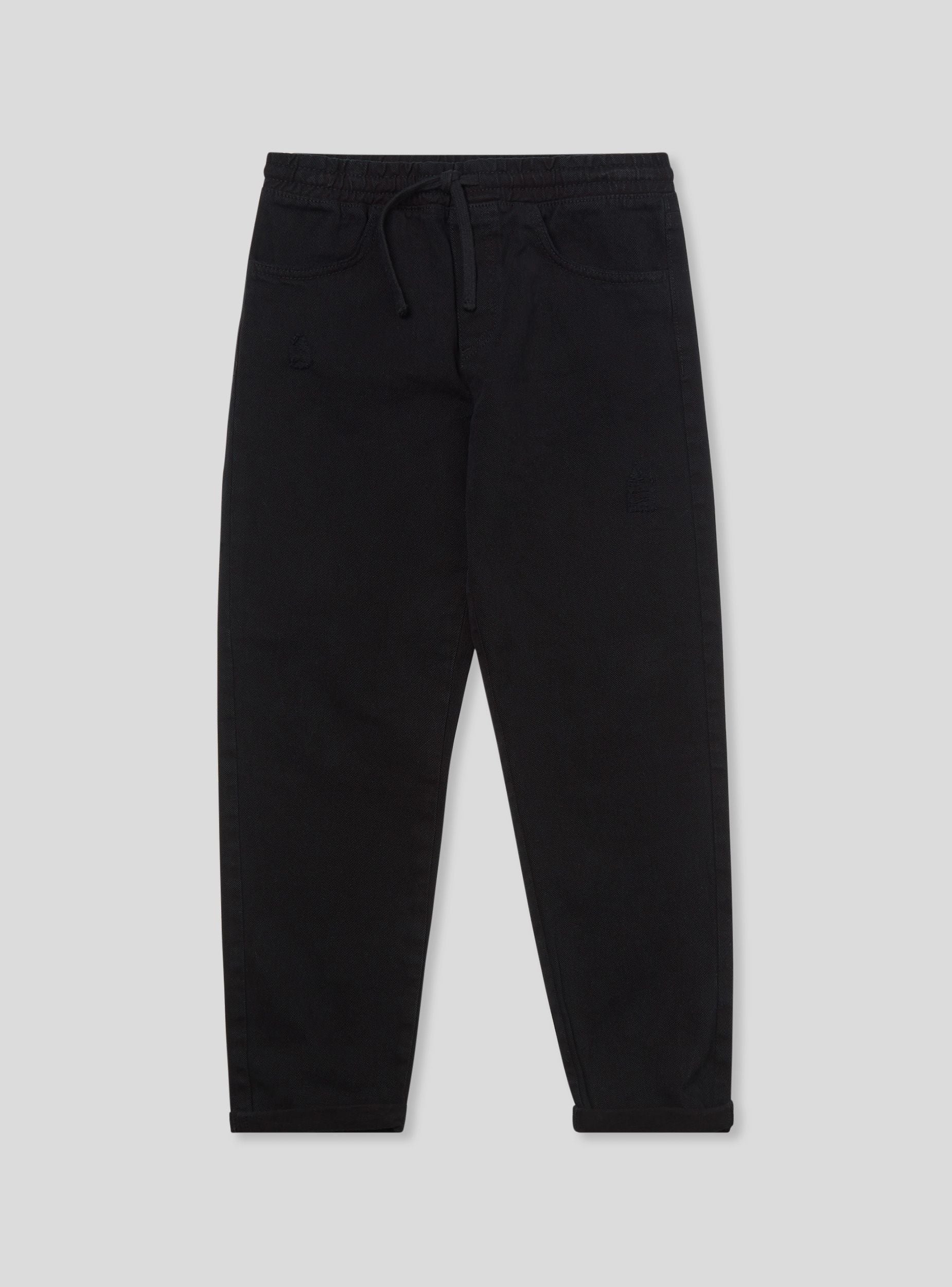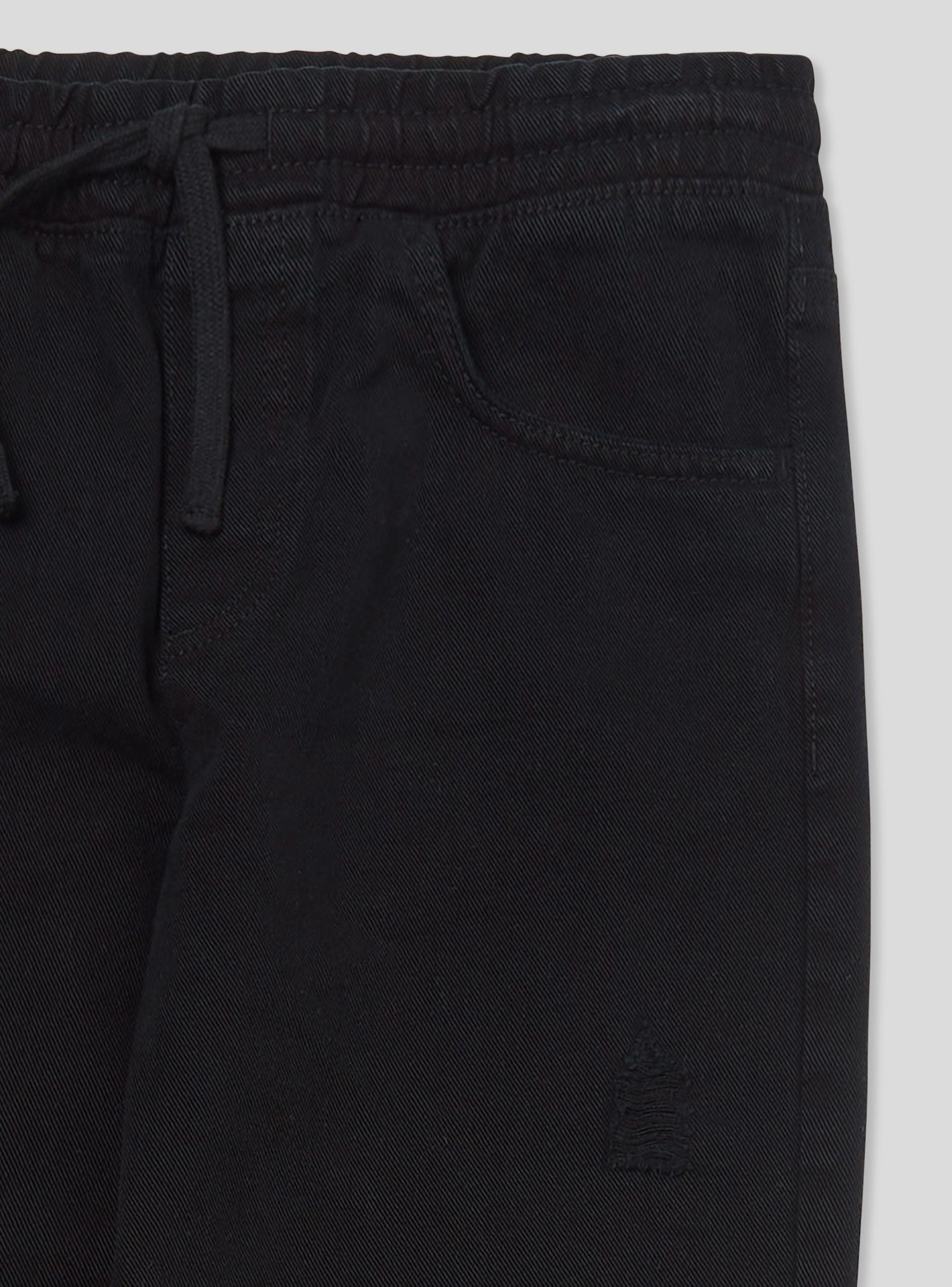 Pantaloni da bambino, modello jogger, realizzati in tessuto drill di cotone a tinta unita. Dotati di coulisse in vita, ideale per regolarne la vestibilità. Presentano un leggero effetto strappato per aggiungere un tocco di stile all'outfit. Dotati due due tasche laterali frontali e due tasche posteriori. Comodi e facili da abbinare.Dettagli