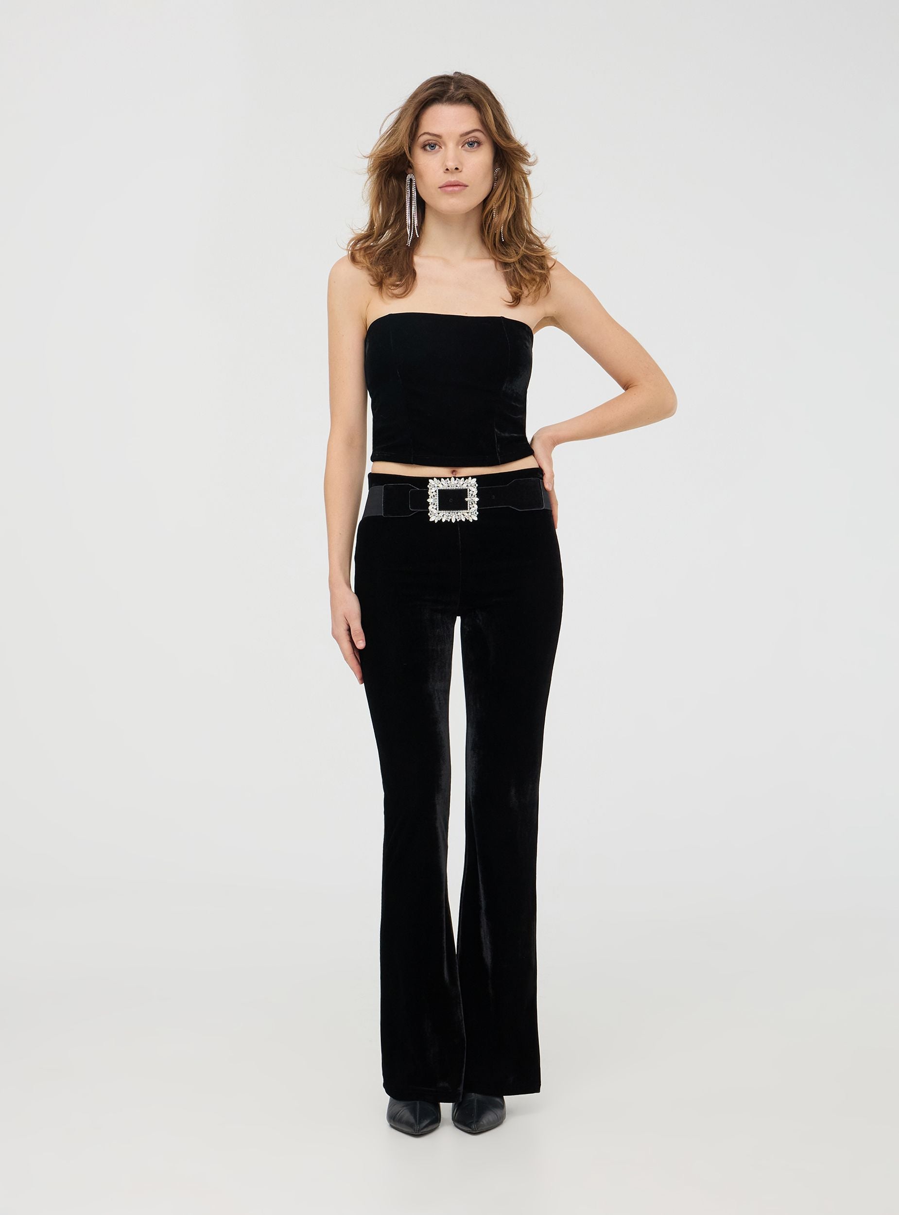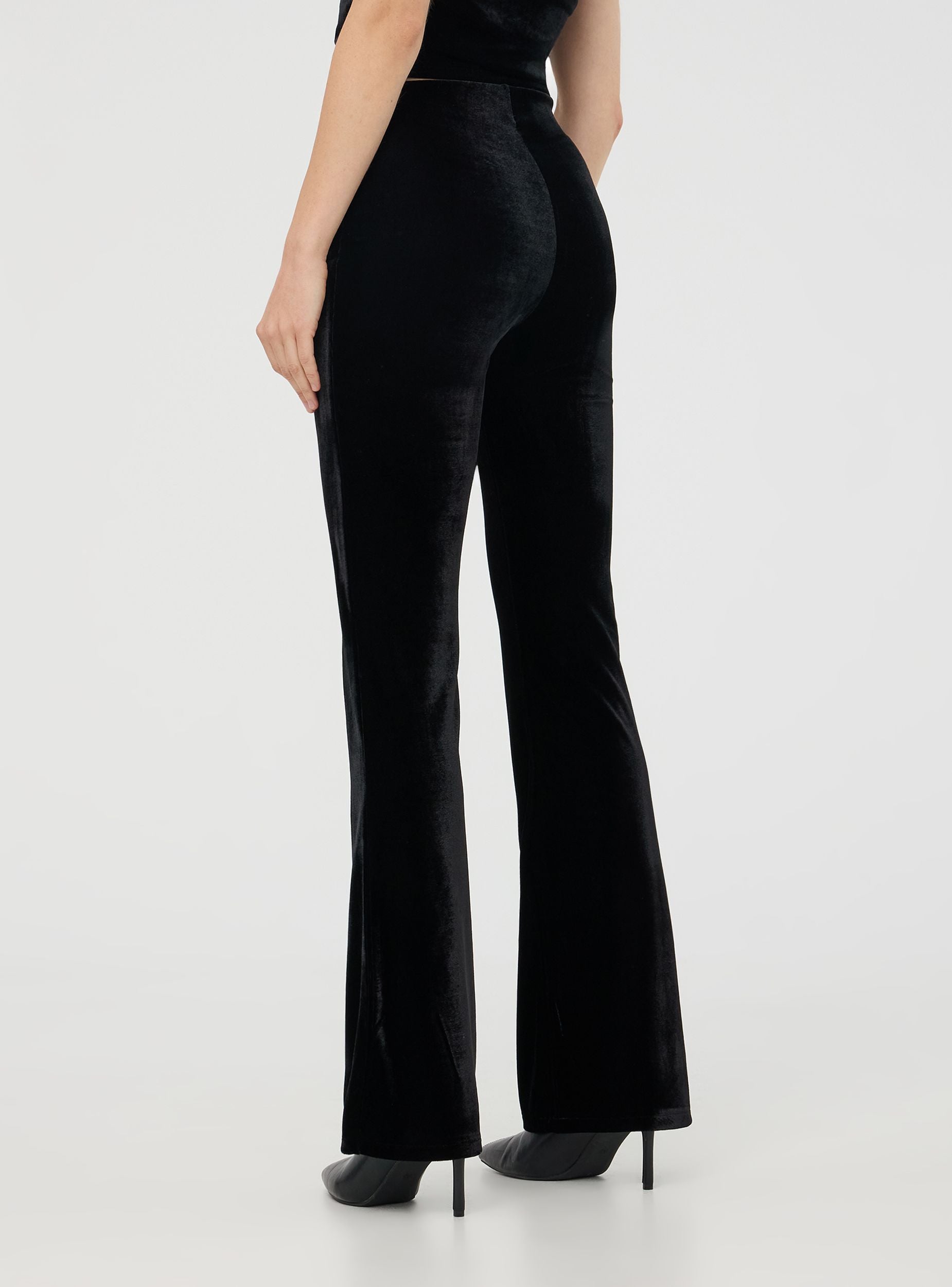 Leggings a zampa in velluto da donna. Questi leggings presentano una vestibilità aderente sui fianchi e sulle cosce, che si allarga gradualmente verso il fondo creando un effetto a zampa. Questi leggings sono ideali per un look audace e glamour, adatti sia per occasioni casual che per occasioni skinspeciali.Dettagli