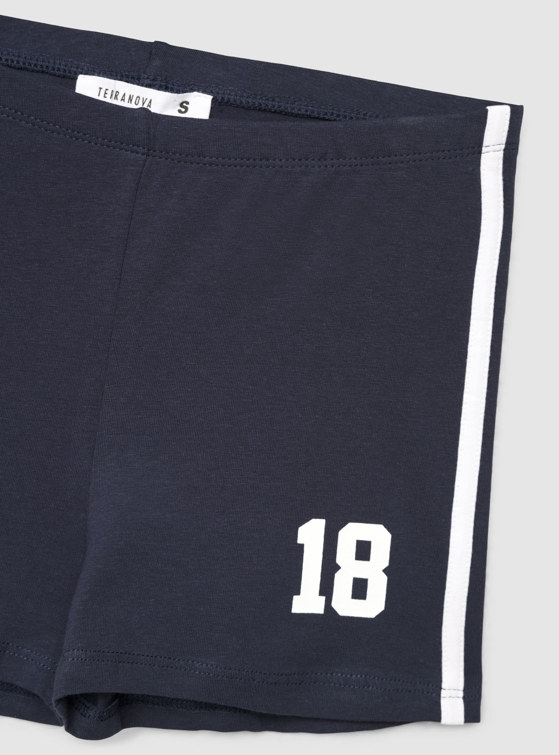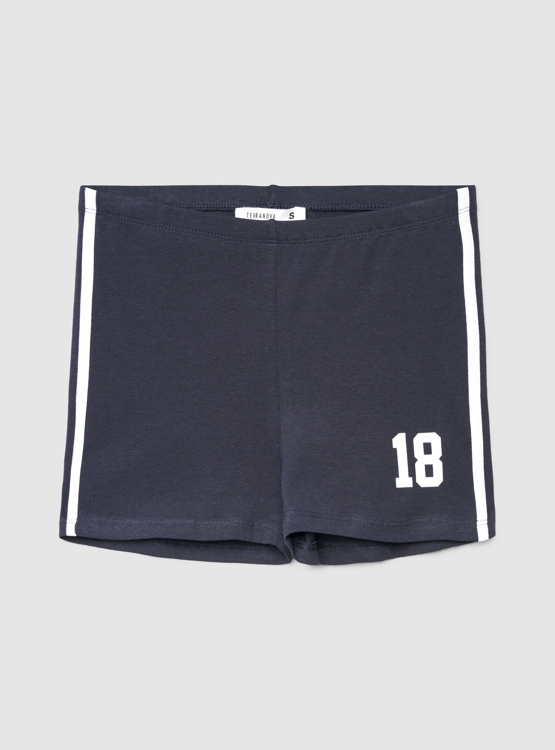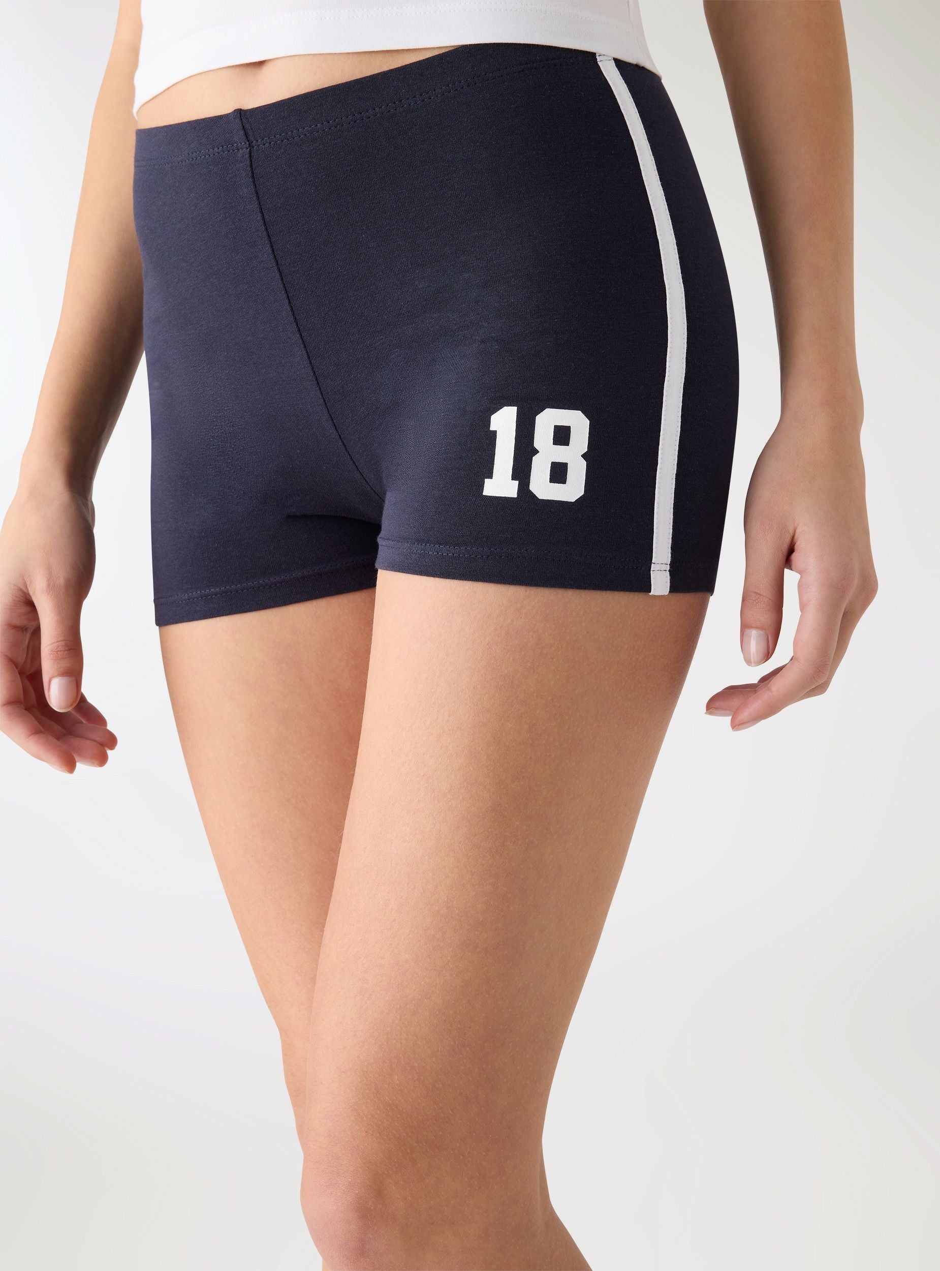 Leggings corti da donna elasticizzati con ispirazione college. Modello a vita media con fascia in maglia e vestibilità aderente, dettagli a bande laterali a contrasto e numero stampato sul fondo. Ideali per allenamento leggero, tempo libero o look sporty con felpa e sneakers. Lunghezza corta sopra il ginocchio, senza tasche e senza chiusura, facile da indossare grazie alla struttura confortevole.Dettagli